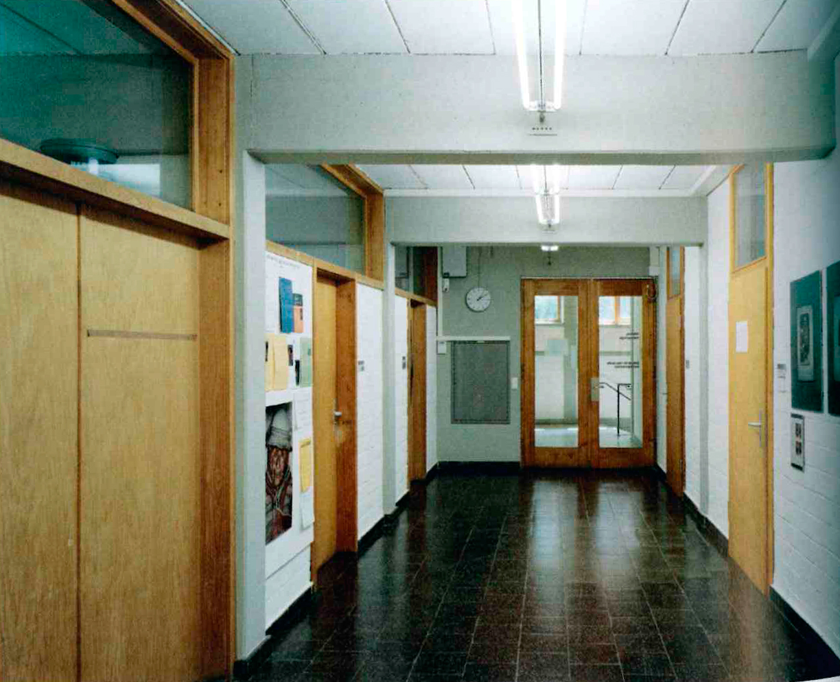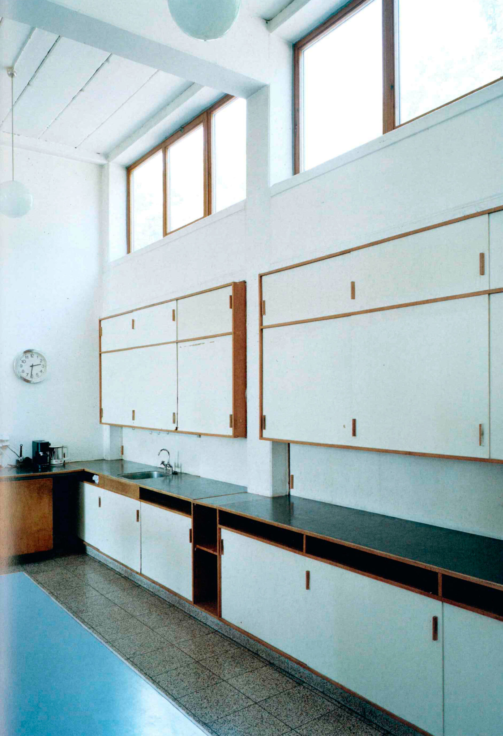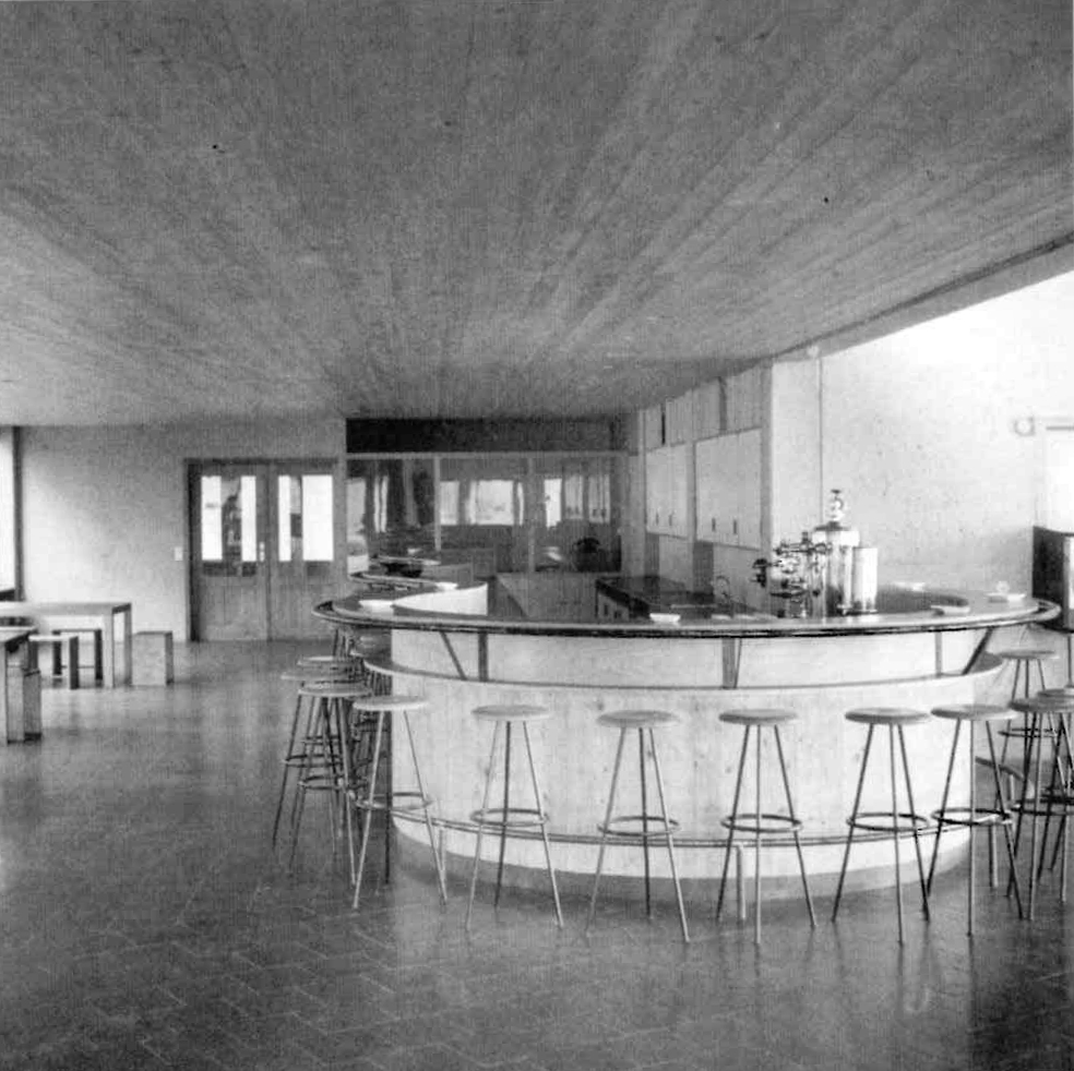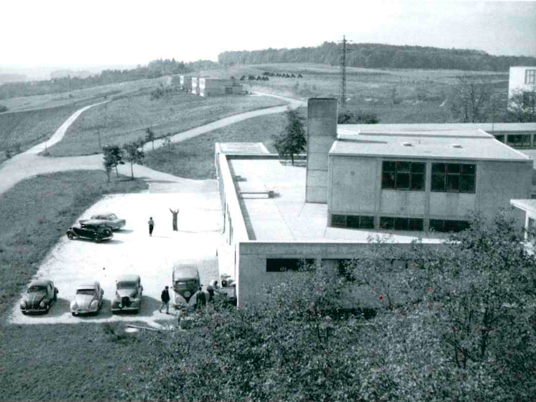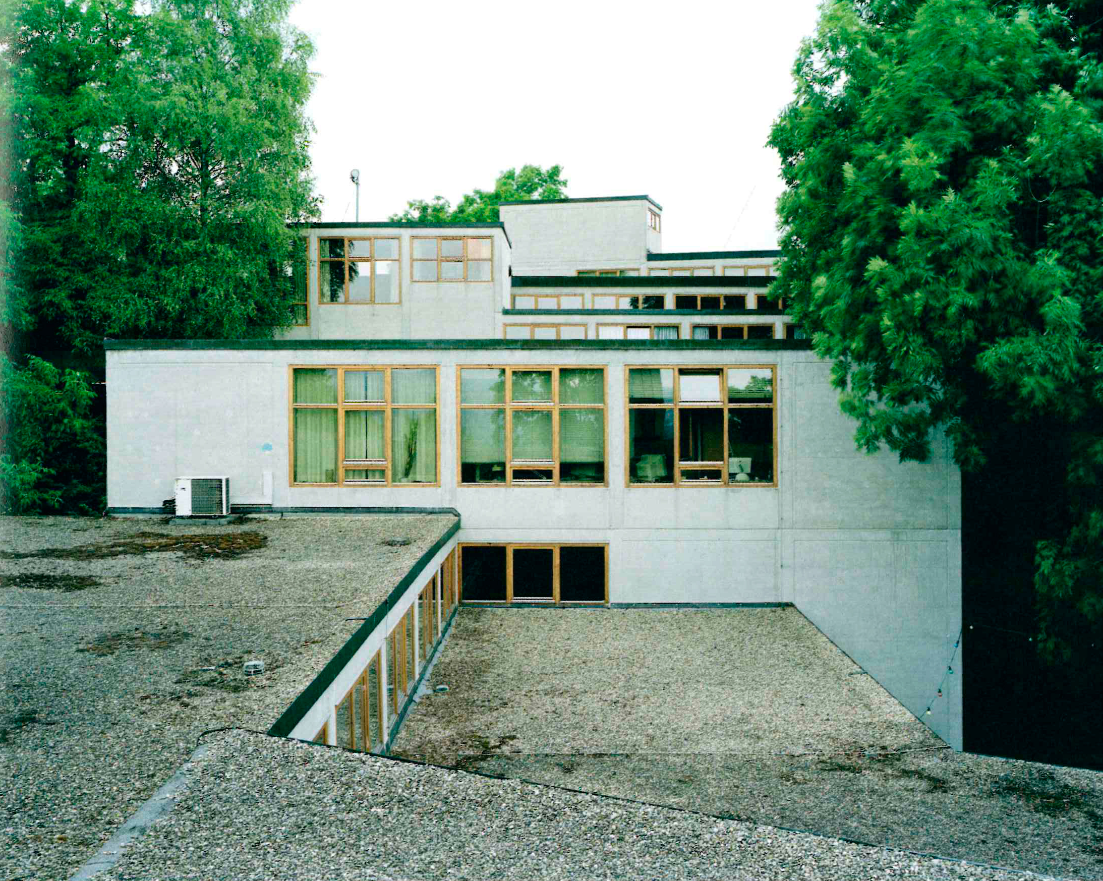 En el proyecto de ejecución definitivo (primera fase de 1953 a 1955) se yuxtaponen una estructura orgánica y la estrictamente racional, generando, de este modo, un conjunto unitario. El complejo se extiende como una columna vertebral y sigue las curvas de nivel conectando todos los elementos en un único organismo. Al contrario que los volúmenes ortogonales, esta espina dorsal posee una forma propia. Primera forma el estrecho corredor que perfora los volúmenes de la hilera de construcciones que albergan los estudios y, posteriormente, funciona como una pérgola abierta o como una estancia exterior cónica. La denominada “hoja de sierra” (cuyo nombre proviene de la planta cuadrada y la sección de las escaleras) es el elemento más llamativo y, en cierta medida, el más emblemático del conjunto: es la estancia central del edificio principal, alrededor del cual se agrupan las distintas aulas y salas de reunión, confiriendo forma y direccionalidad al exterior.