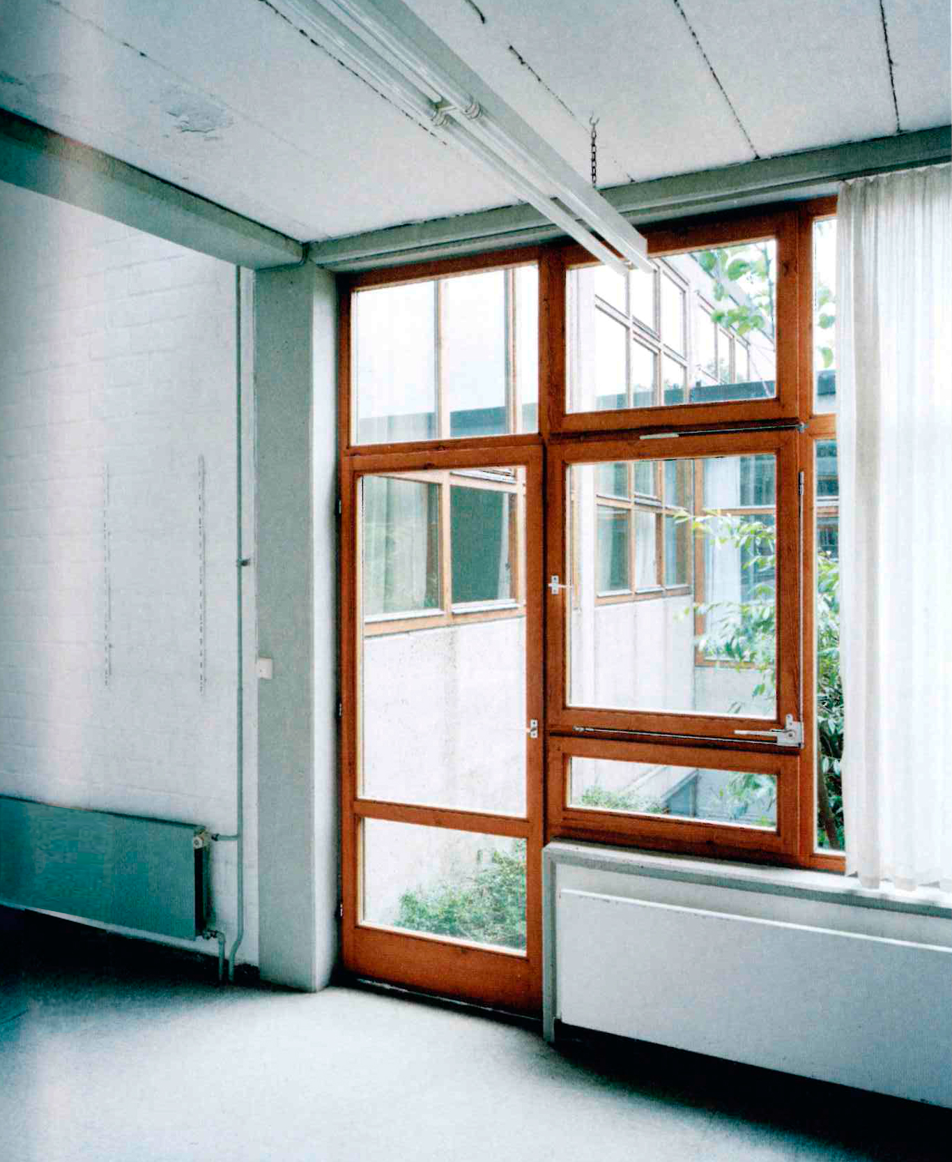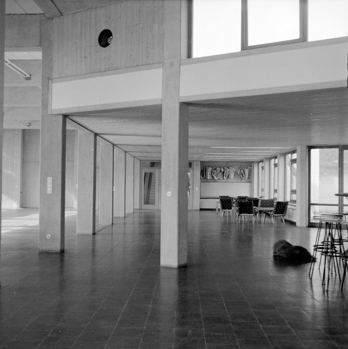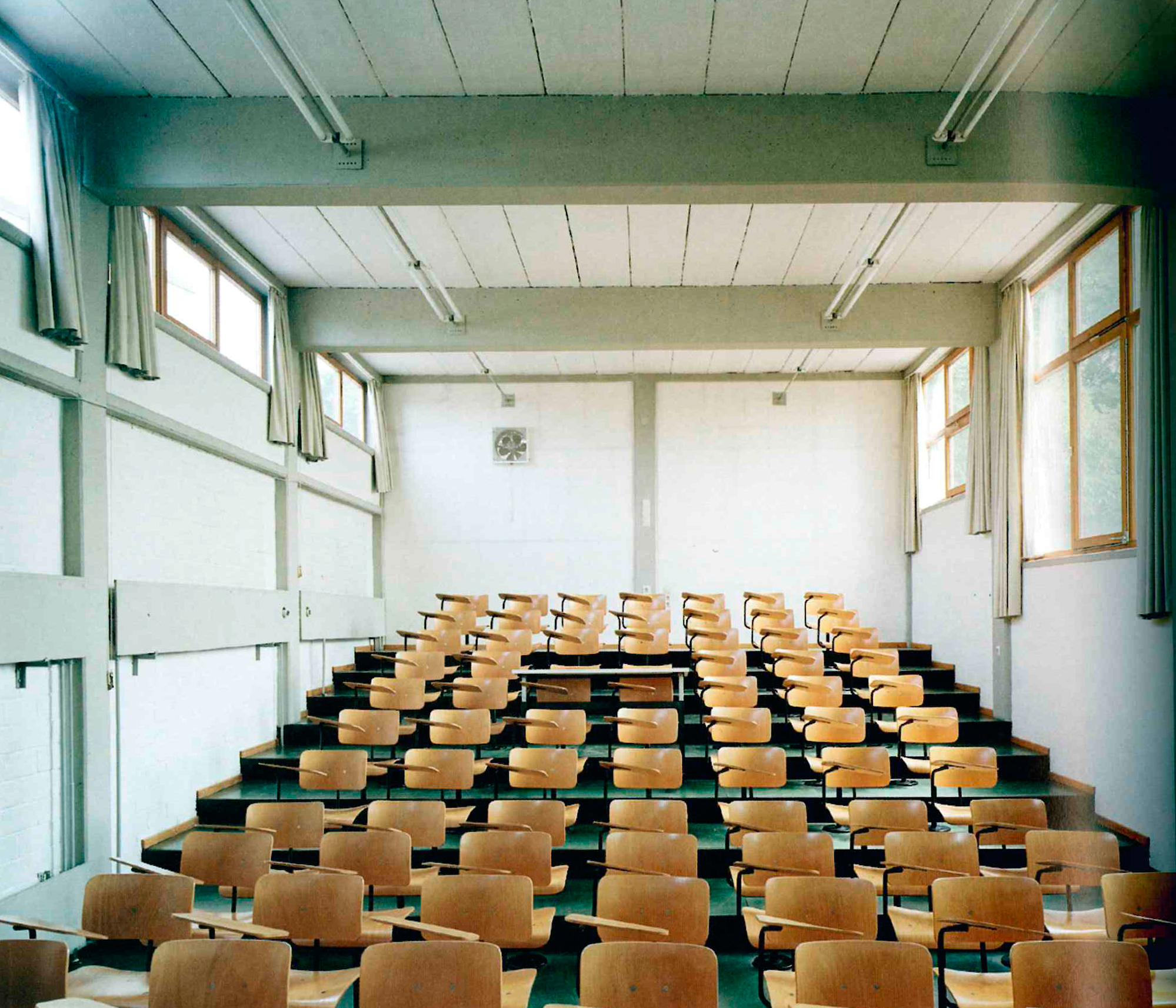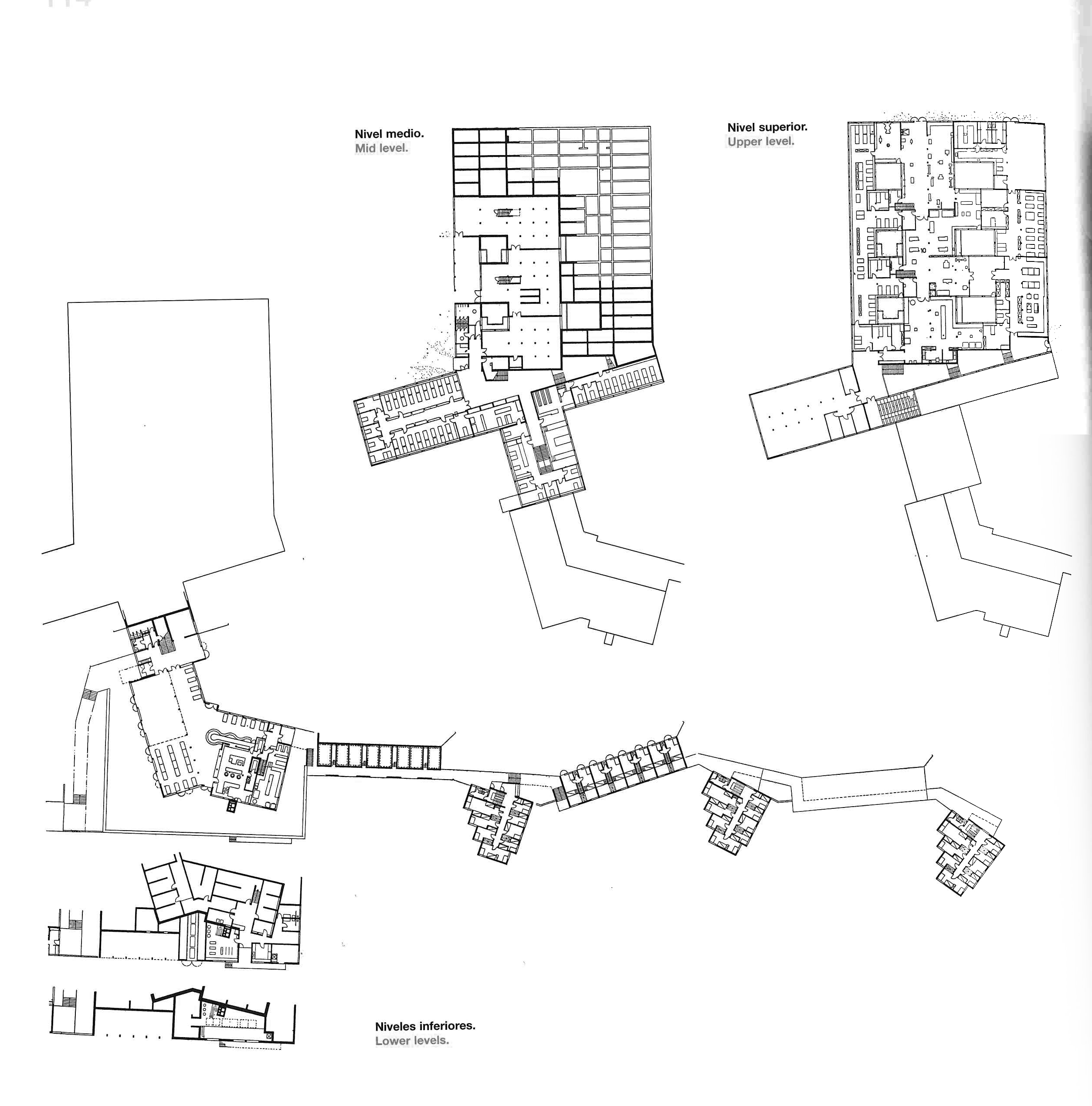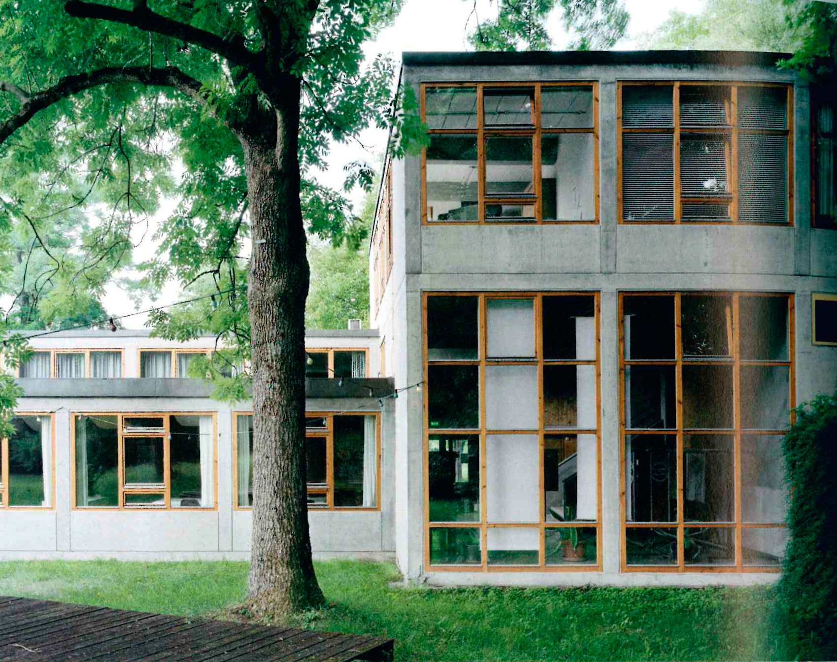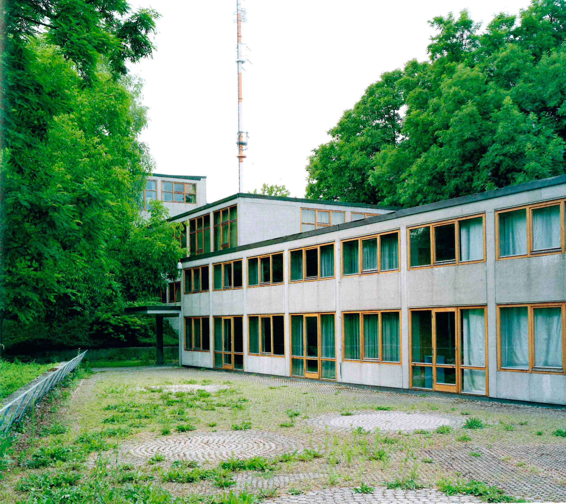 En el proyecto de ejecución definitivo (primera fase de 1953 a 1955) se yuxtaponen una estructura orgánica y la estrictamente racional, generando, de este modo, un conjunto unitario. El complejo se extiende como una columna vertebral y sigue las curvas de nivel conectando todos los elementos en un único organismo. Al contrario que los volúmenes ortogonales, esta espina dorsal posee una forma propia. Primera forma el estrecho corredor que perfora los volúmenes de la hilera de construcciones que albergan los estudios y, posteriormente, funciona como una pérgola abierta o como una estancia exterior cónica. La denominada “hoja de sierra” (cuyo nombre proviene de la planta cuadrada y la sección de las escaleras) es el elemento más llamativo y, en cierta medida, el más emblemático del conjunto: es la estancia central del edificio principal, alrededor del cual se agrupan las distintas aulas y salas de reunión, confiriendo forma y direccionalidad al exterior.