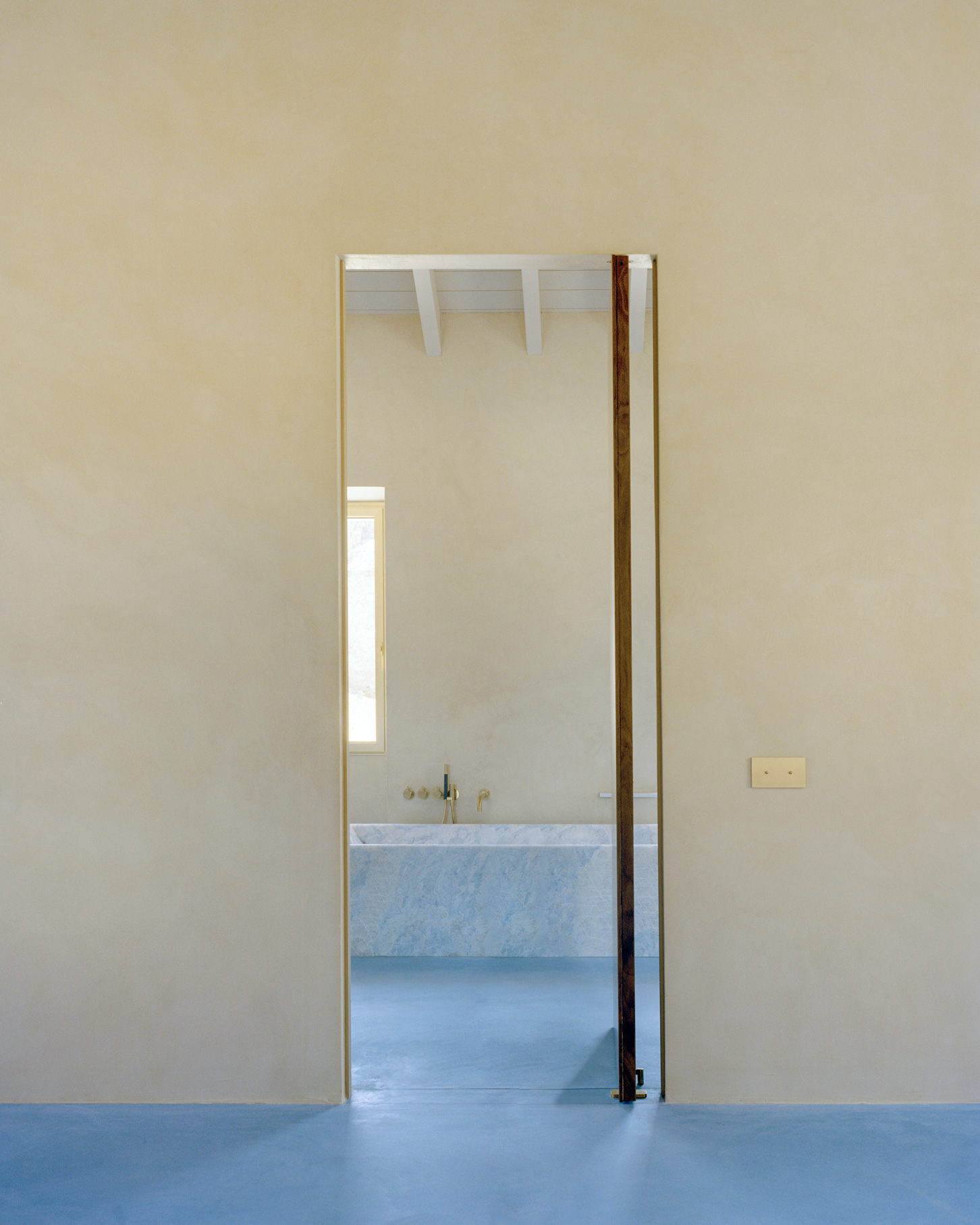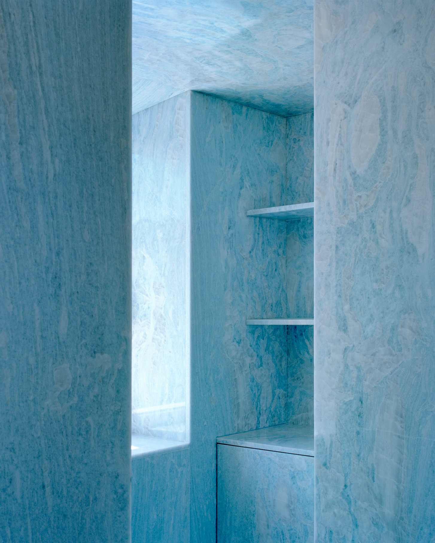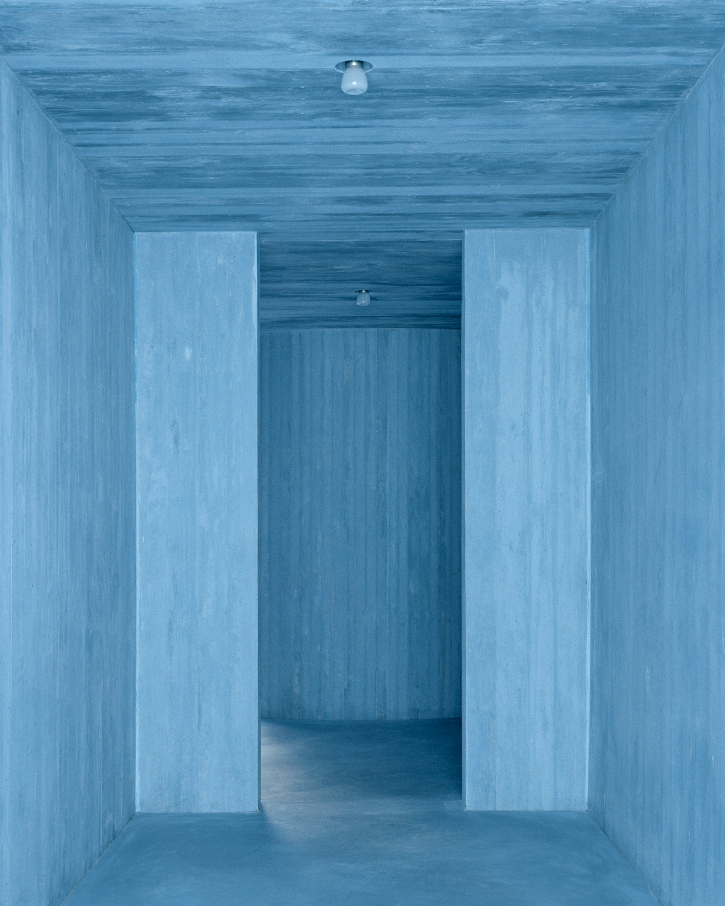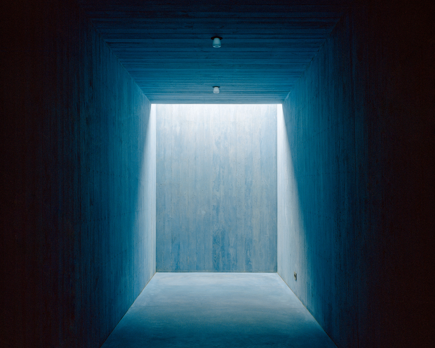 Regulations prohibited alterations to the overall volume and restricted significant changes to the façades and roof. Once the preexisting structure was completely emptied, leaving only the perimeter walls, a new body of blue-pigmented concrete was embedded within. This structure rises from the basement, where the cellar is located, ascends via a helical staircase, and extends to form the floor slabs of the upper levels, culminating on the first floor beneath a skylight that floods the central void with natural light.