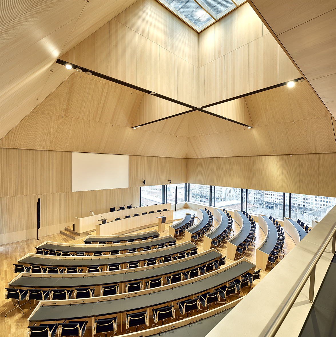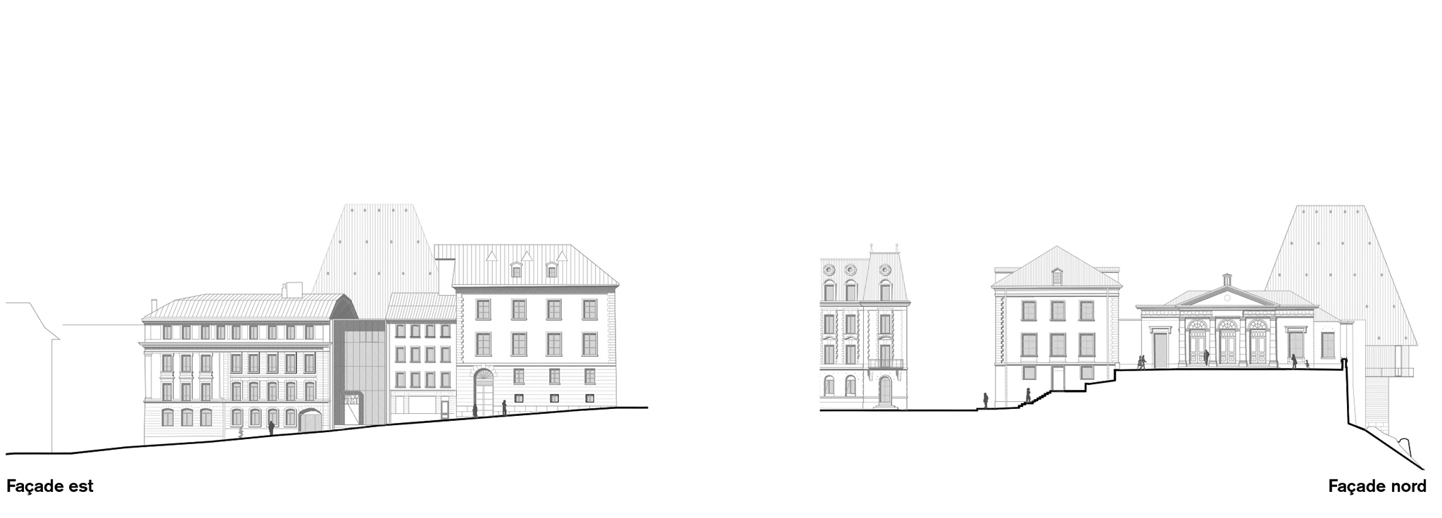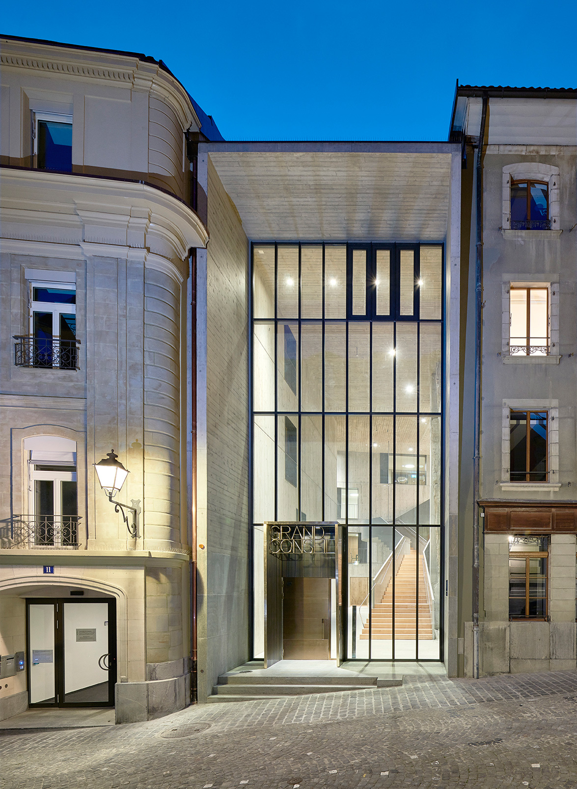 Para resolver uno de los desafíos arquitectónicos del encargo: aumentar la volumetría de la sala del Grand Conseil para adecuarla a las nuevas necesidades parlamentarias, se han utilizado innovadores conceptos constructivos y tecnológicos. En concreto, la planta de la sala gana en superficie al desbordar en voladizo los muros de cimentación históricos y se abre en dos de sus fachadas a las vistas sobre la ciudad, el lago Leman y los Alpes. Además, se ha pretendido que la cubierta, más allá de un carácter funcional, adquiriese la suficiente representatividad para encajar el edificio en el espacio urbano de la Cité, entre el viejo castillo y la catedral. Para ello, ésta se ha diseñado con una forma piramidal que permite el confort ambiental a través de su lucernario cenital y su climatización se basa en el principio de ventilación de los termiteros.