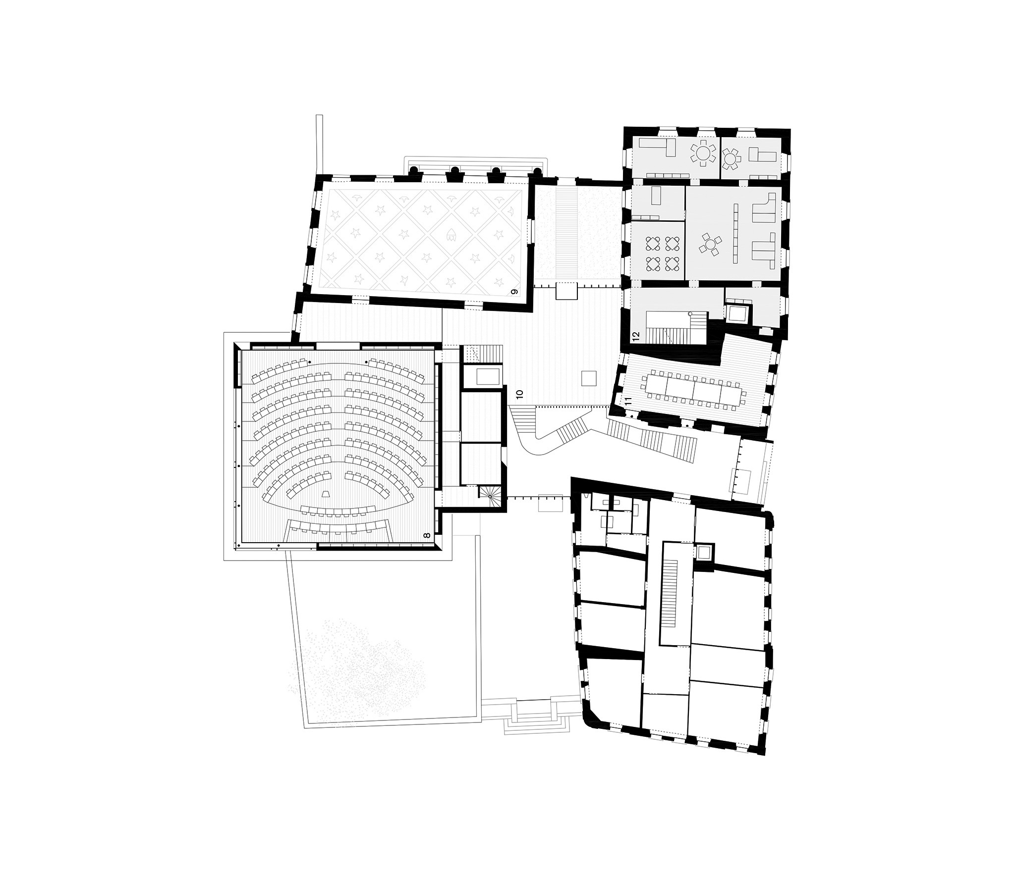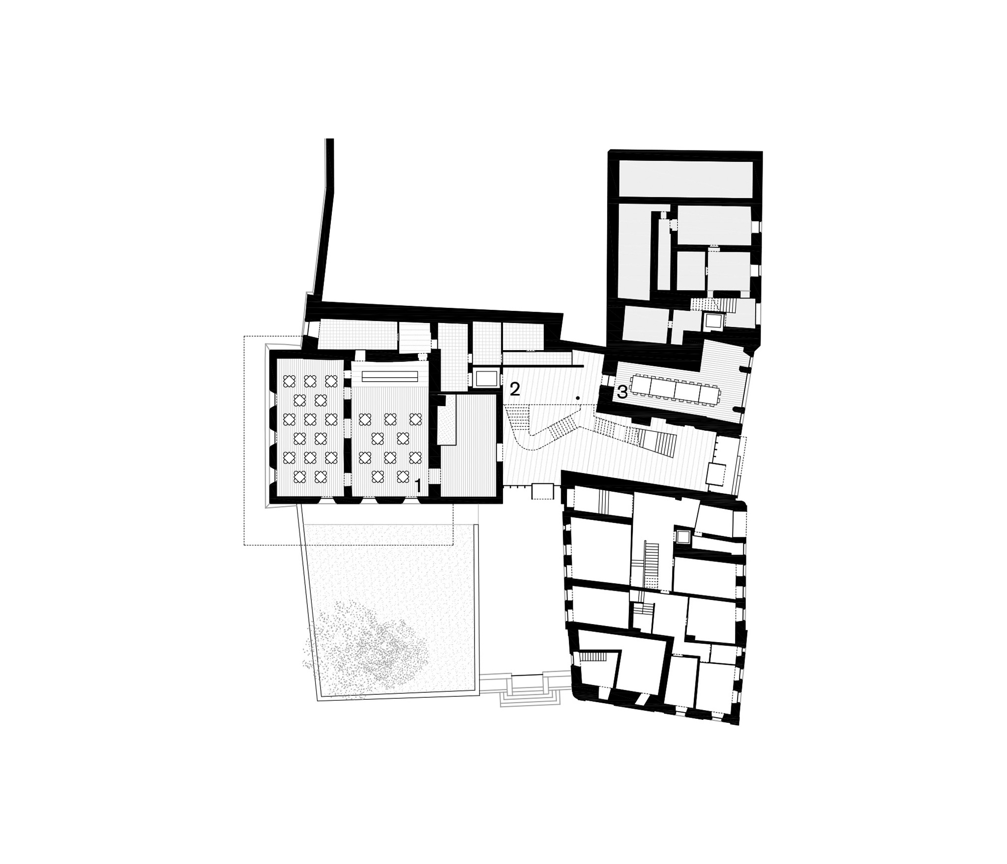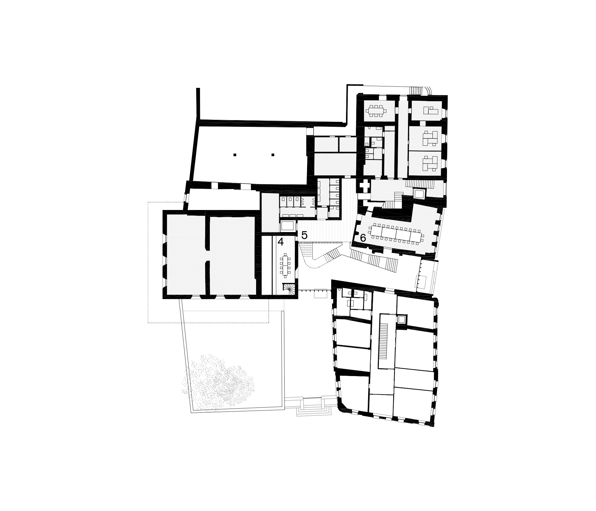 Por su parte, el descubrimiento de unas ruinas históricas en uno de los muros que delimitan el hall de acceso, ha conllevado la reubicación y el rediseño de la escalera que comunica con las diferentes plantas. Ésta, realizada en acero y madera, recorre el espacio de triple altura, y se pliega para formar un mirador. Su contundencia visual disminuye al colgar su estructura de un solo tirante. Y por último, la sala des pas-perdus, nombre que reciben los vestíbulos con carácter de espacio de reunión y tránsito en los edificios públicos, donde se ha reconstruido el antiguo pavimento de piedra y a partir de moldes de hormigón se ha reinterpretado su cubierta.