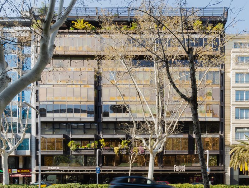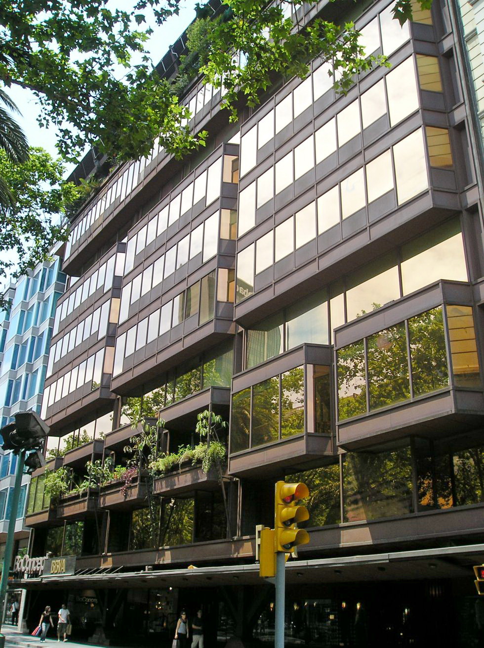 La estructura era utilizada como motivo compositivo de la fachada, mediante una serie de jabalcones metálicos que triangulaban el pórtico frontal en los dos primeros niveles reduciendo a la mitad el número de soportes.