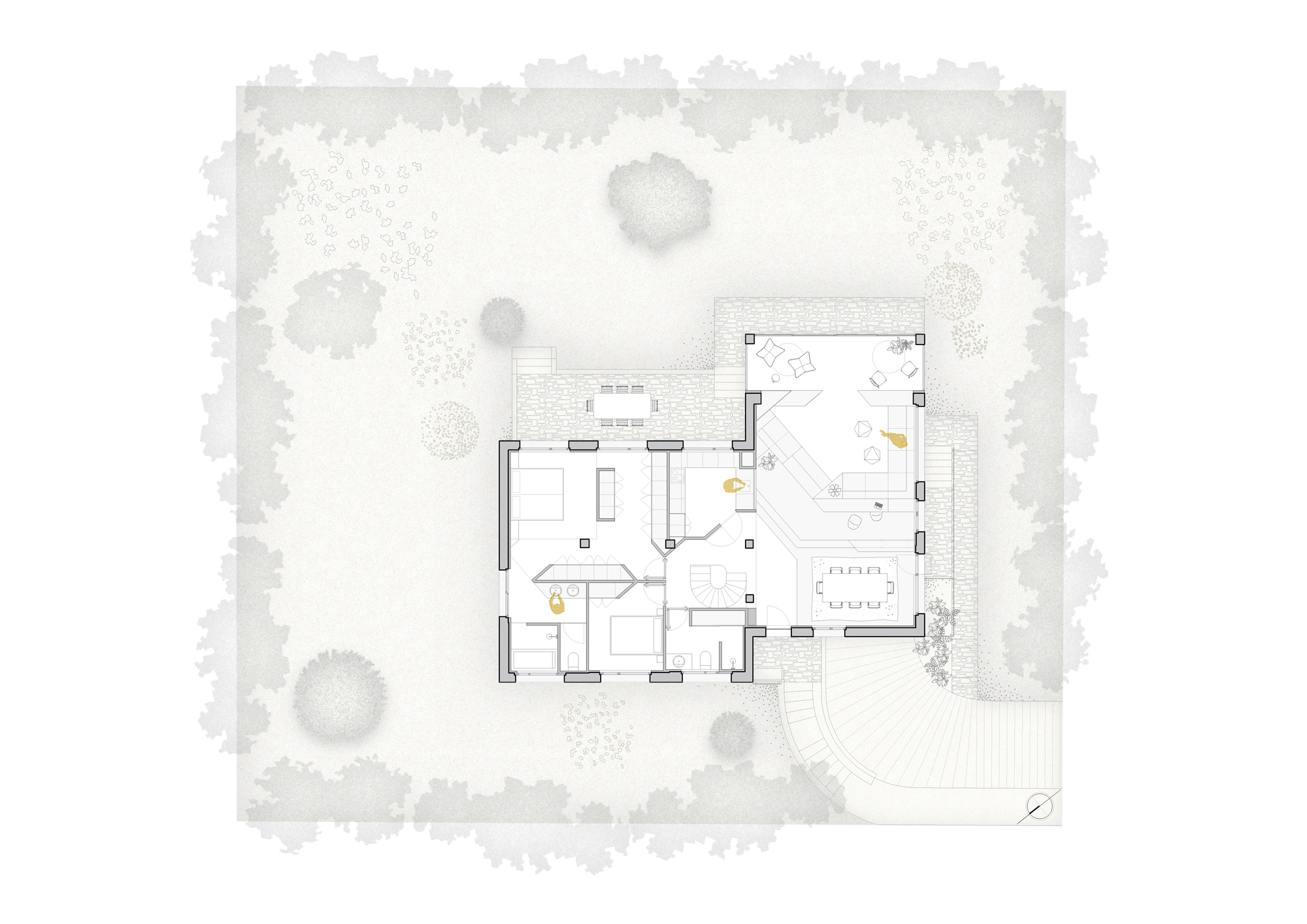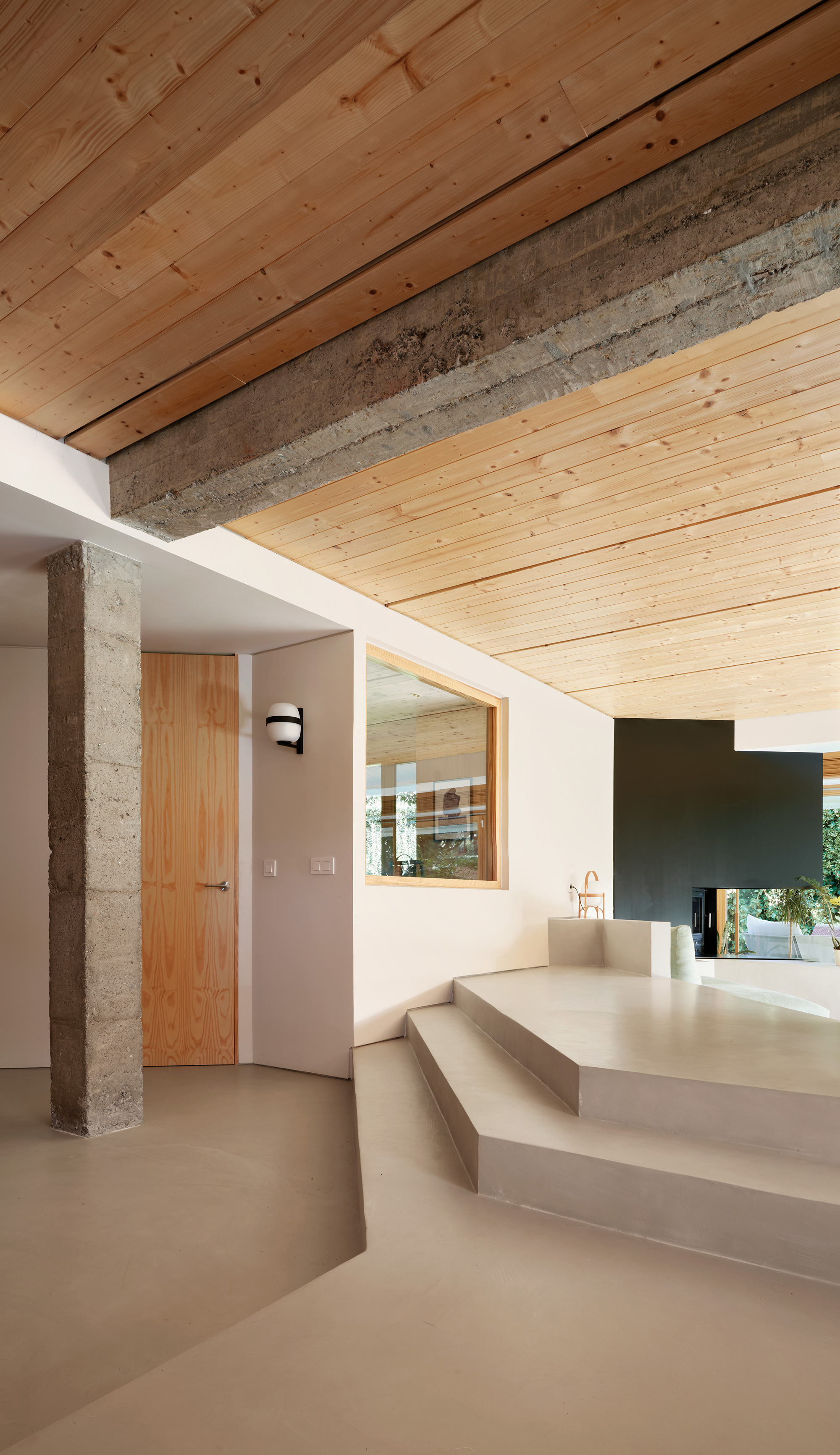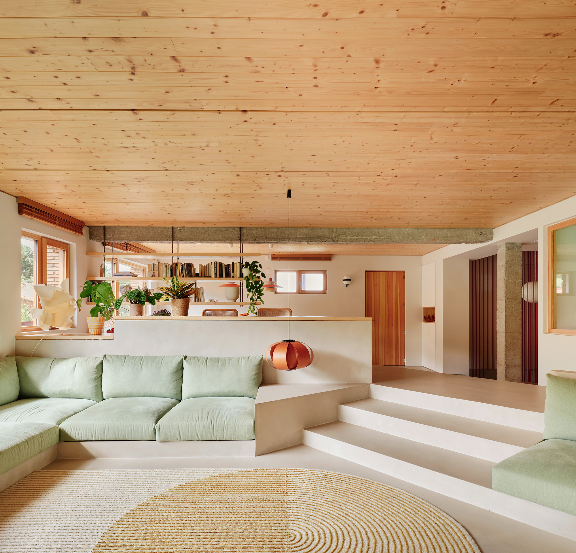 The existing staircase, sensual and slender, serves as a link between this large space and the bedroom area, while also connecting to the lower floor, which is intended for the enjoyment of two young people, as well as accommodating other uses such as a gym, laundry room, garage, etc. This new layout, thanks to its permeability, allows the interior to be completely linked to the exuberantly green exterior space, strengthening the direct link between interior and exterior much more than was originally the case. A house that seeks the warmth of its inhabitants and a feeling of cosiness without closing itself off from its surroundings. A house that tries to maintain the essence of its original architecture without renouncing a different and updated way of living. A house that, while recalling times past, responds to contemporary needs.