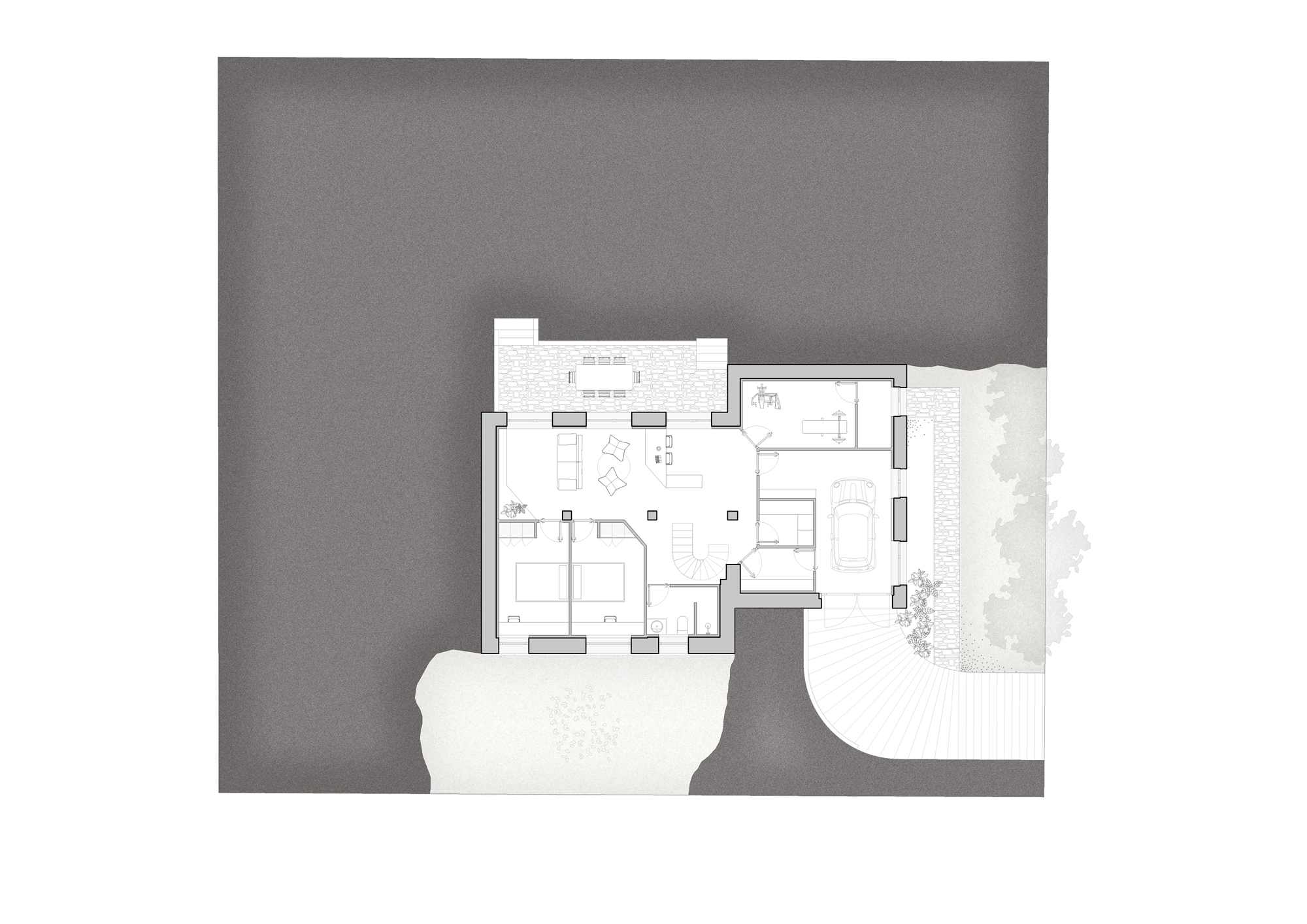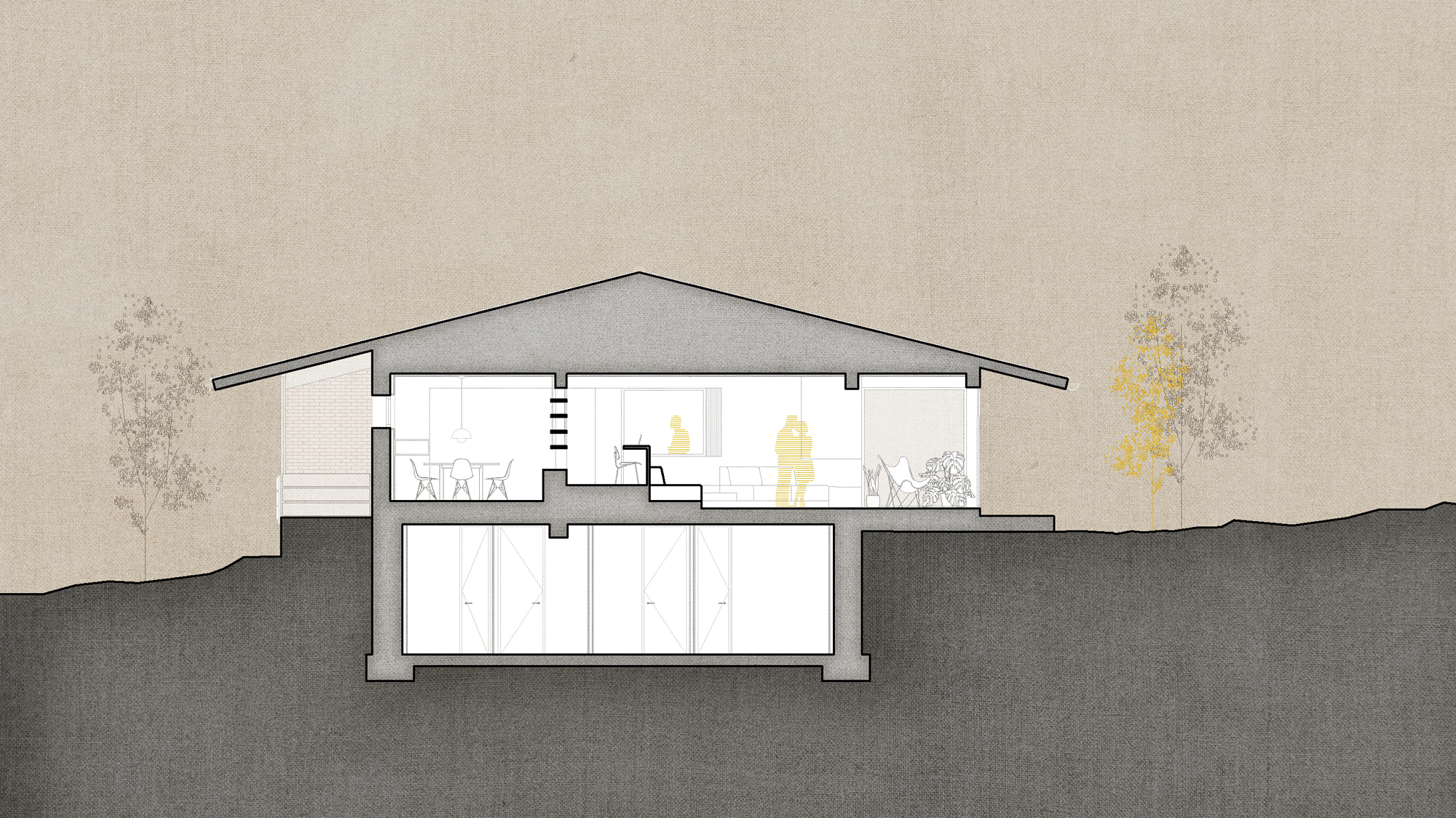 Within this exercise, an intertwined space was proposed where changes in level would configure the different rooms and thus generate sequences of possible processes: from the kitchen to the dining room, from the dining room to the living area through the study, from there to the ‘enclosed porch’ before the covered outdoor area and, finally, to the garden.