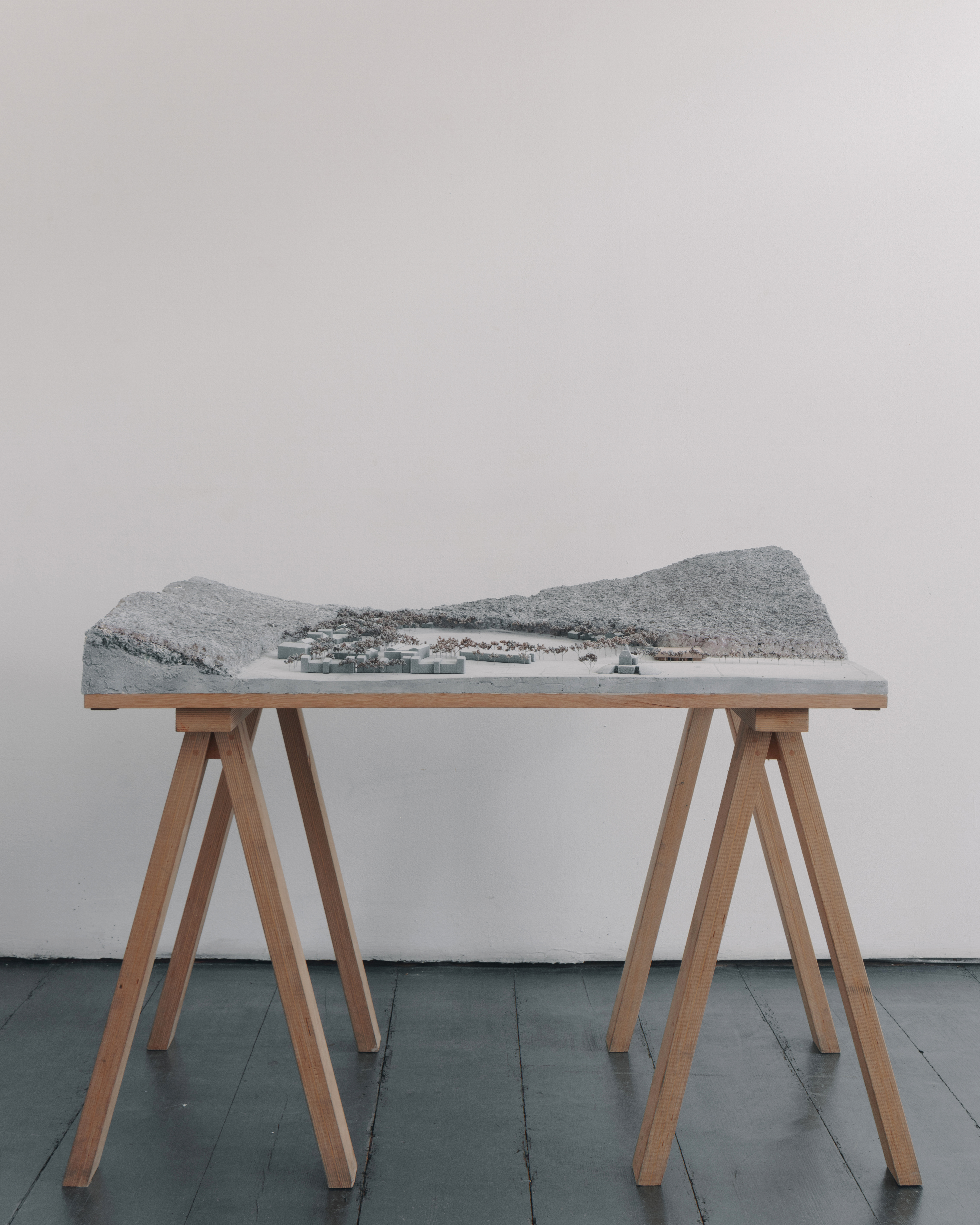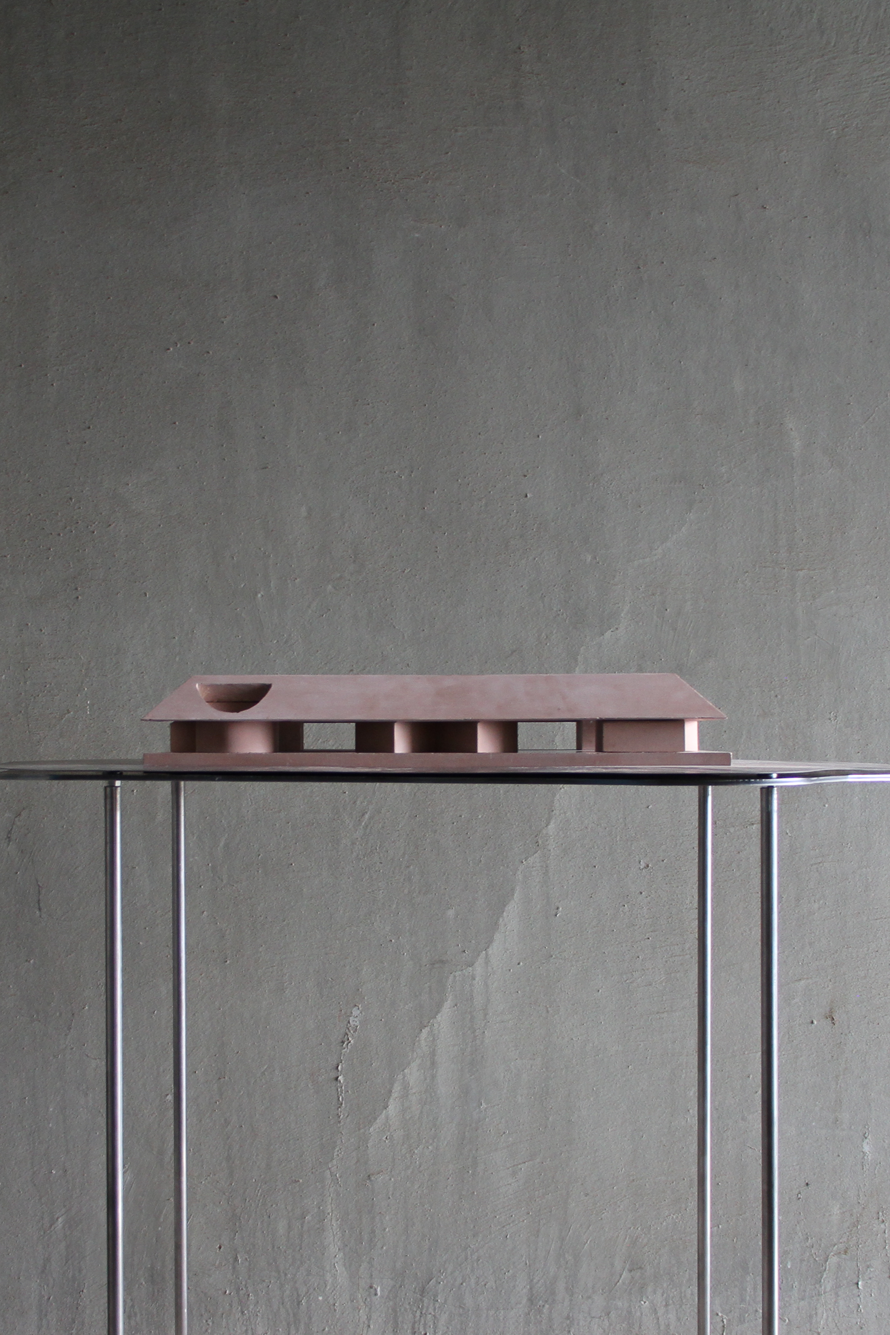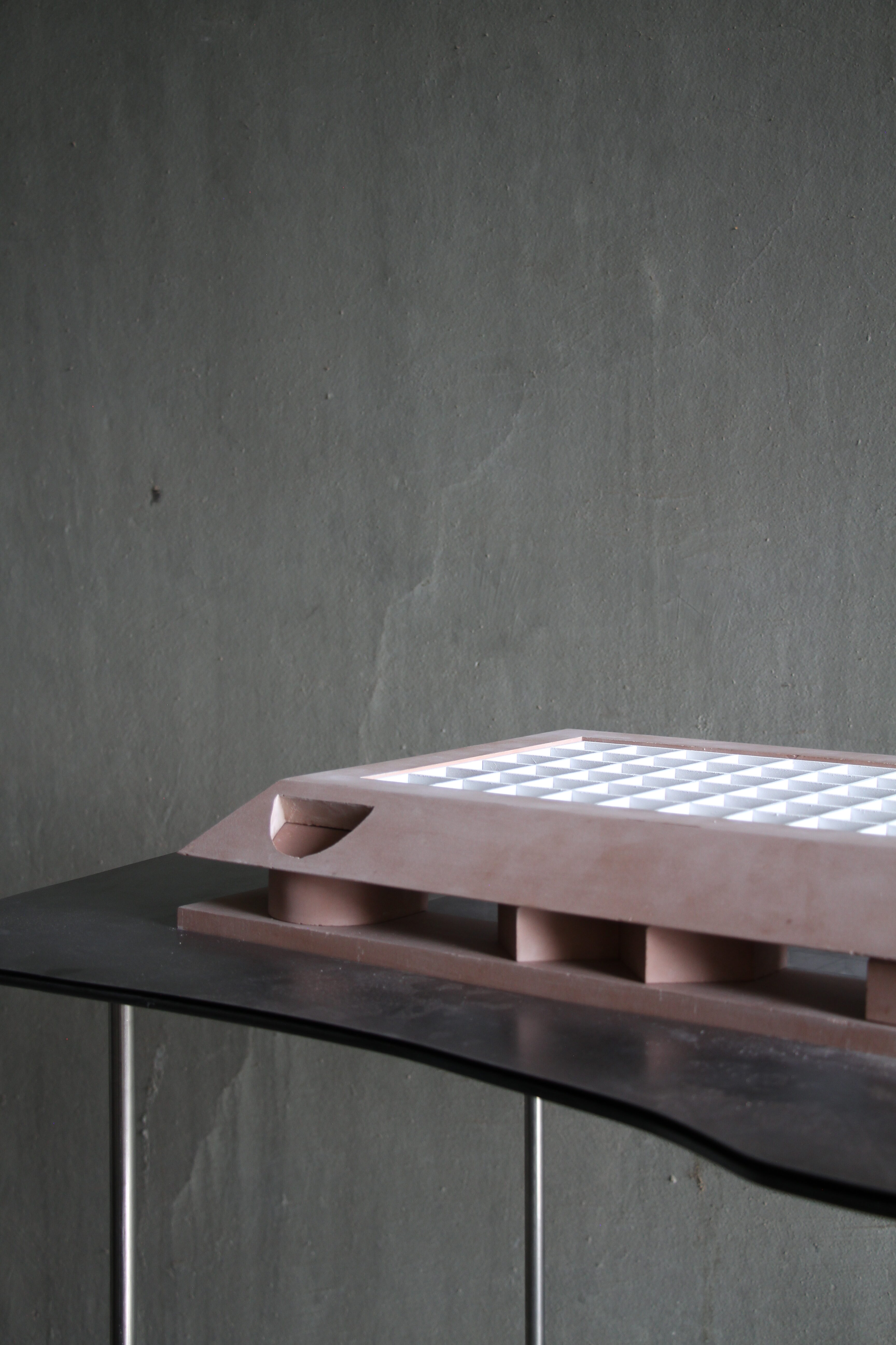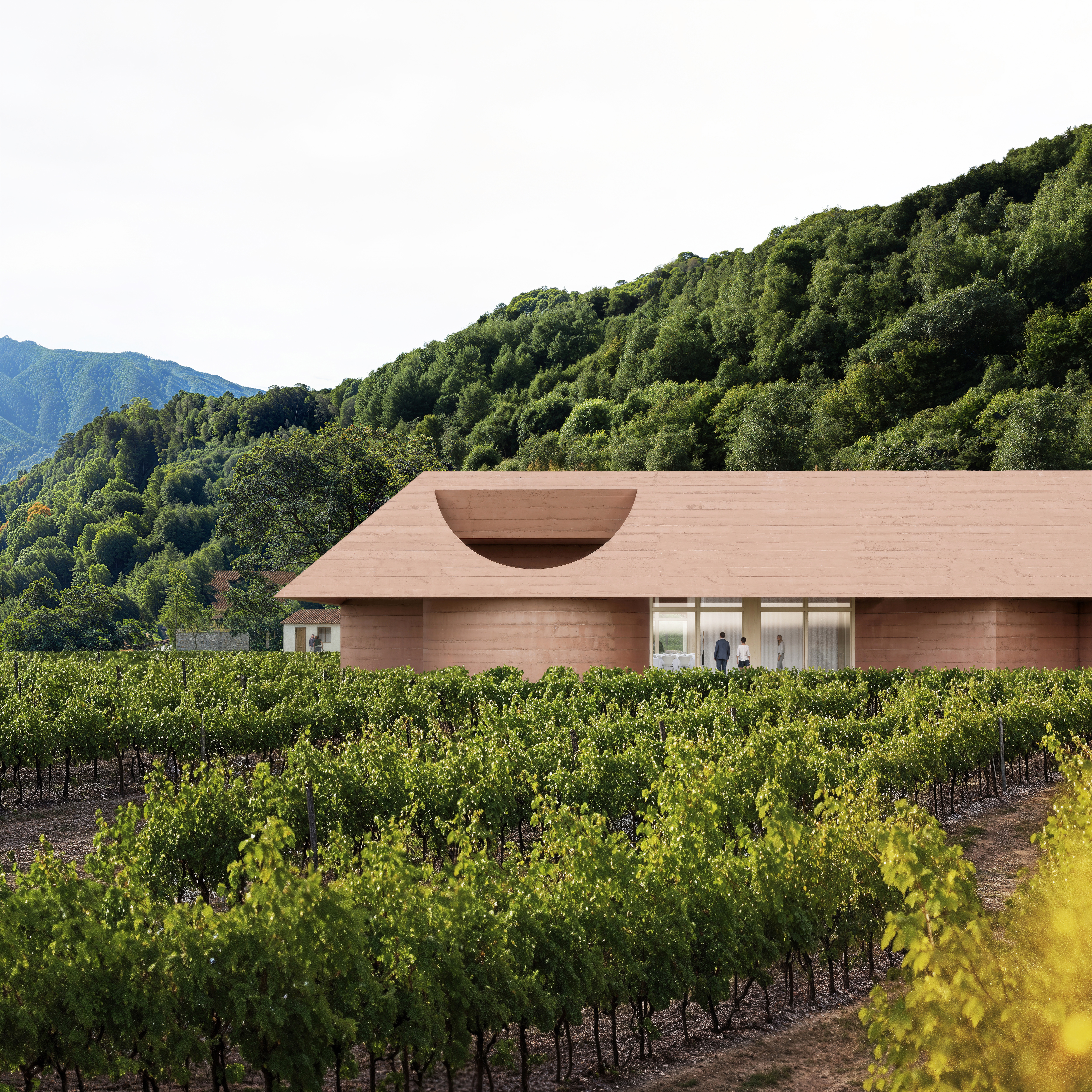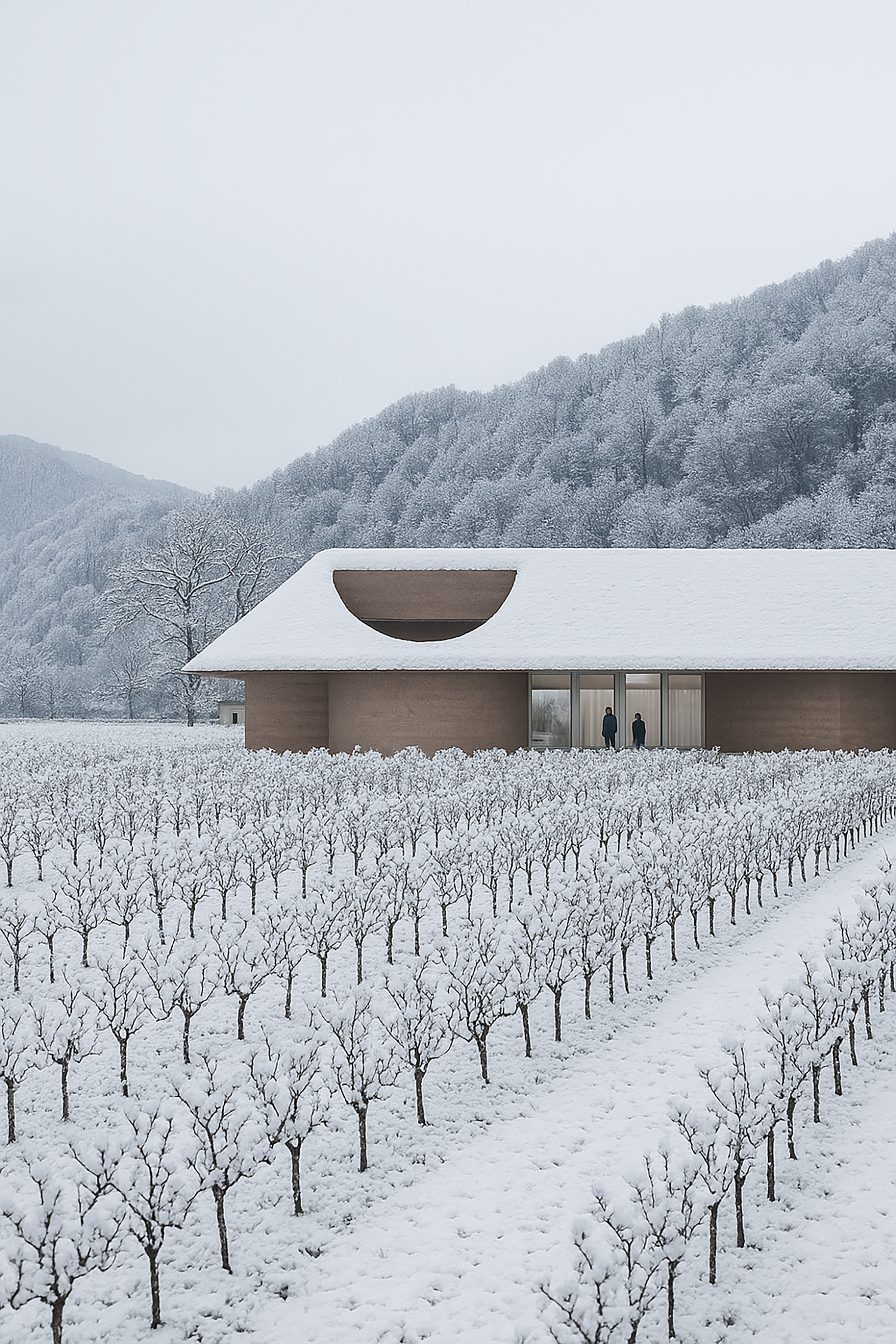 The building is composed of two primary structural elements: reinforced concrete legs supporting the structure and a concrete waffle slab that forms the roof of the hall. The façade is made of pigmented concrete, chosen for its resonance with the rural landscape, surrounding vineyards, and the existing architectural character of the area.