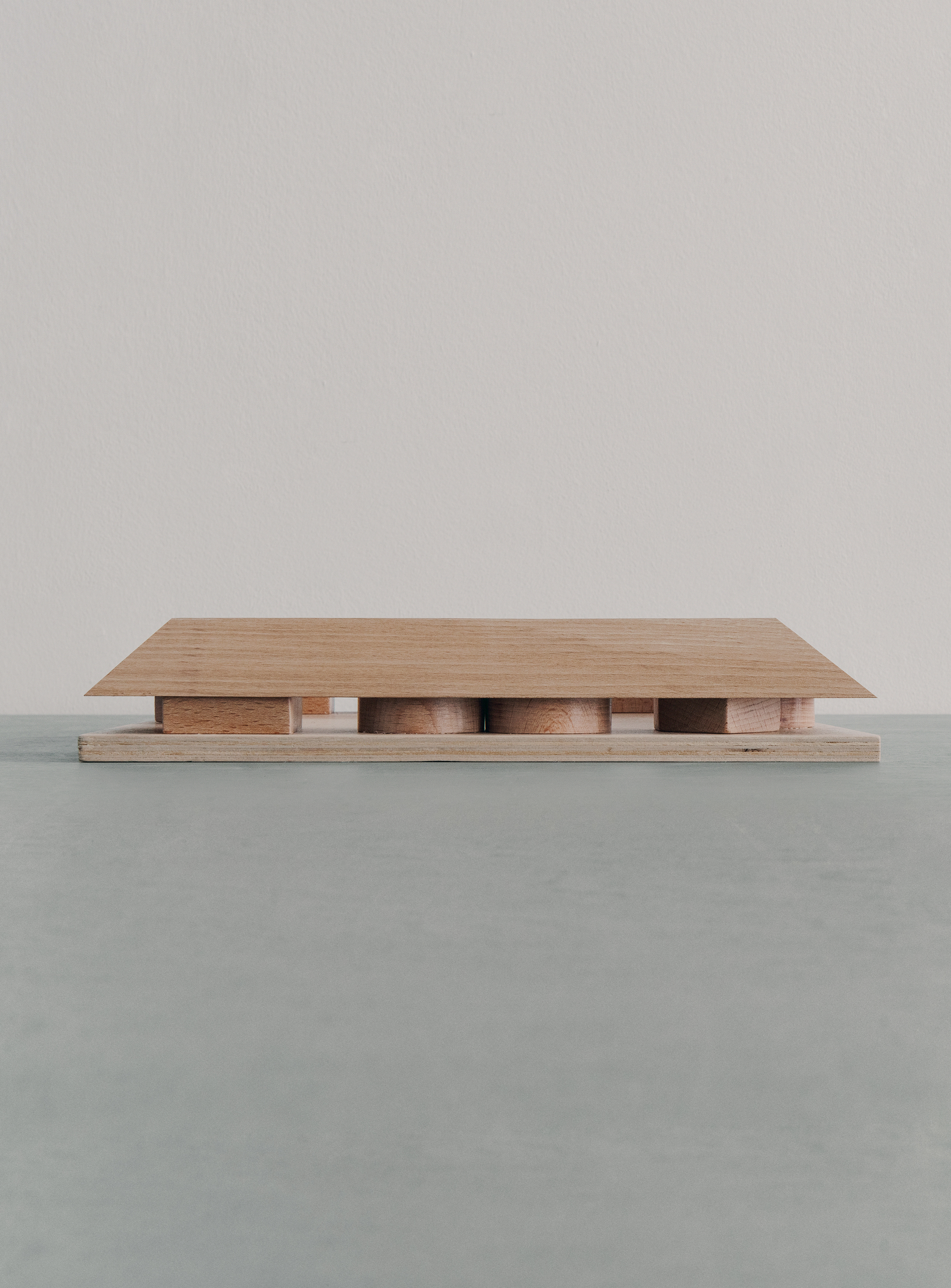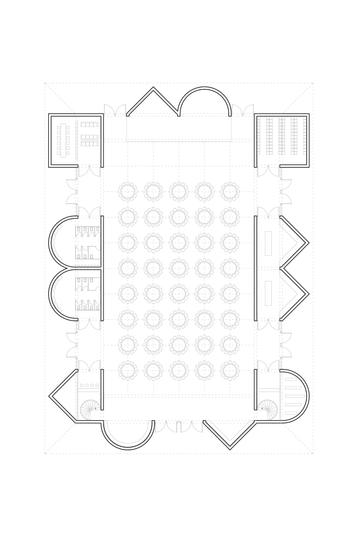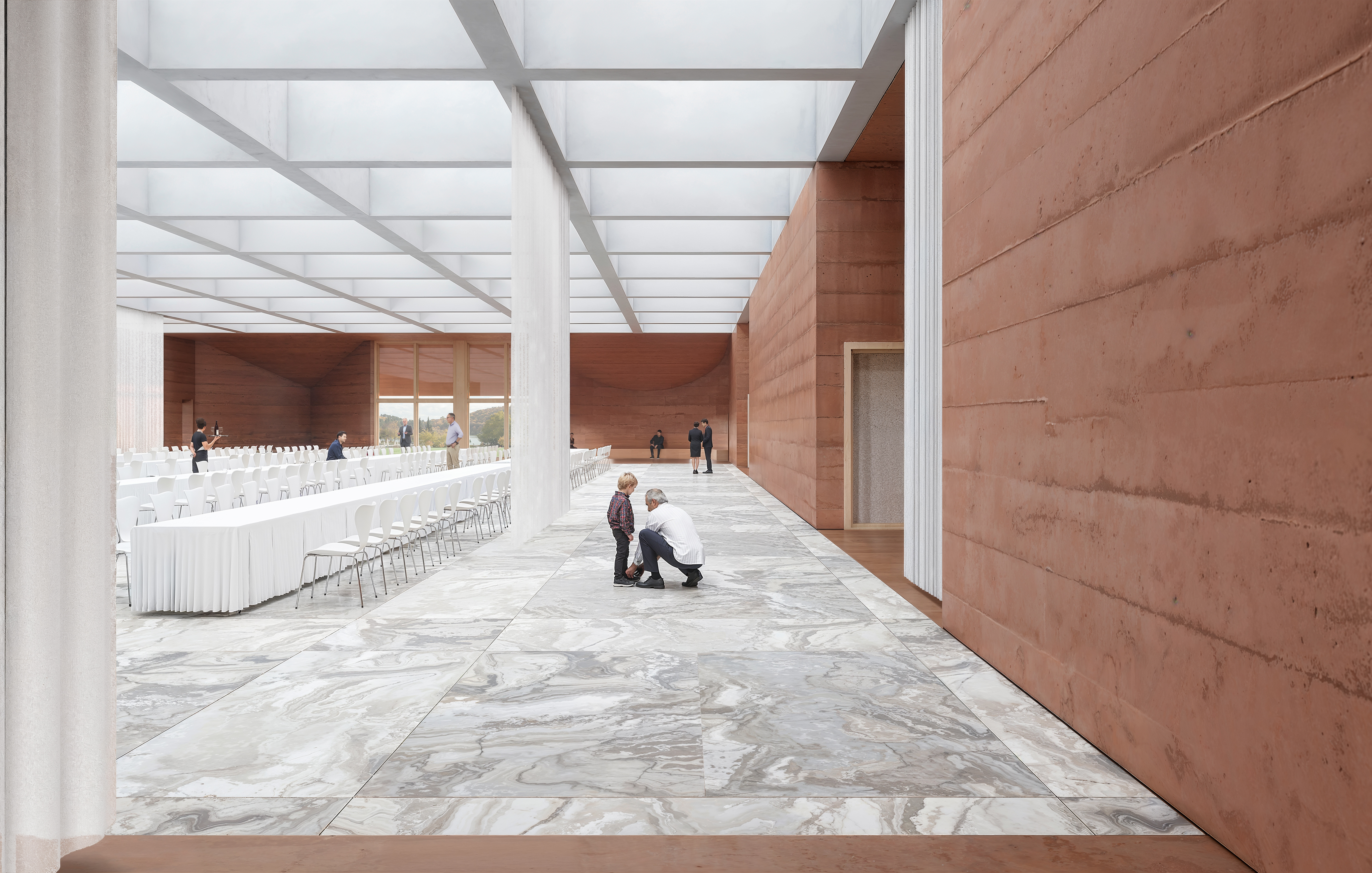 Envisioned as a “choreographic village” for celebrations and conferences, the building is arranged on a rural scale with an orderly, structured layout. The symmetrical pavilions reflect the existing context, incorporating simple rural architectural elements such as houses, gates, façades, roofs, and paths. This functional design centres around a flexible central hall, while the linear roof highlights the horizontal character of the landscape. Its lowered front edges reduce the building’s scale, creating intimate, covered spaces. The structure is designed to seamlessly blend indoor and outdoor areas, offering a versatile space with limitless potential.