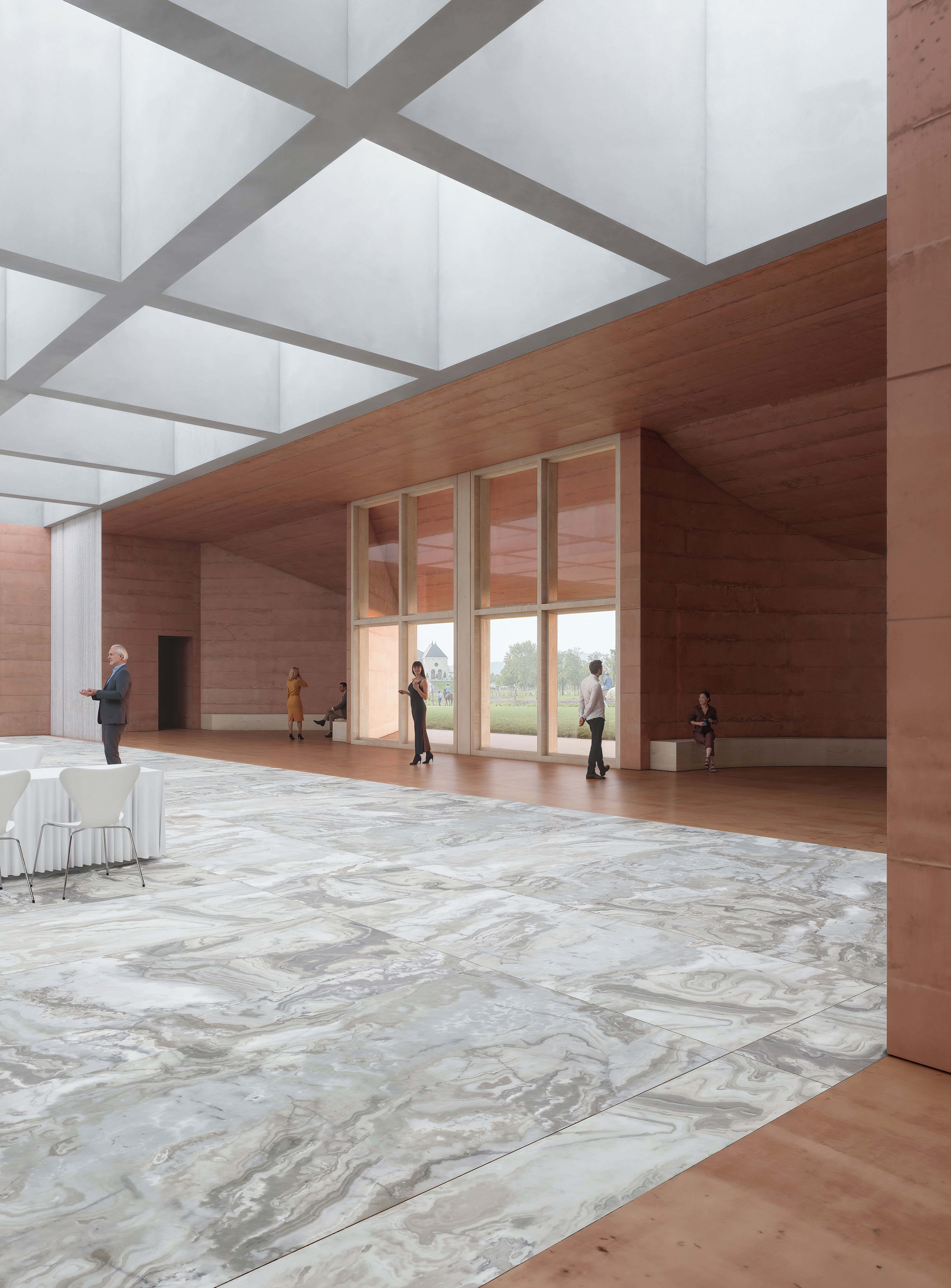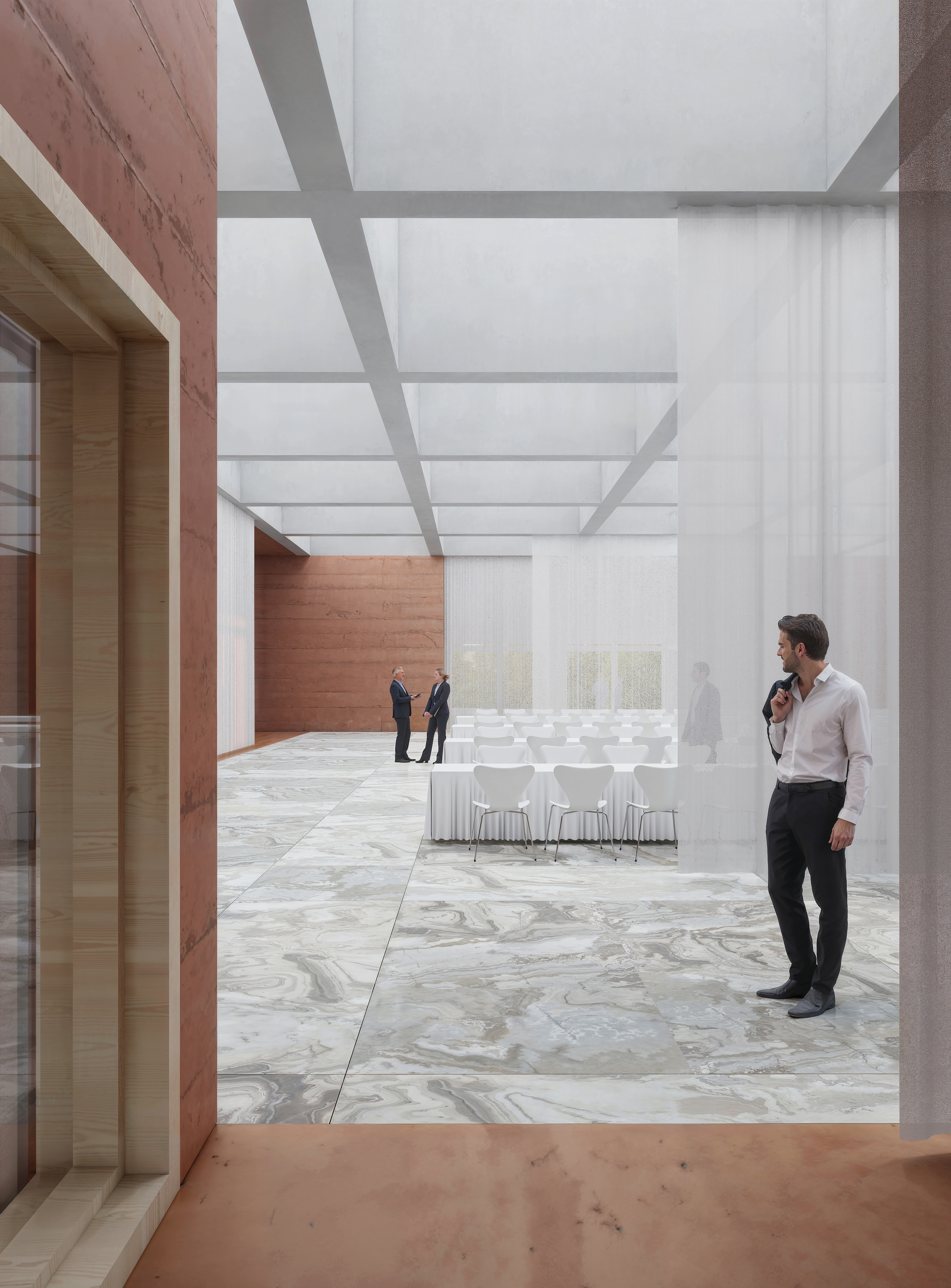 The central hall is designed to host both conferences and celebrations. Acoustic, movable curtains allow for the space to be partitioned as needed. To the west, a large vestibule serves as the main entry, while a stage is situated at the opposite end. Natural light filters through ceiling openings in the lobbies, vestibules, and the central part of the hall, providing daylight illumination. Movable acoustic curtains within the hall allow the space to be flexibly divided according to functional needs, supporting a variety of configurations for both conferences and celebrations. Two open balconies, accessible from the main vestibule, offer views of the lake and the château, providing new perspectives of the complex.