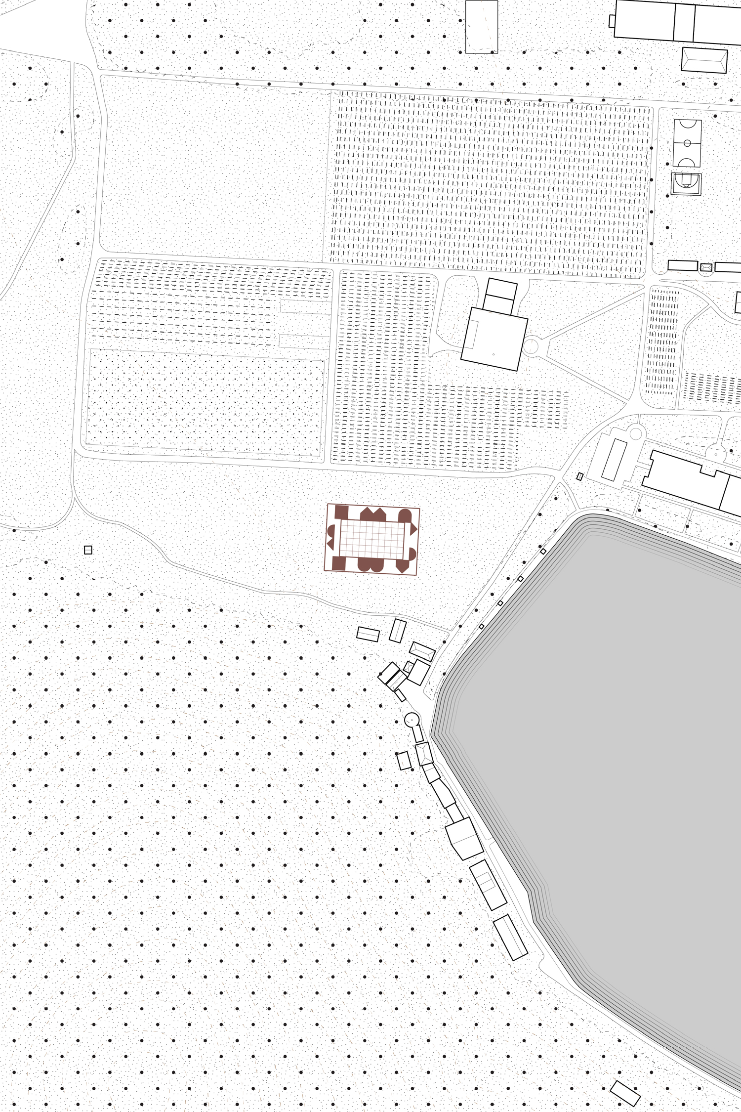 The project site is situated in Lopota village, occupying the last undeveloped area within the lakefront complex. Positioned as a connecting link between the coastal development, the site engages in dialogue with both the natural surroundings and the overall urban fabric. The design features a generous public space between the lake and the event hall, providing areas for outdoor events.