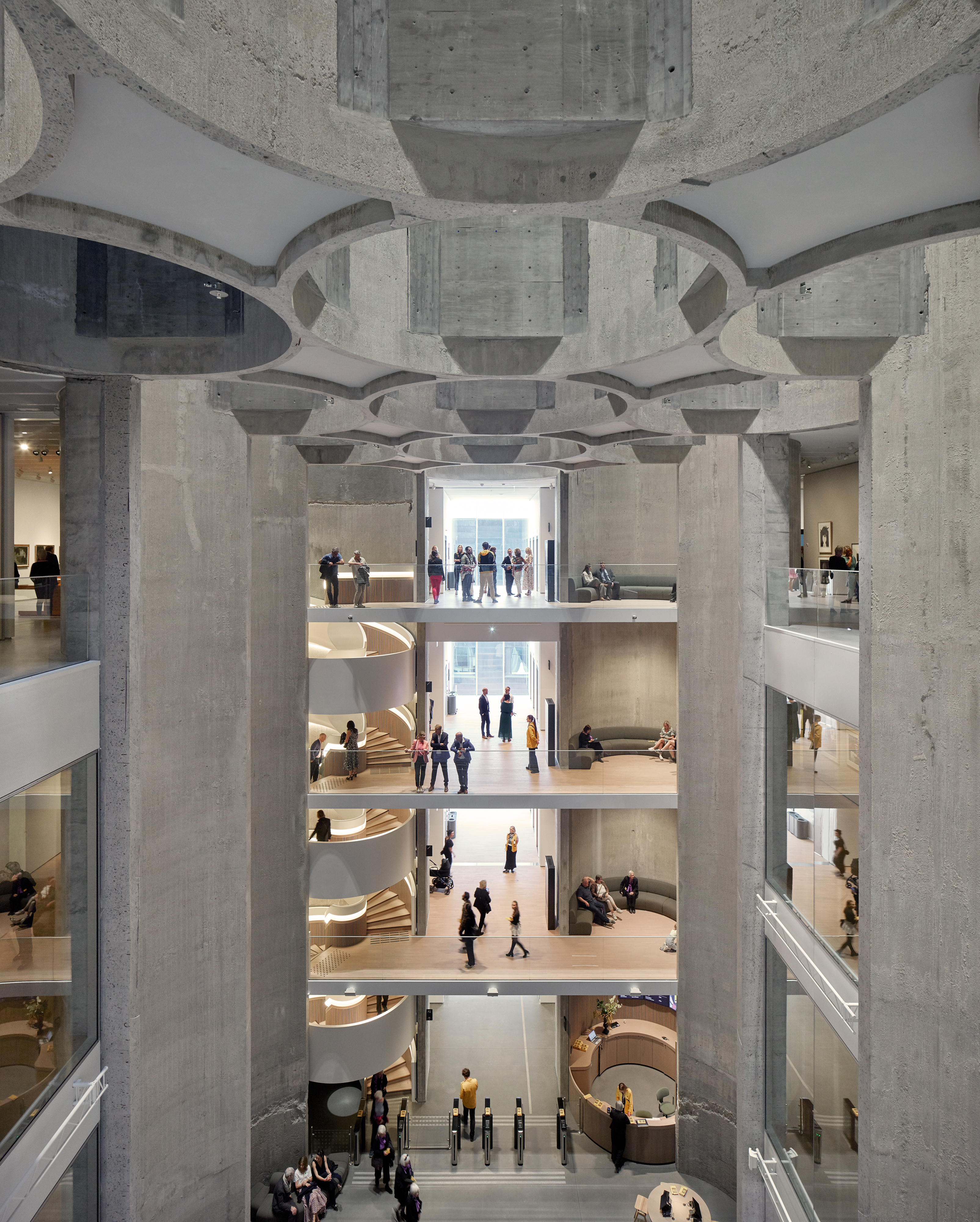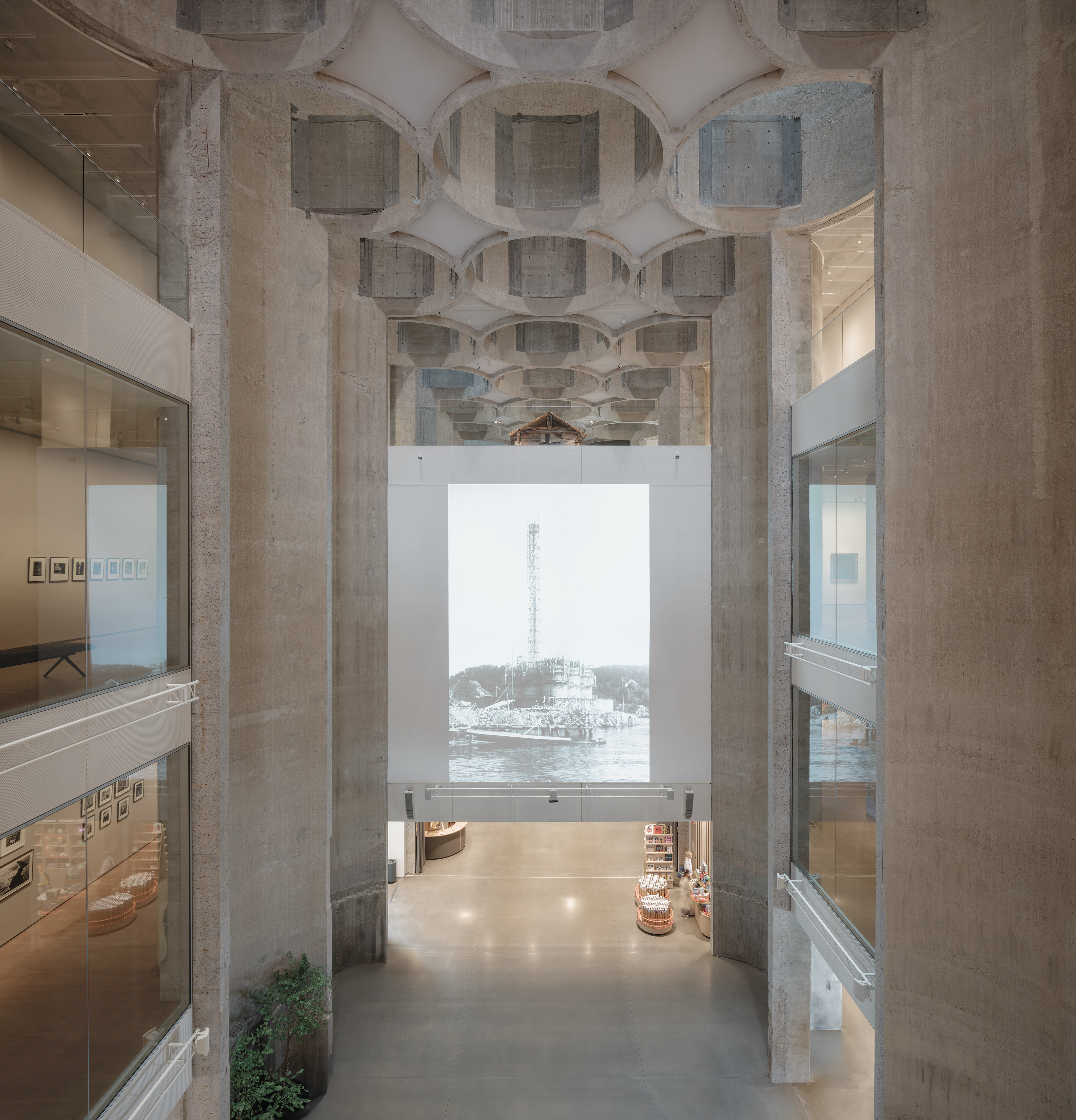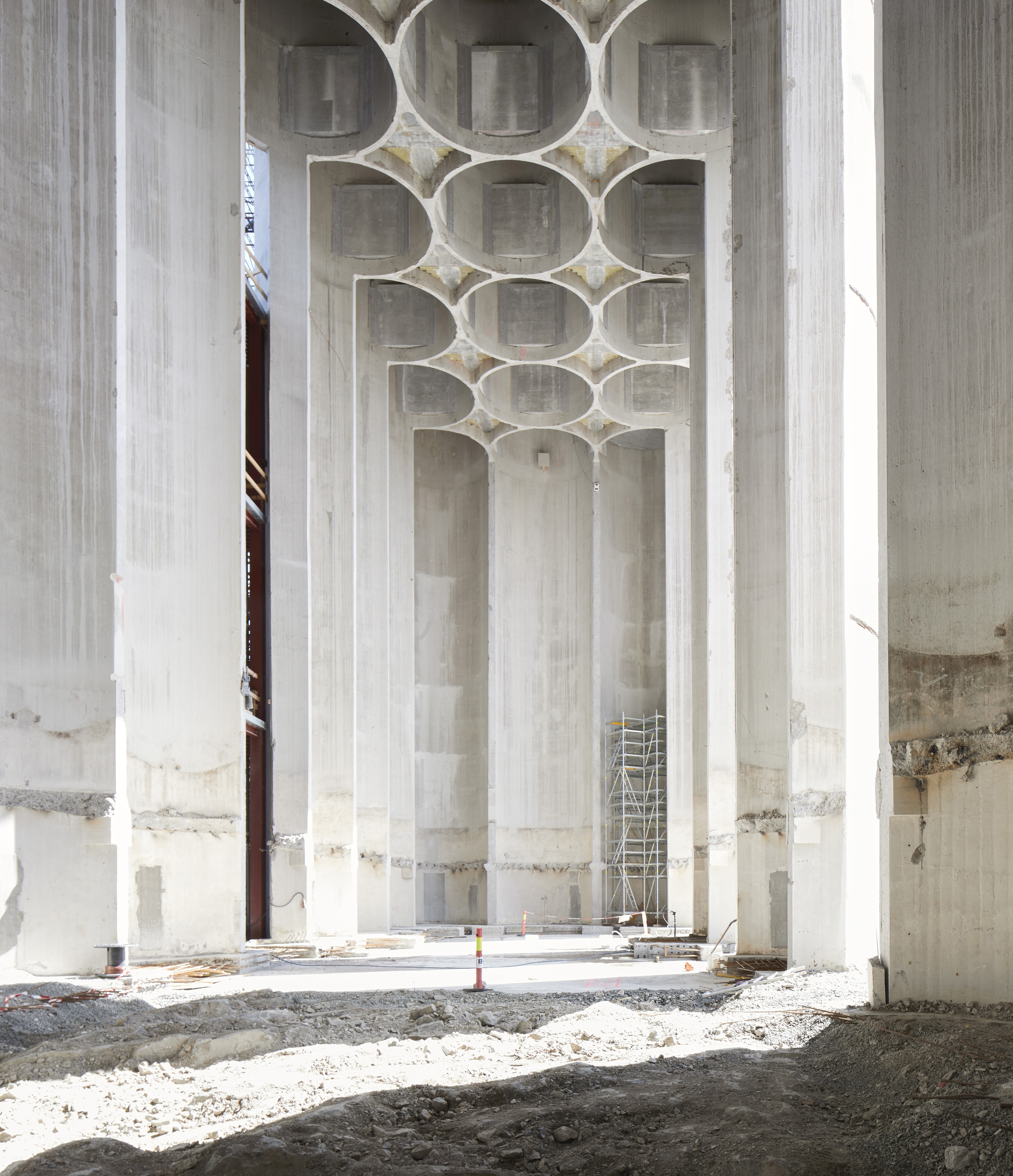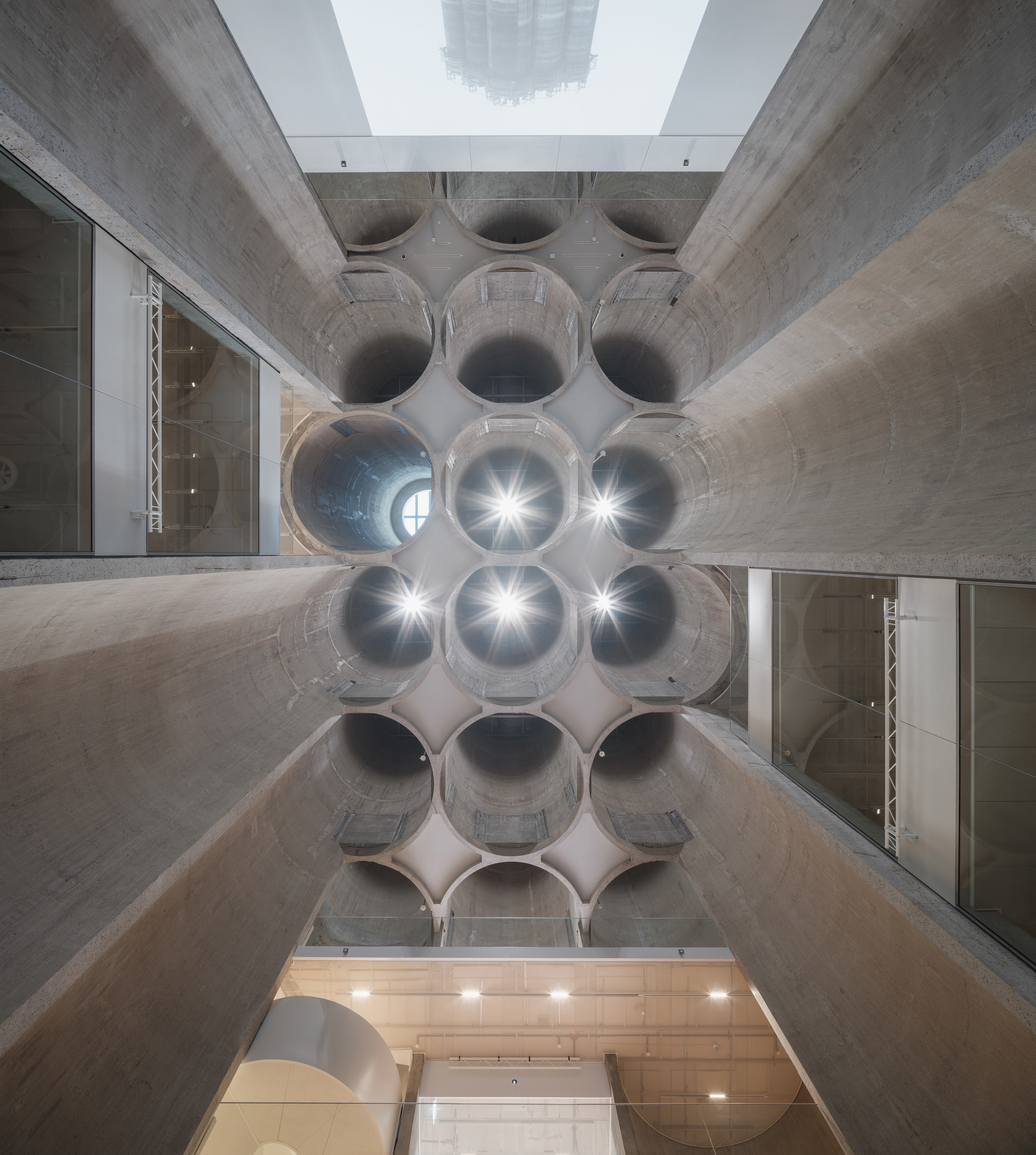 A nivel interior, el proyecto apuesta por potenciar la expresividad y habitar un silo como contenedor de arte y generador de una experiencia única. La estrategia principal radica en hacer un gran corte a 21m de altura a lo largo de todos los silos, para generar el foyer vertical – “Silosalen”- como corazón del edificio, una sala basilical totalmente abierta y pública que articula el nuevo museo. Esta operación significó un reto estructural importante, que se tradujo en un cosido de entramado de vigas de hormigón que refuerzan y soportan el silo. Se realizó un cuidadoso tratamiento de hormigón para mantener y recuperar su pátina, y encontrar el equilibrio entre lo inacabado y la nueva intervención, de manera que ésta pudiera nutrirse de la belleza de la propia prexistencia.