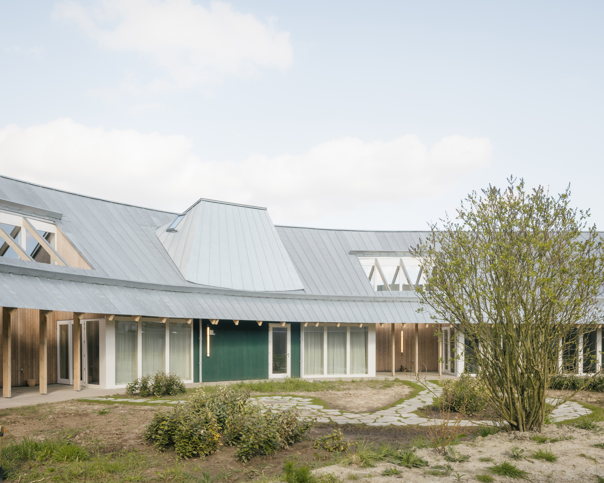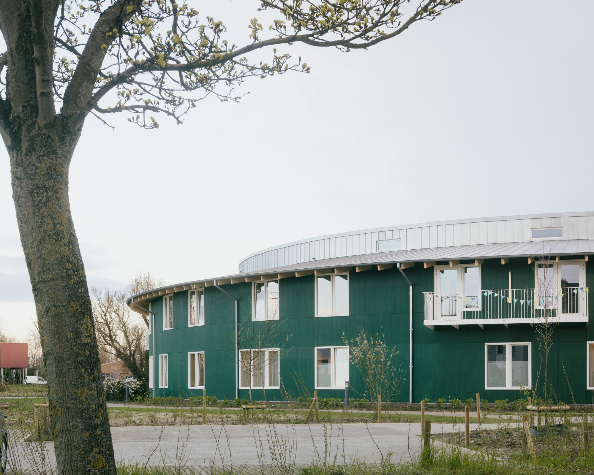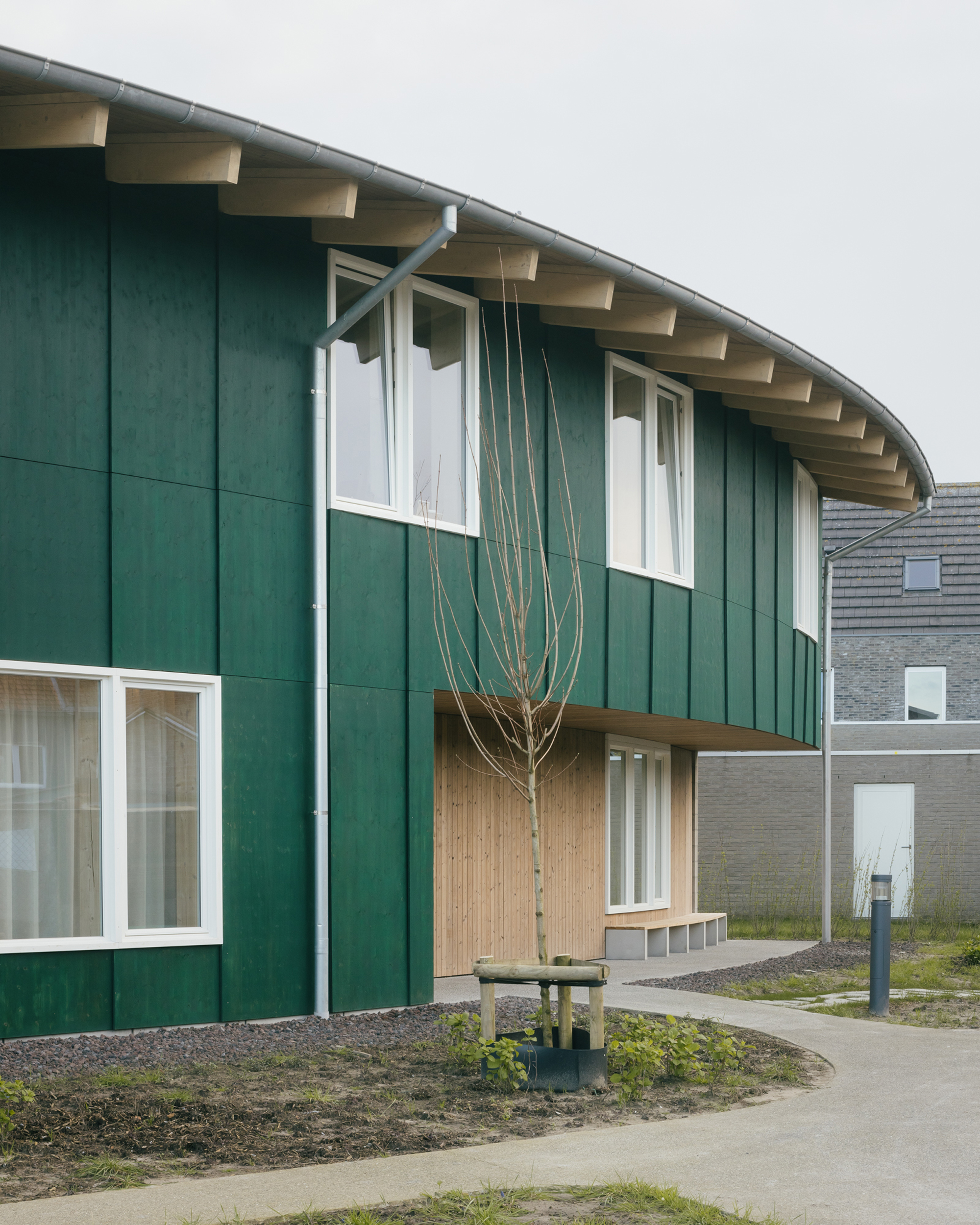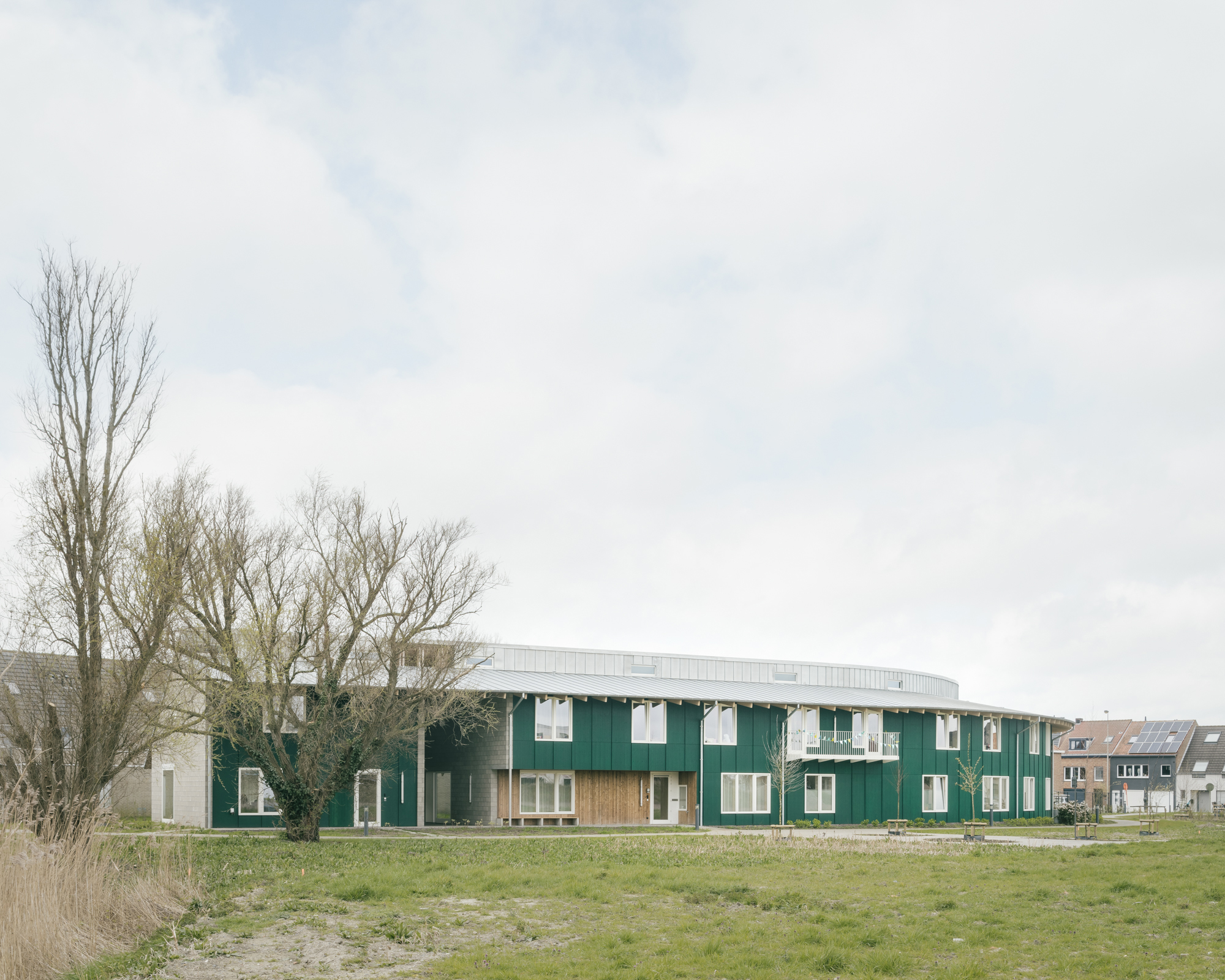 Situated between the authentic village fabric of Stene and a new urban development, the site functions as a spatial hinge connecting these two contrasting contexts. The architecture mediates between past and future, rural and urban, community and individuality. Two distinct building structures organize the site and define a park landscape that opens toward the surrounding neighborhood. This open space strengthens the relationship between the historic village and the adjacent development. The curved geometry of the buildings shapes a gradual transition from public areas to intimate private gardens. A meandering path threads through the site, linking it naturally with the existing fabric of the neighborhood.