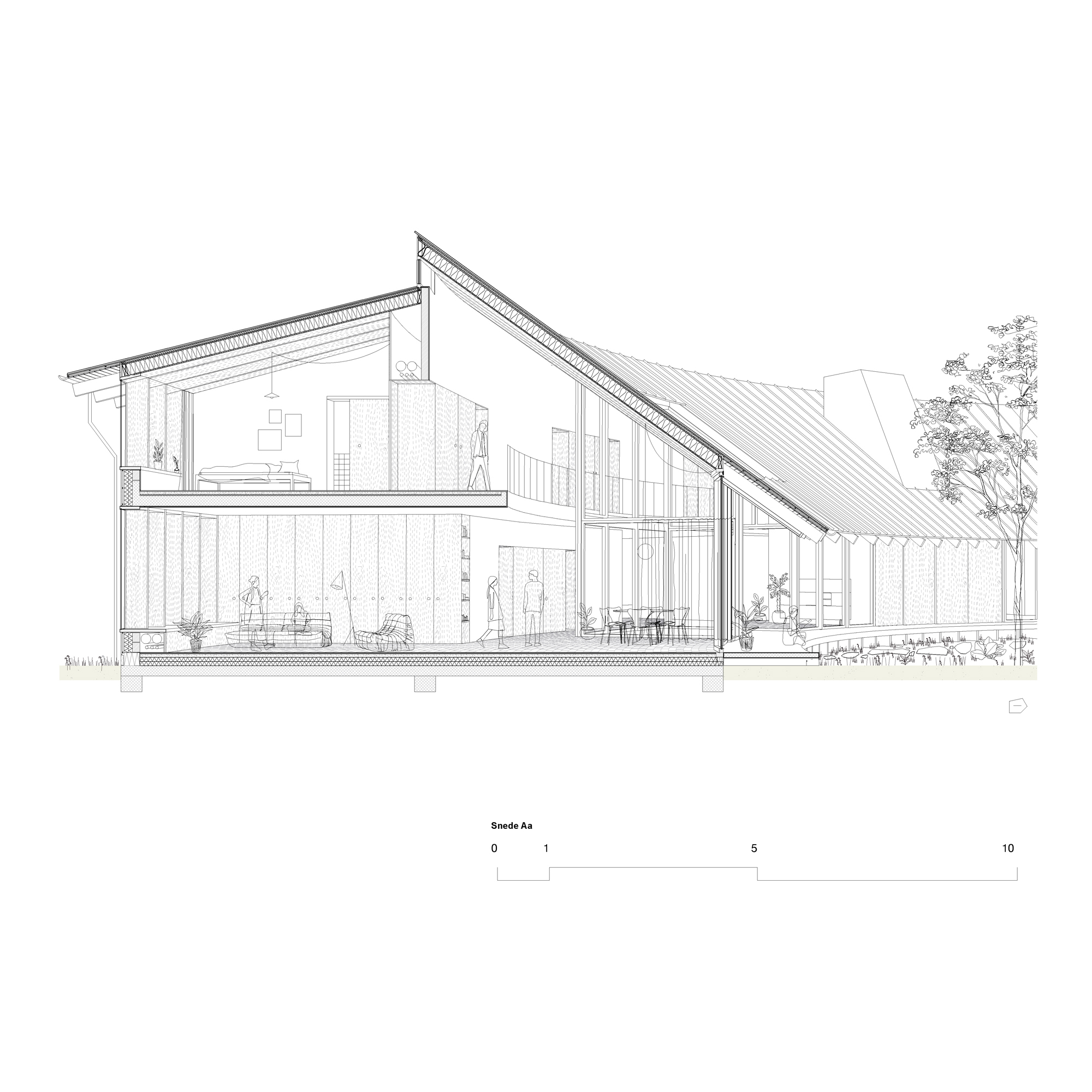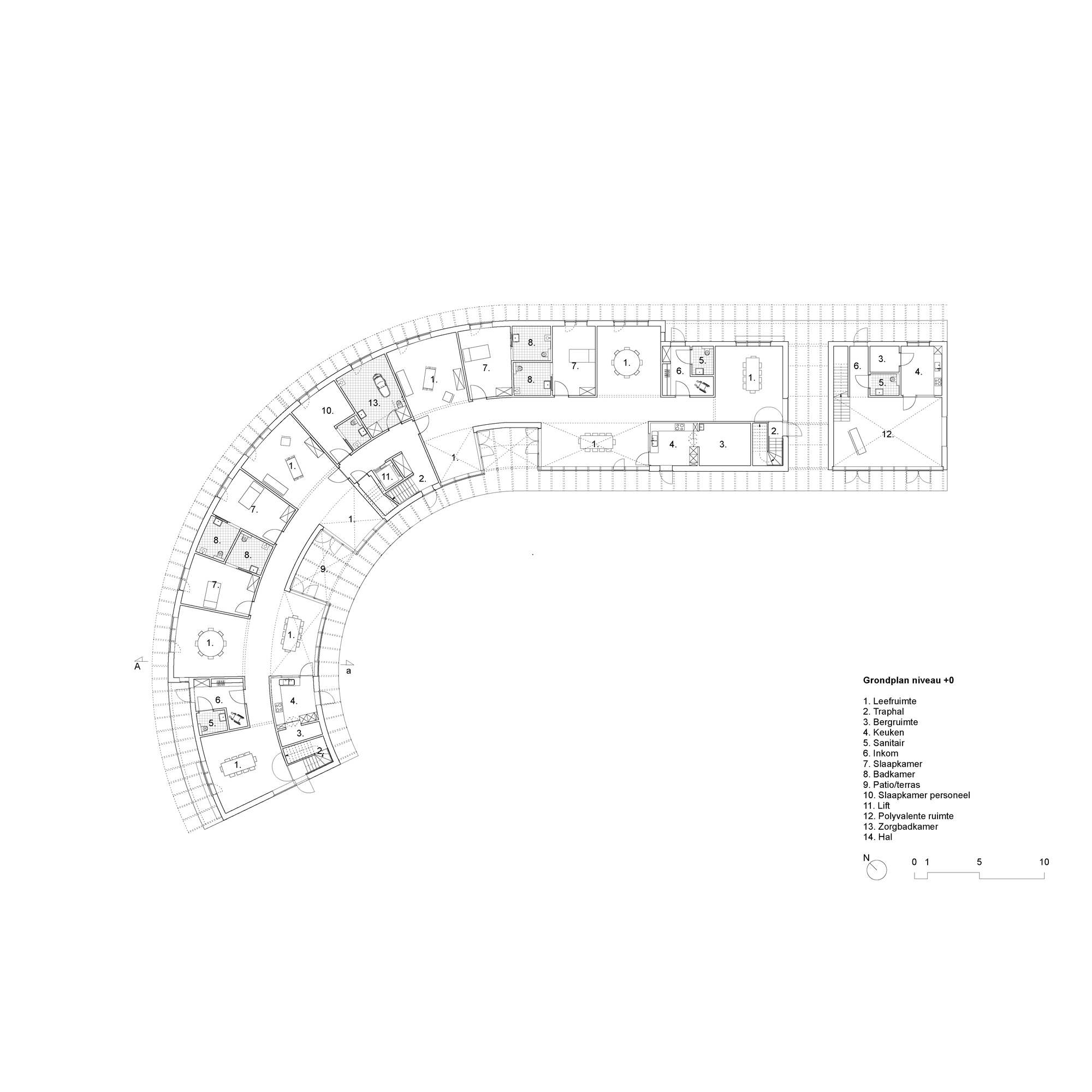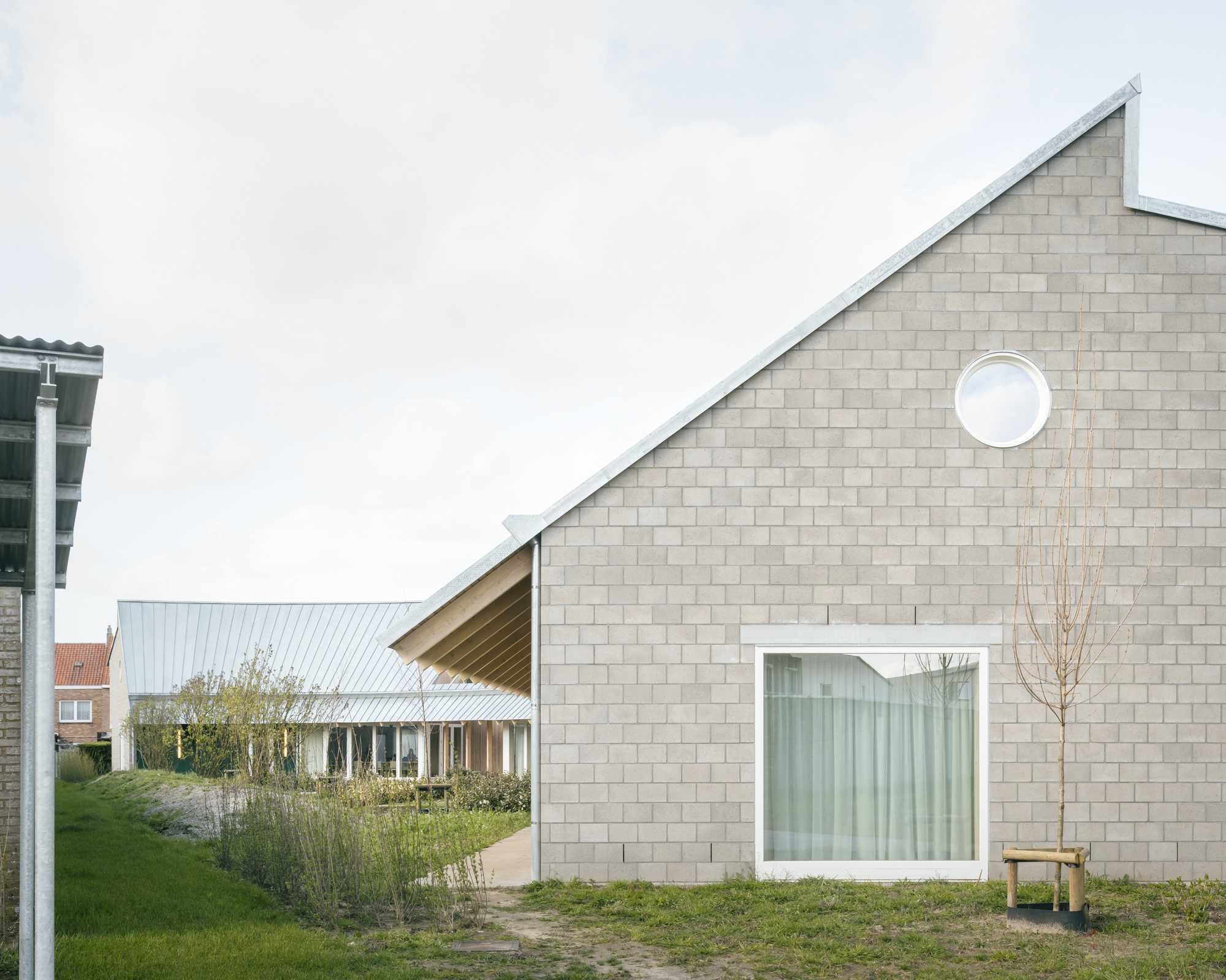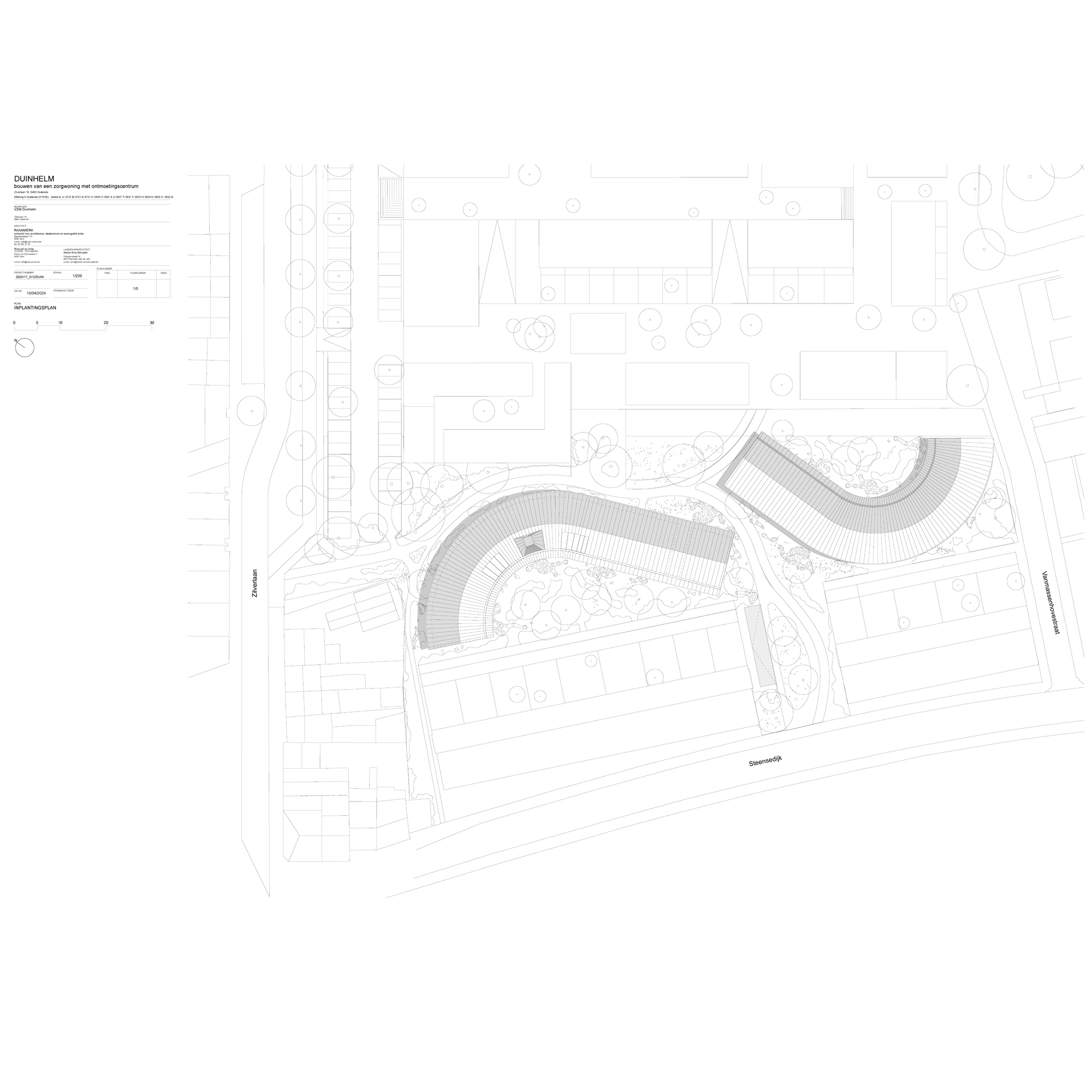 Situated between the authentic village fabric of Stene and a new urban development, the site functions as a spatial hinge connecting these two contrasting contexts. The architecture mediates between past and future, rural and urban, community and individuality. Two distinct building structures organize the site and define a park landscape that opens toward the surrounding neighborhood. This open space strengthens the relationship between the historic village and the adjacent development. The curved geometry of the buildings shapes a gradual transition from public areas to intimate private gardens. A meandering path threads through the site, linking it naturally with the existing fabric of the neighborhood.