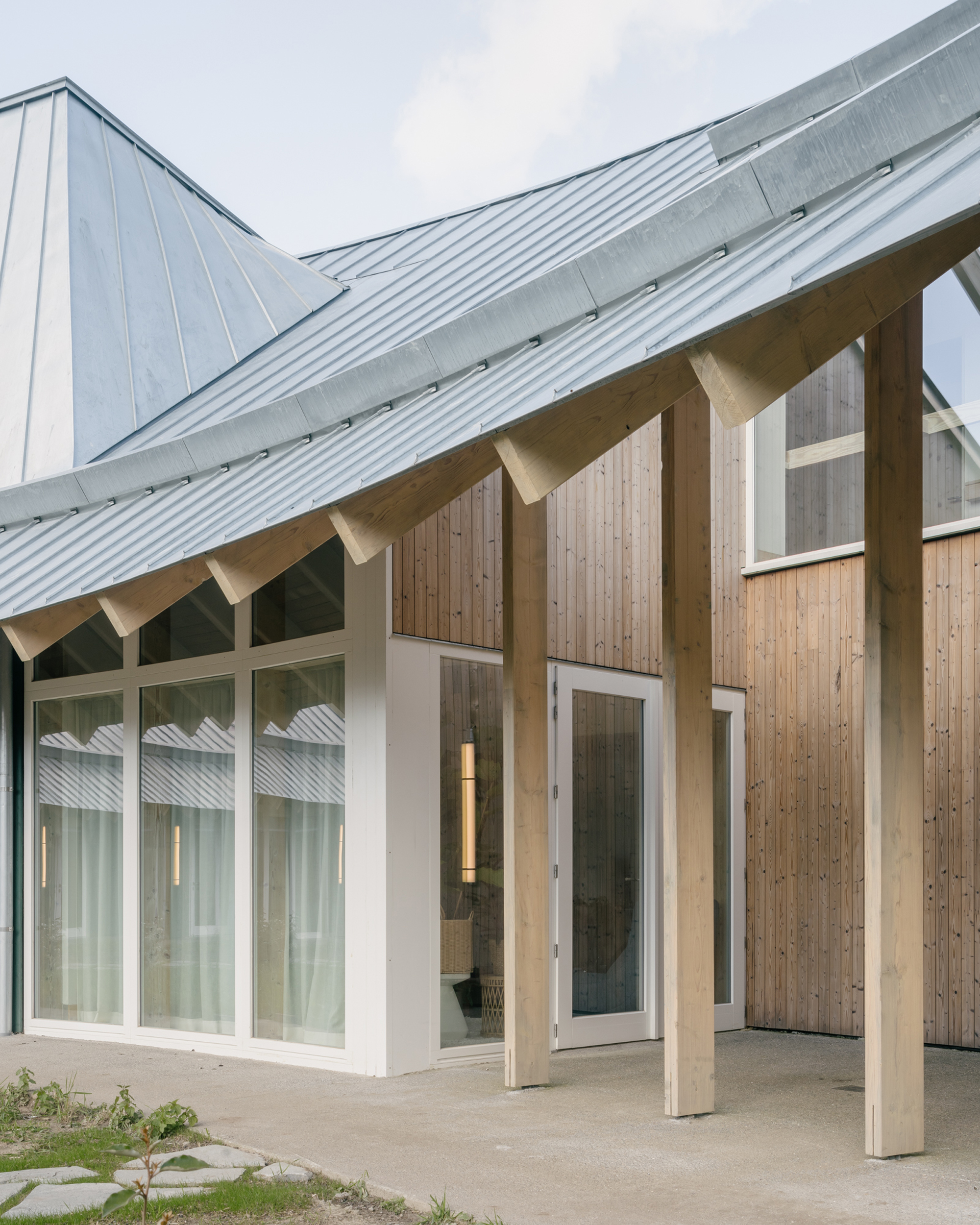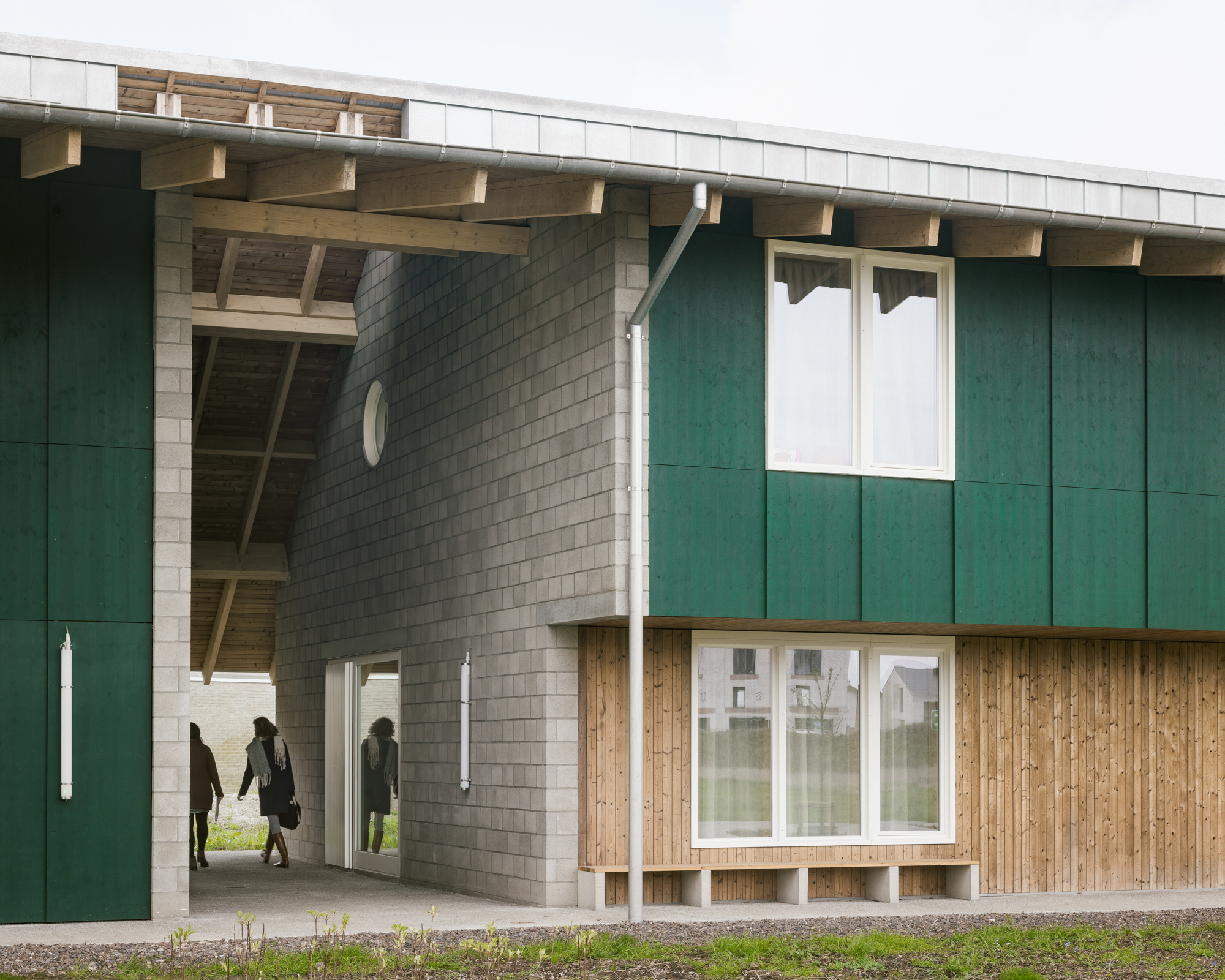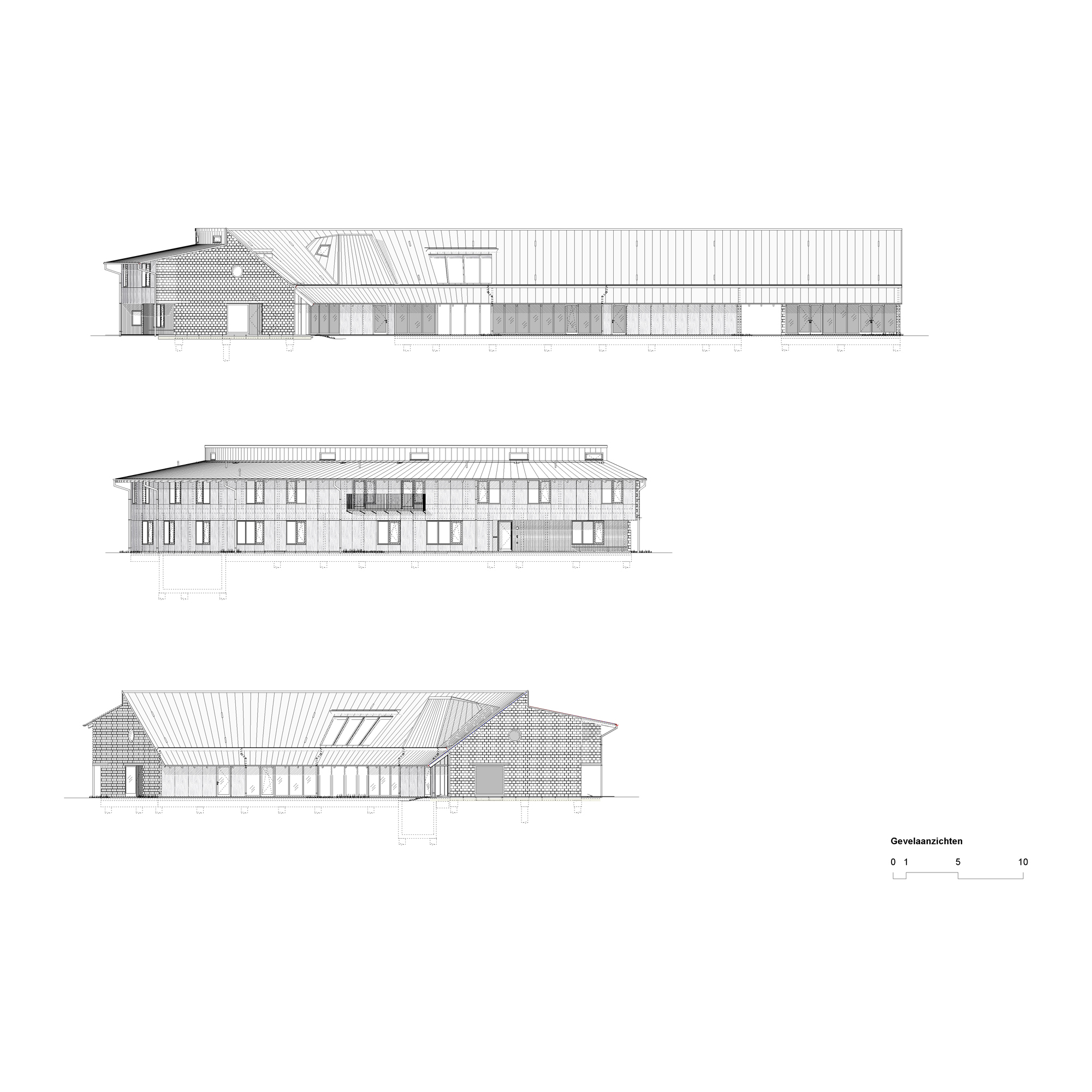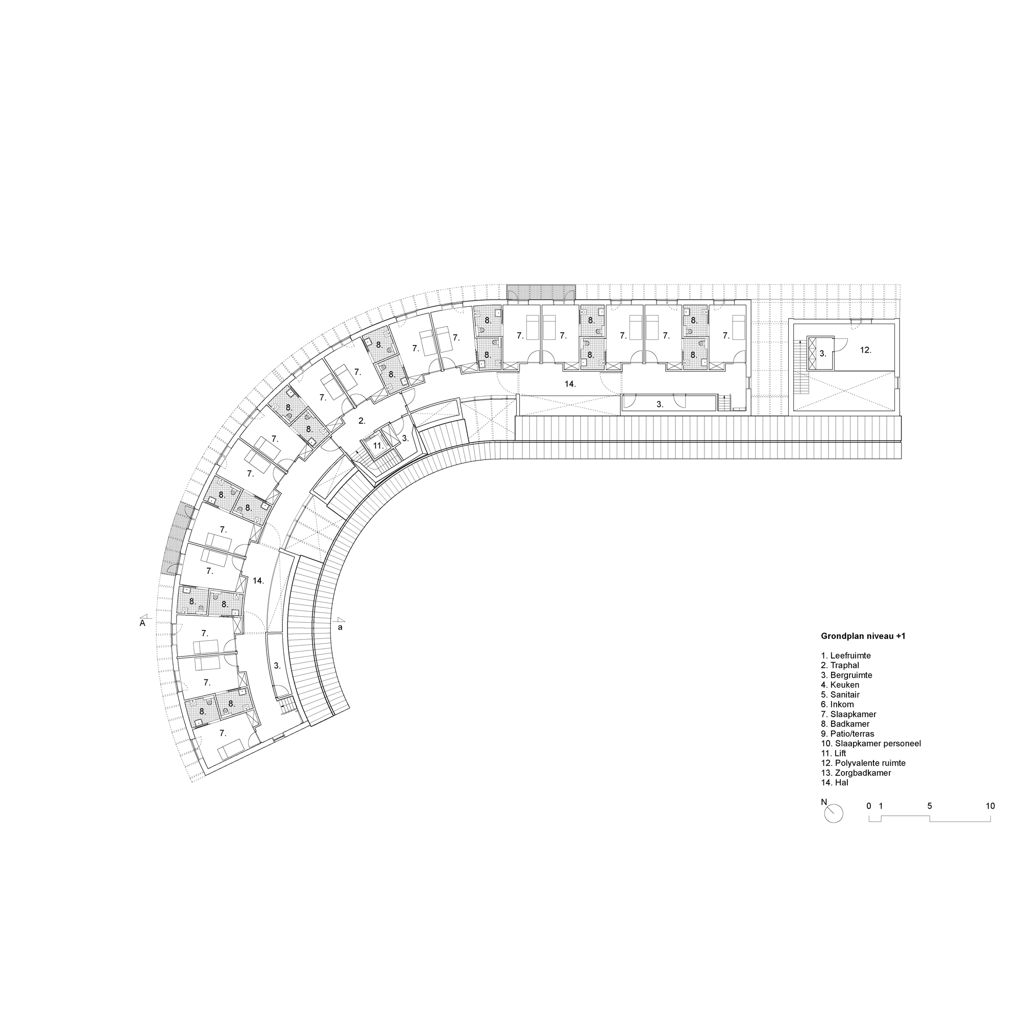 Situated between the authentic village fabric of Stene and a new urban development, the site functions as a spatial hinge connecting these two contrasting contexts. The architecture mediates between past and future, rural and urban, community and individuality. Two distinct building structures organize the site and define a park landscape that opens toward the surrounding neighborhood. This open space strengthens the relationship between the historic village and the adjacent development. The curved geometry of the buildings shapes a gradual transition from public areas to intimate private gardens. A meandering path threads through the site, linking it naturally with the existing fabric of the neighborhood.