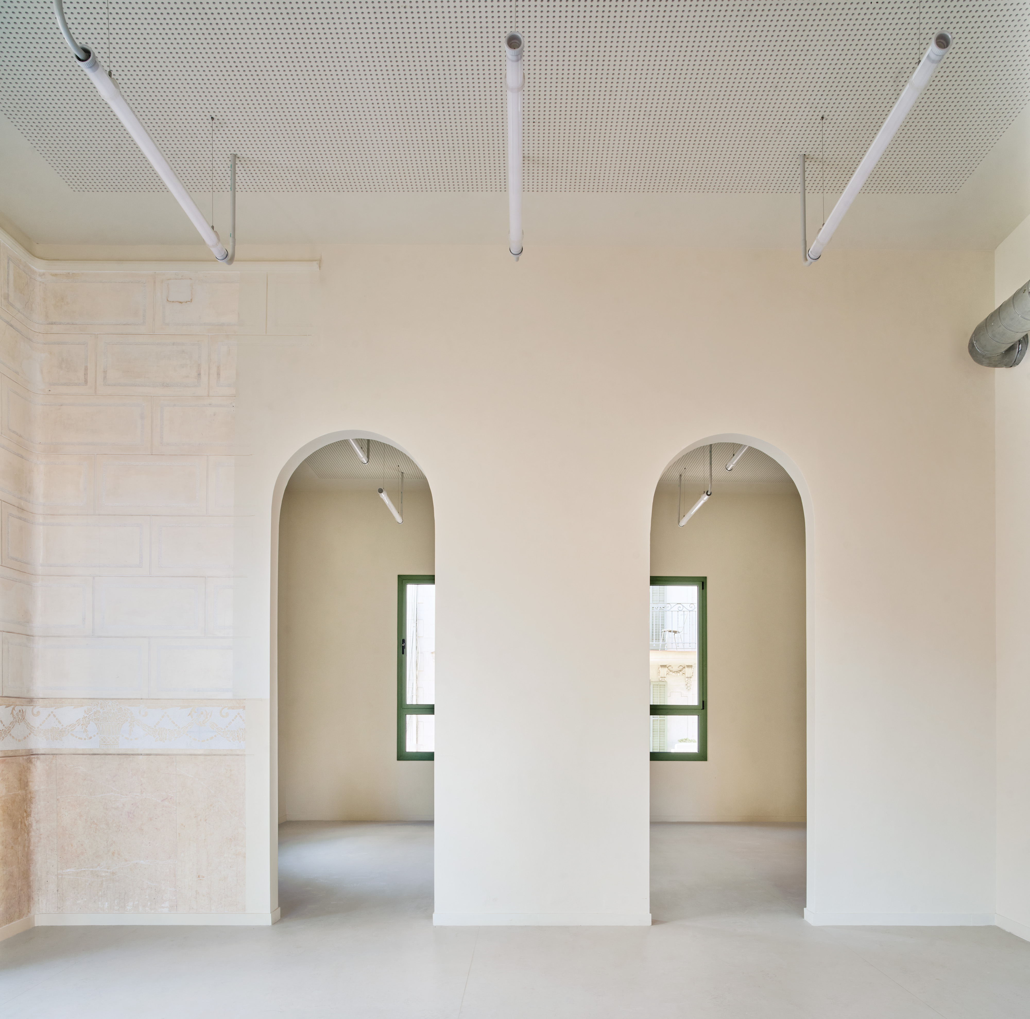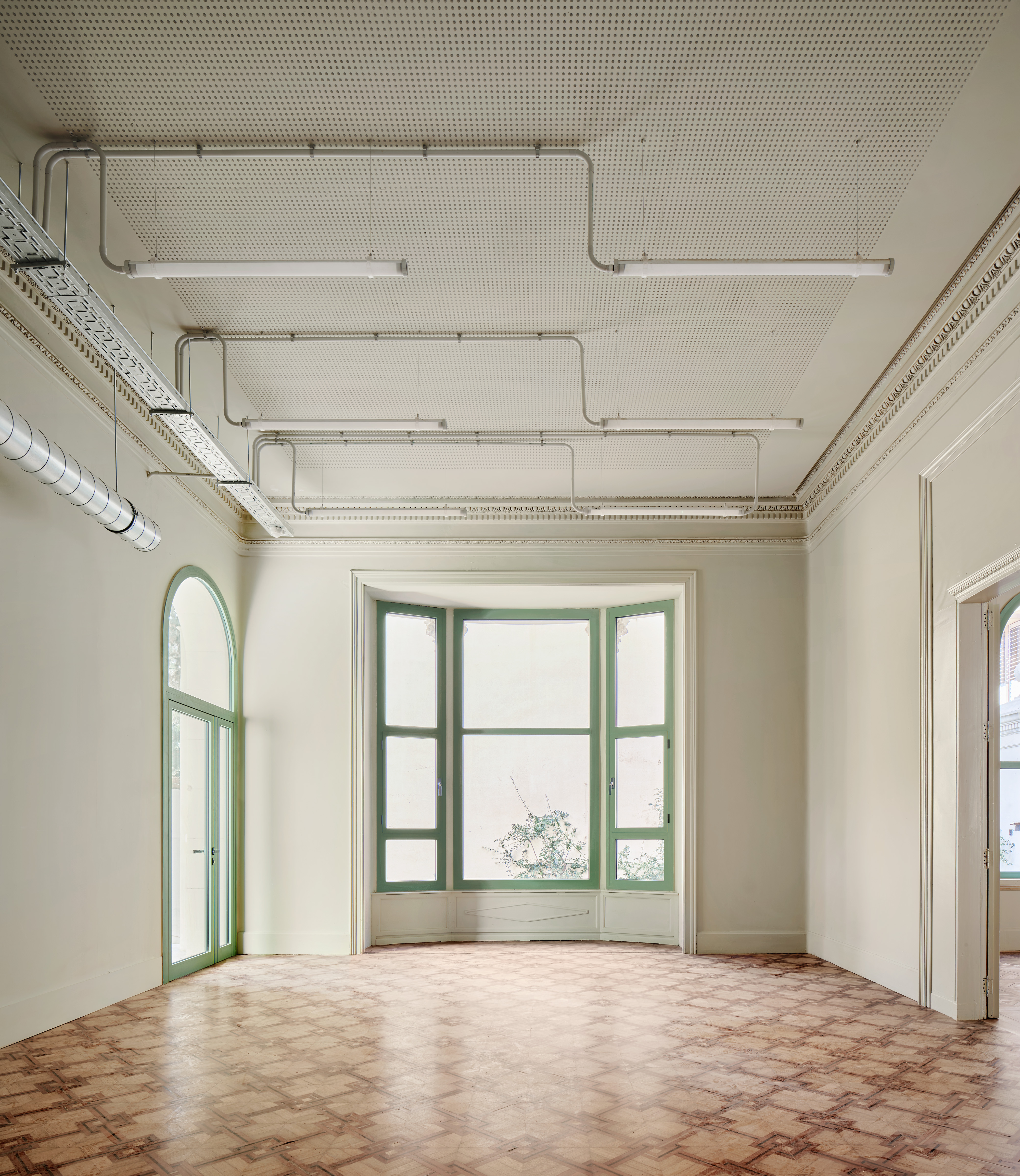 The new elements incorporated are constructed in wood with distinctive geometries and colors that contrast with the existing ones, positioned within the space without affecting the original structures and ceilings. The ventilation and lighting systems are also visible