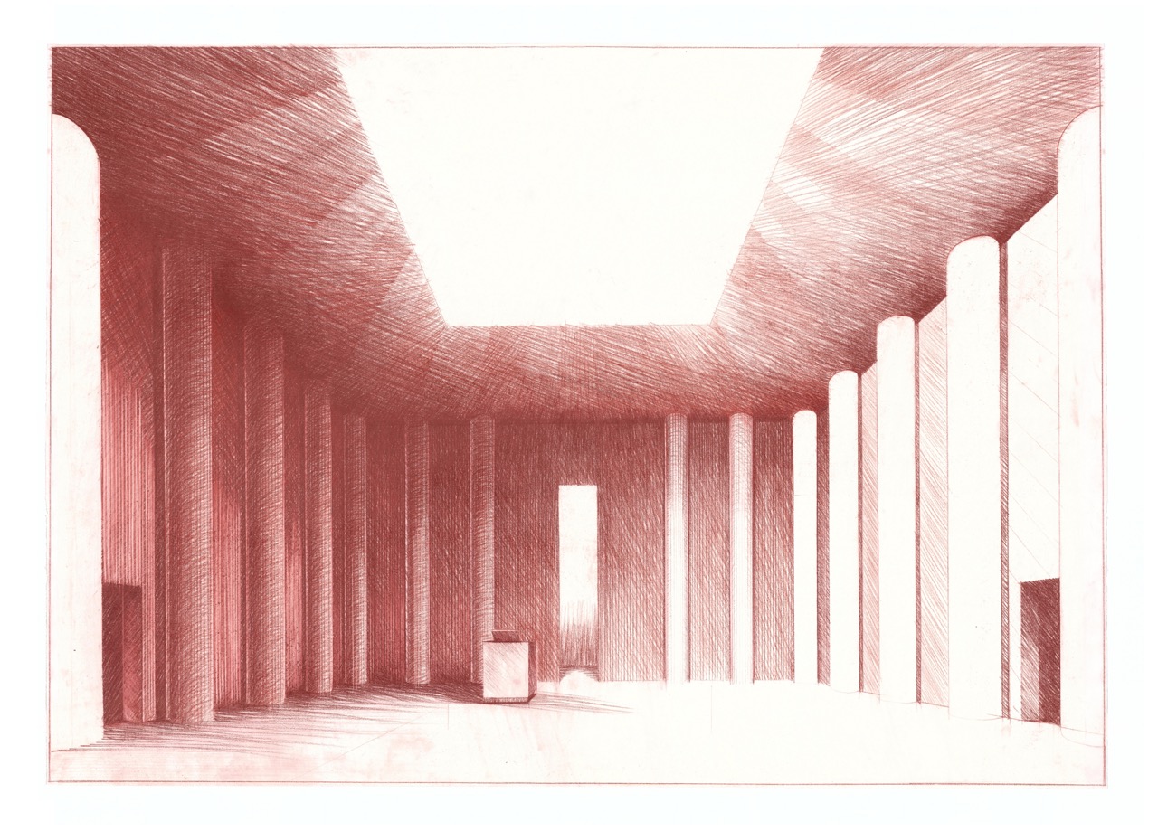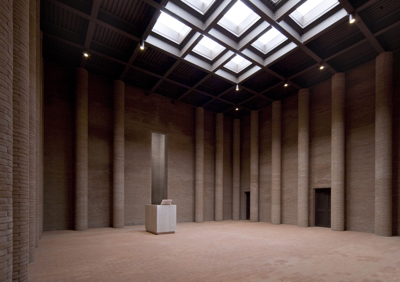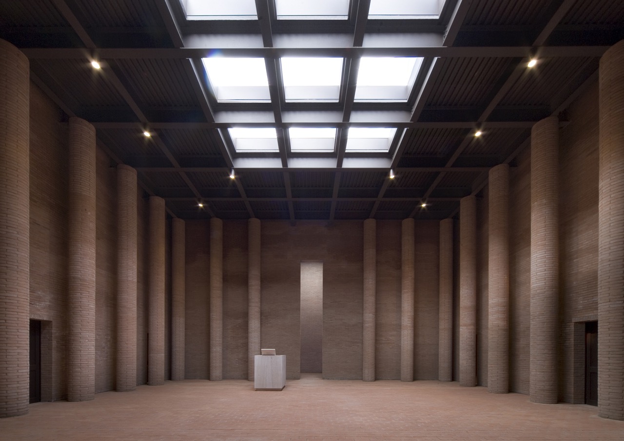 The first square consists of the large Farewell Hall, illuminated by a central light source and occupied only by the columns on the walls and the ambo reserved for prayer.
