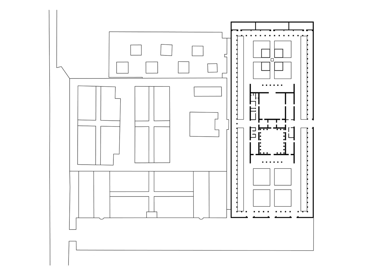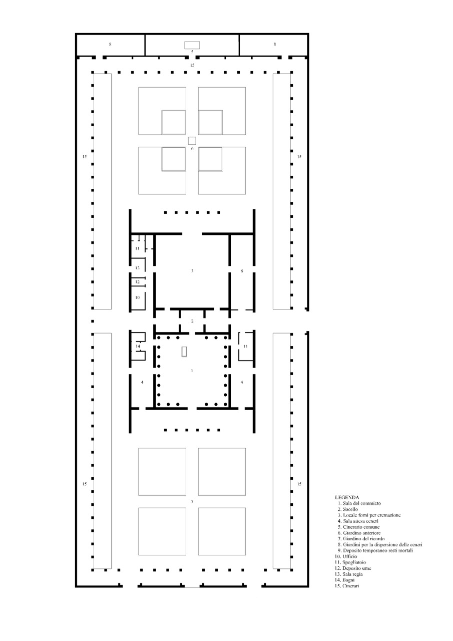cemetery, embraces the moments of the journey, establishing a precise hierarchy, whose architectural medium is the Temple itself, located at the center of the two dimensions. The latter also spatially marks the timing of the rite, between the exterior and interior, dividing, in a processional path, the area for welcoming the deceased and their family, located near the