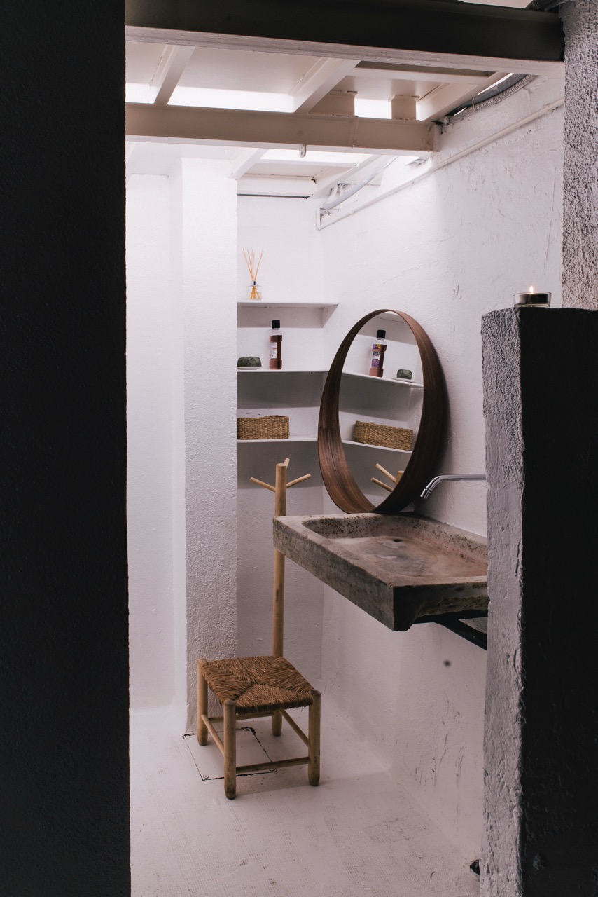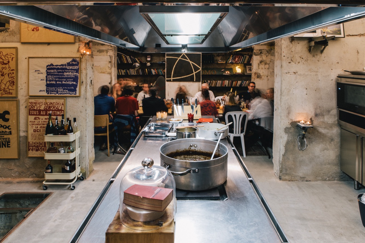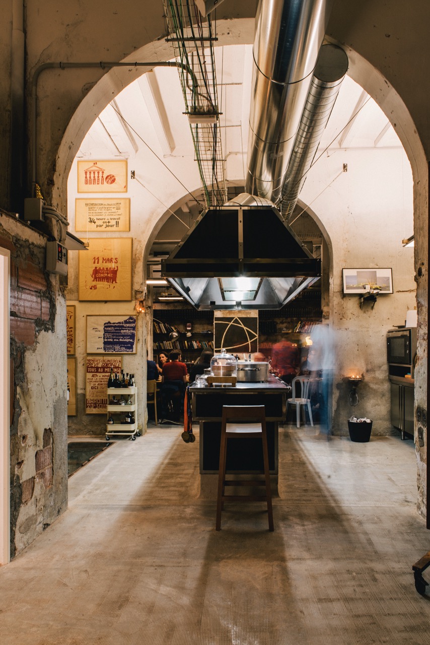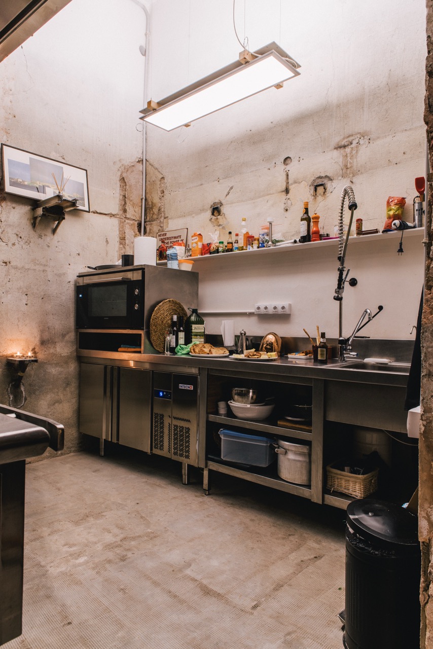La cocina industrial es comprada de segunda mano a un restaurante que cerraba y los muebles provenían de otro local que diseñé para él.