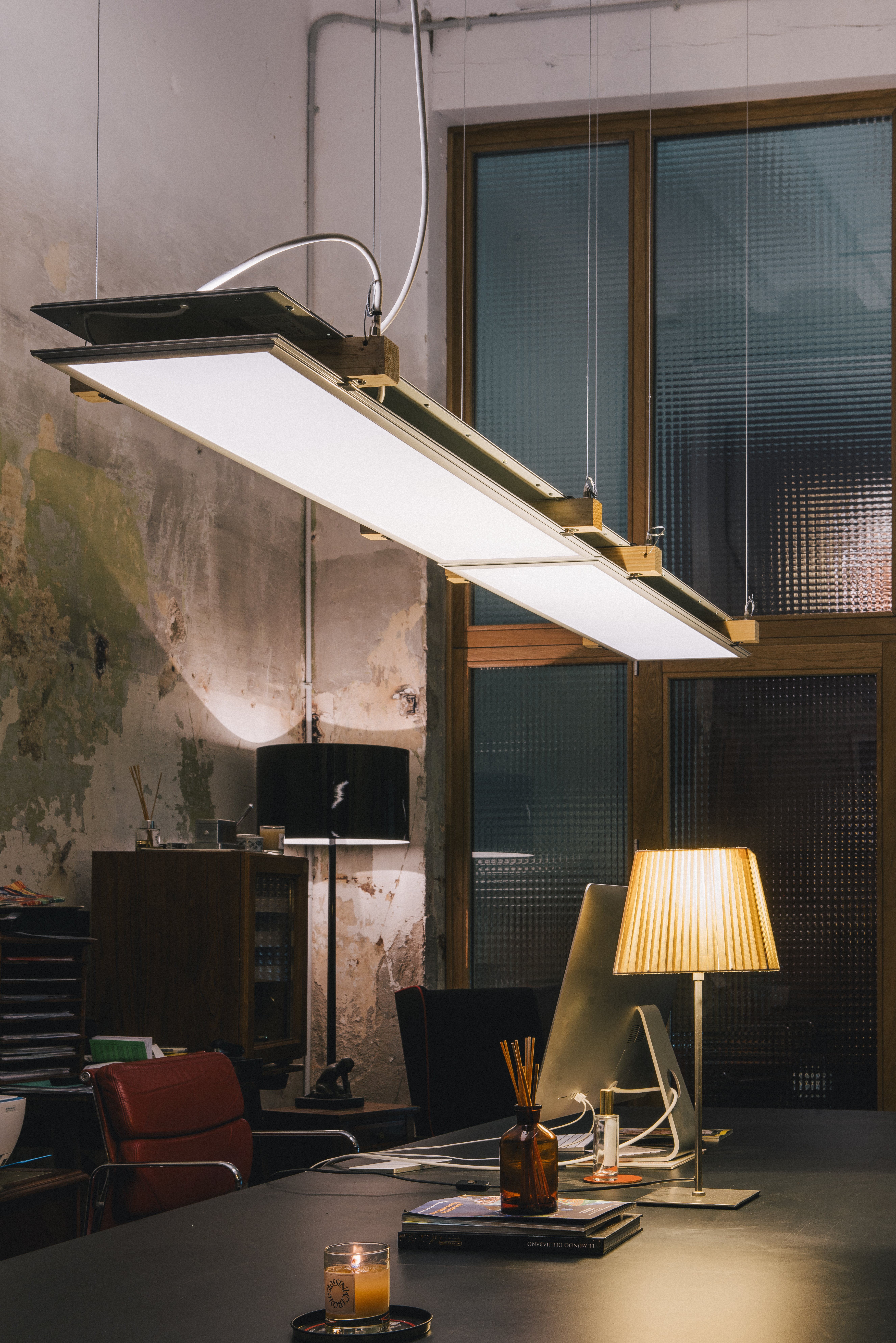 El instalador nos hizo unas lámparas con dos placas standard de leds, con encendidas y dimerizado individual, una para arriba y una para abajo, crean diferentes escenas de luz.