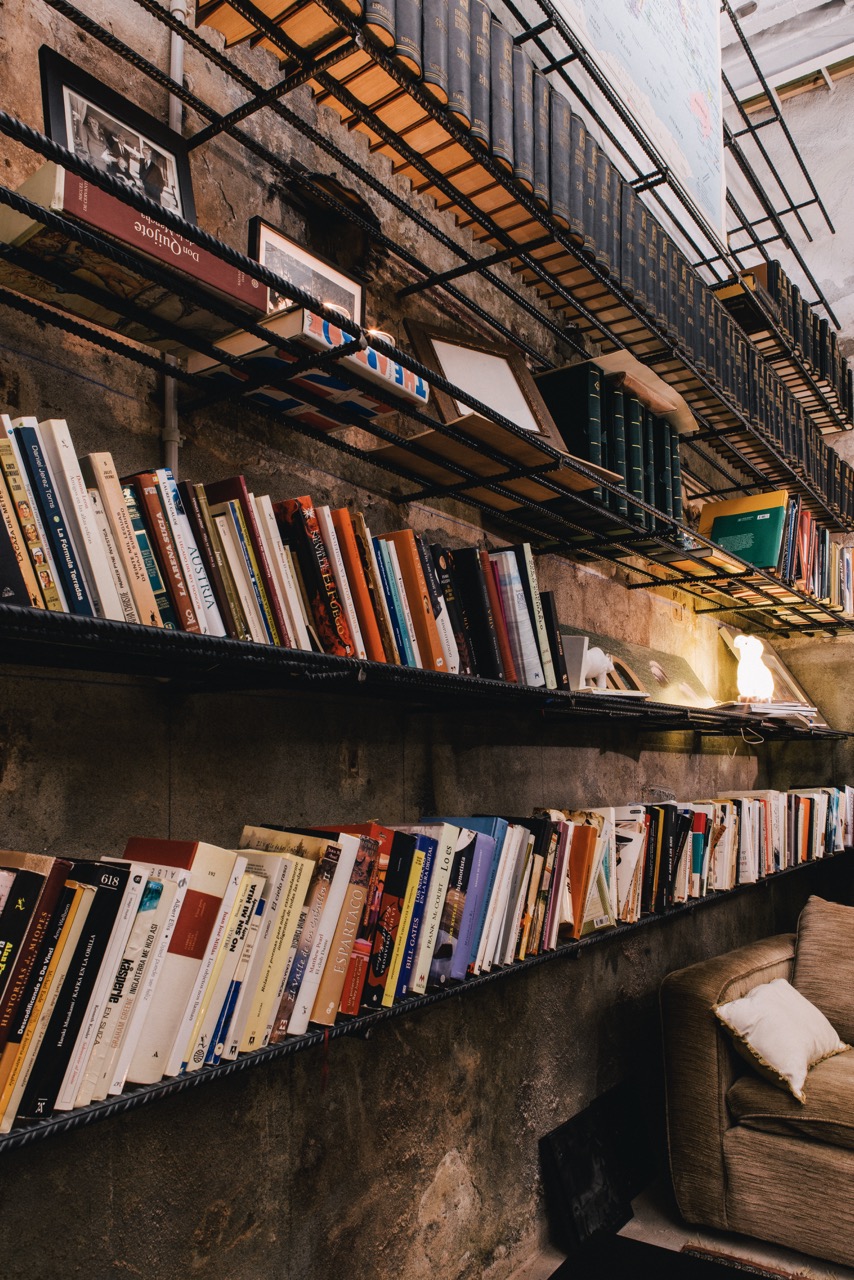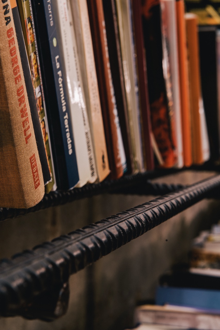 Unas estanterías de reas de hierro nervado homenaje al gran arquitecto Enric Miralles en varios ámbitos de este espacio.
