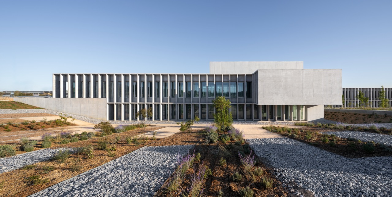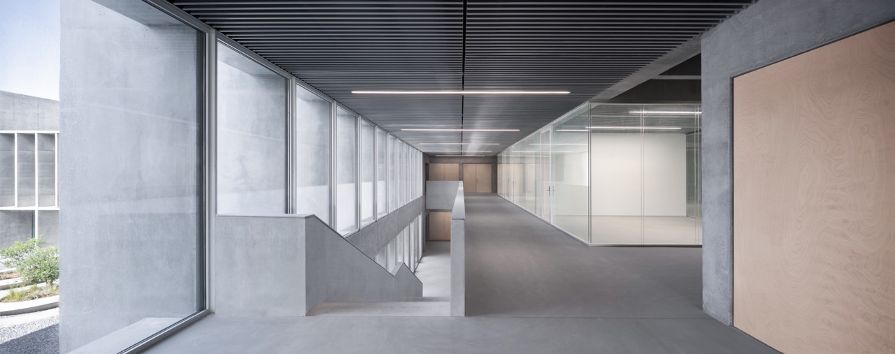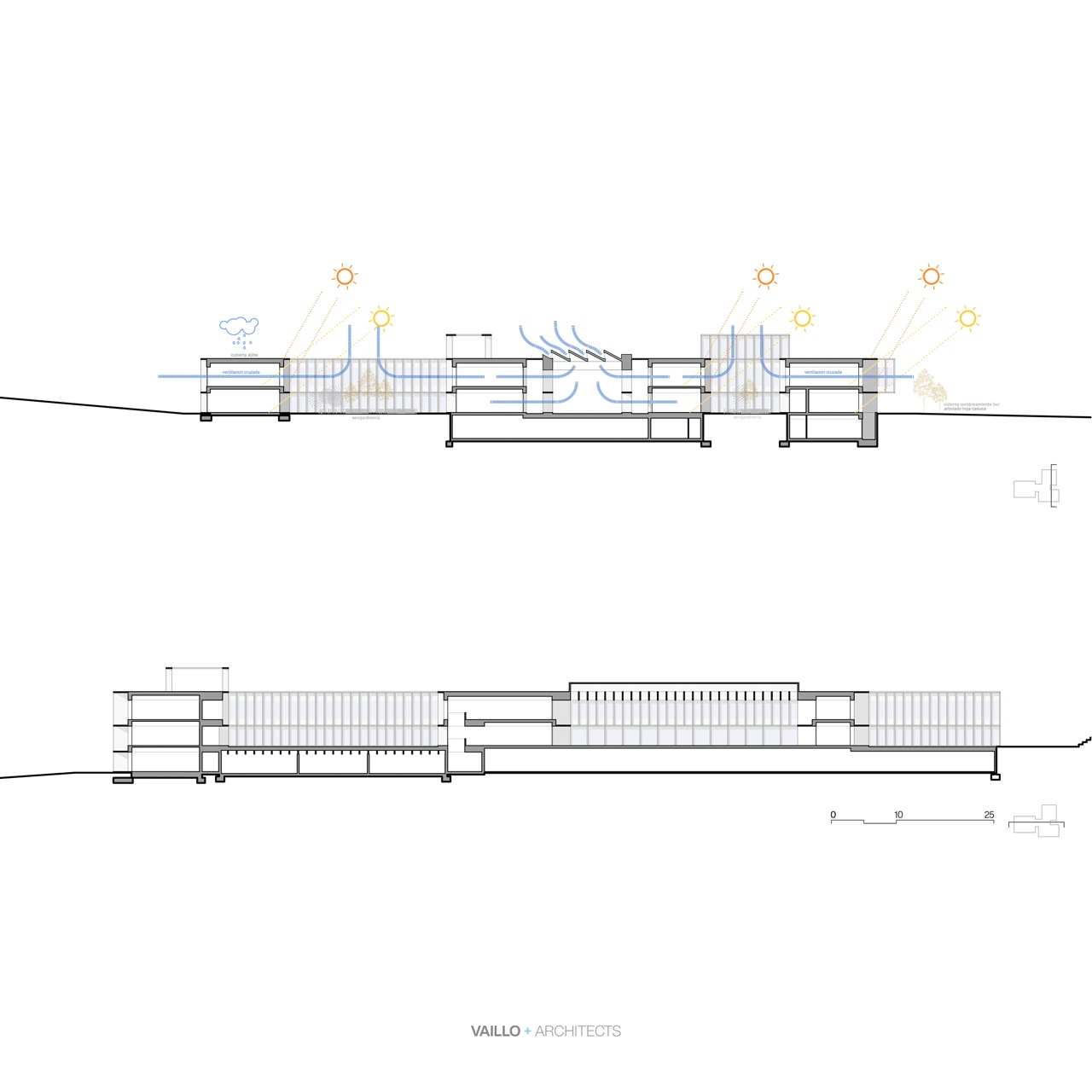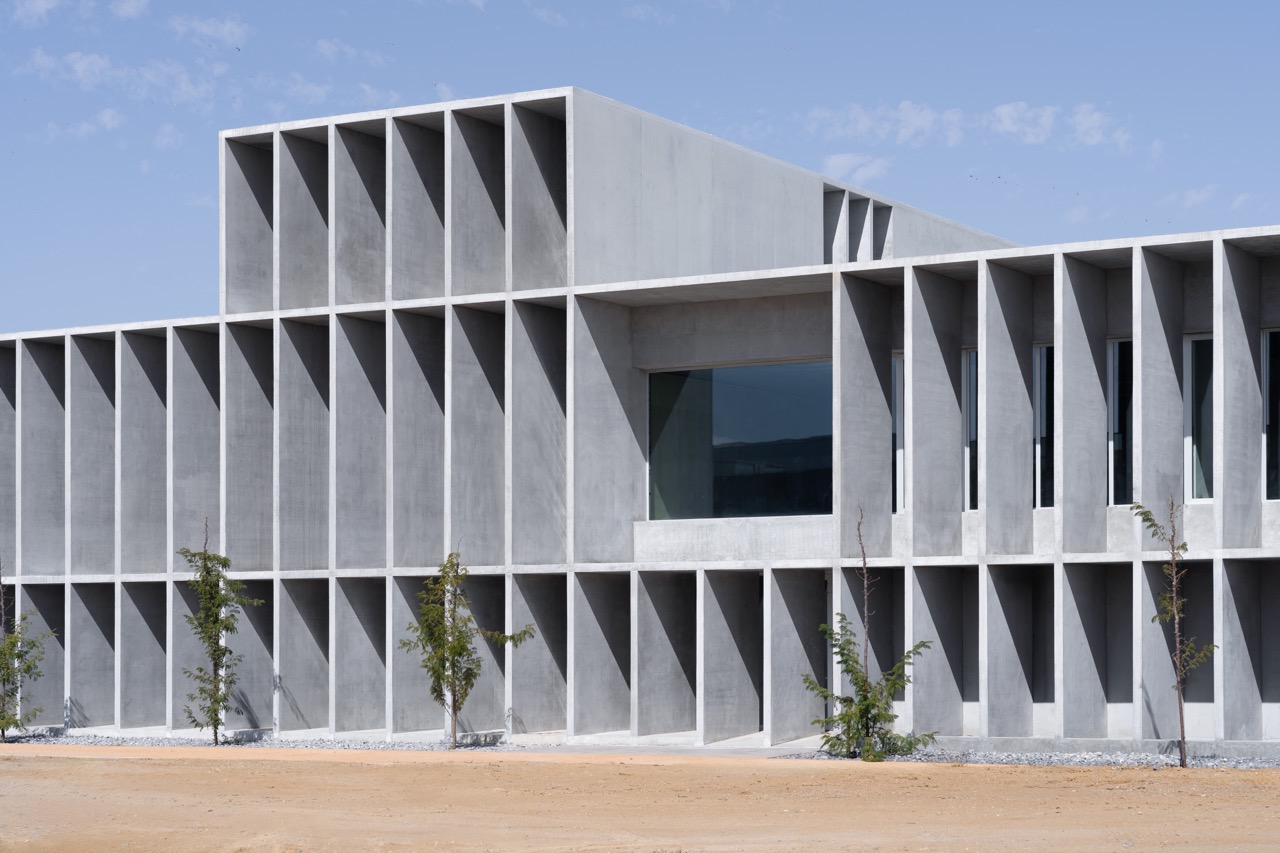 MATERIAL AND PLACE The building is conceived from a radical conceptual standpoint based on a unity of principles.The tectonic configuration is based on the exposed structure itself, and therefore the palette is minimalist, using locally sourced materials: local aggregates and cements for the concrete—hence its somewhat dark color; only plywood and glass act as infill for the concrete structure. The overall design is based on passive systems, seeking natural efficiency and sustainability, promoting structural elements that integrate functions: the structural facades act as large solar shading screens, modifying their depth and density according to their orientation. The courtyards and atrium act as thermal buffer spaces, allowing cross ventilation to moderate the interior temperatures. The landscaping is minimal, adapted to the current demands of extremely limited water resources—xeriscaping— using native species and permeable paving.