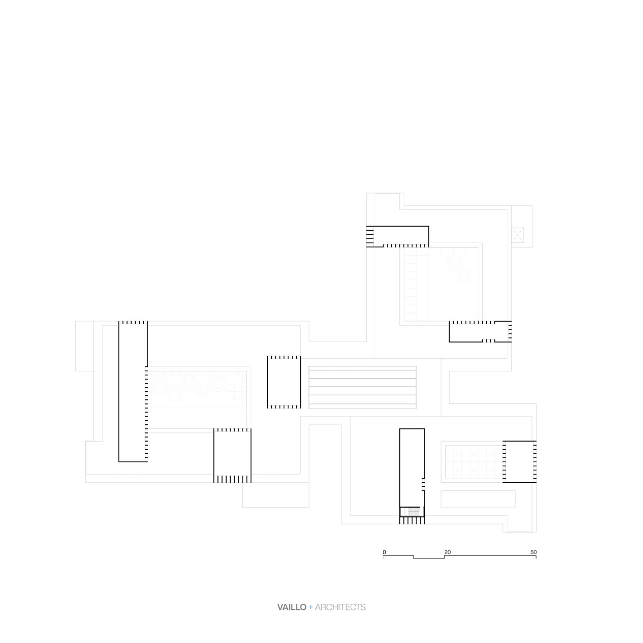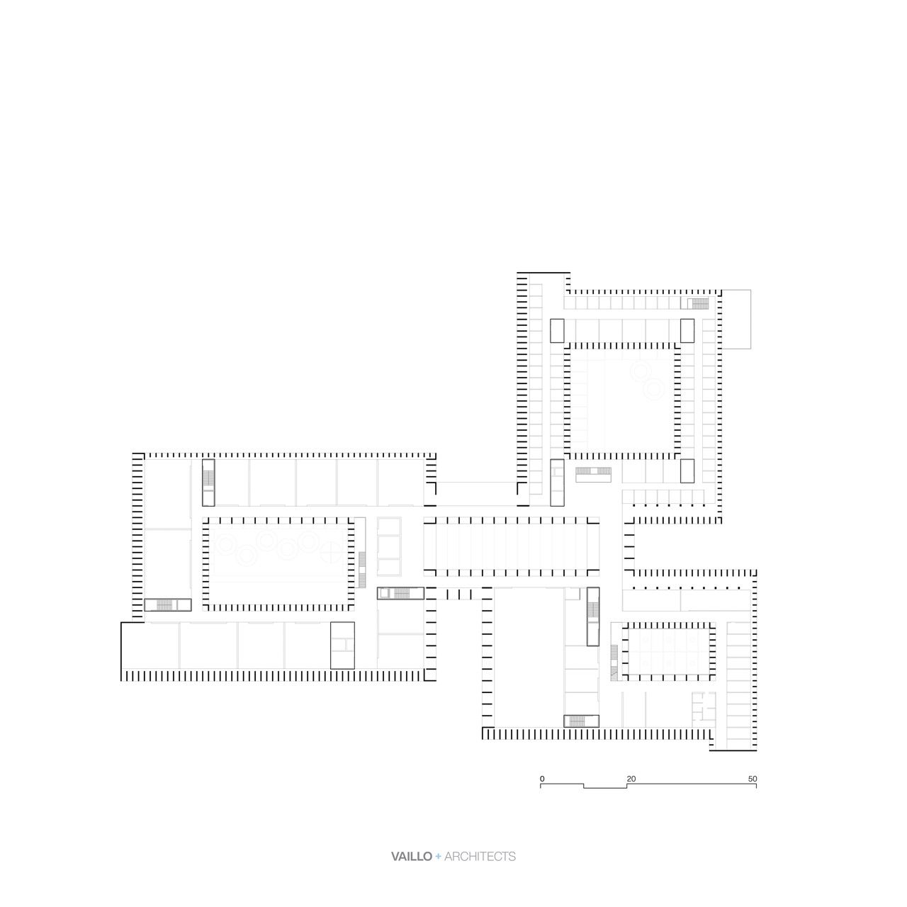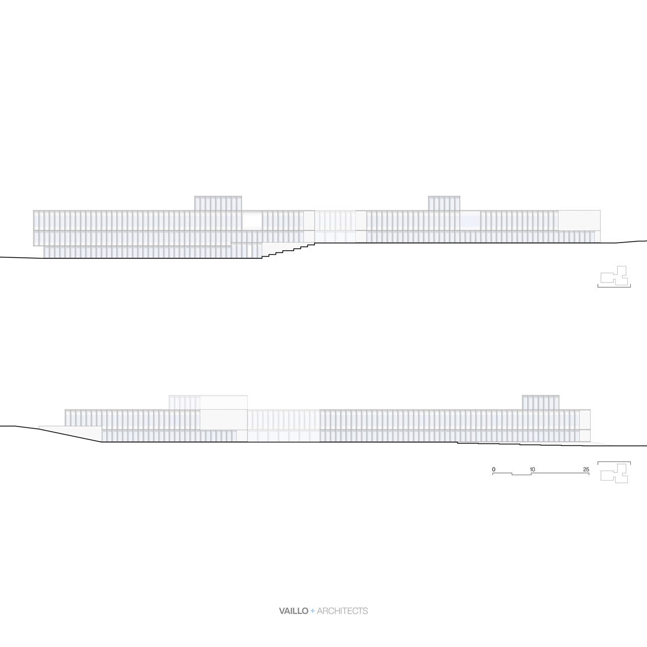 sections—15 cm thick.The structural design around the perimeter seeks maximum interior flexibility through the use of walls of varying depths and deep beams spanning large distances, allowing for multiple interior layouts capable of accommodating different uses and programs.