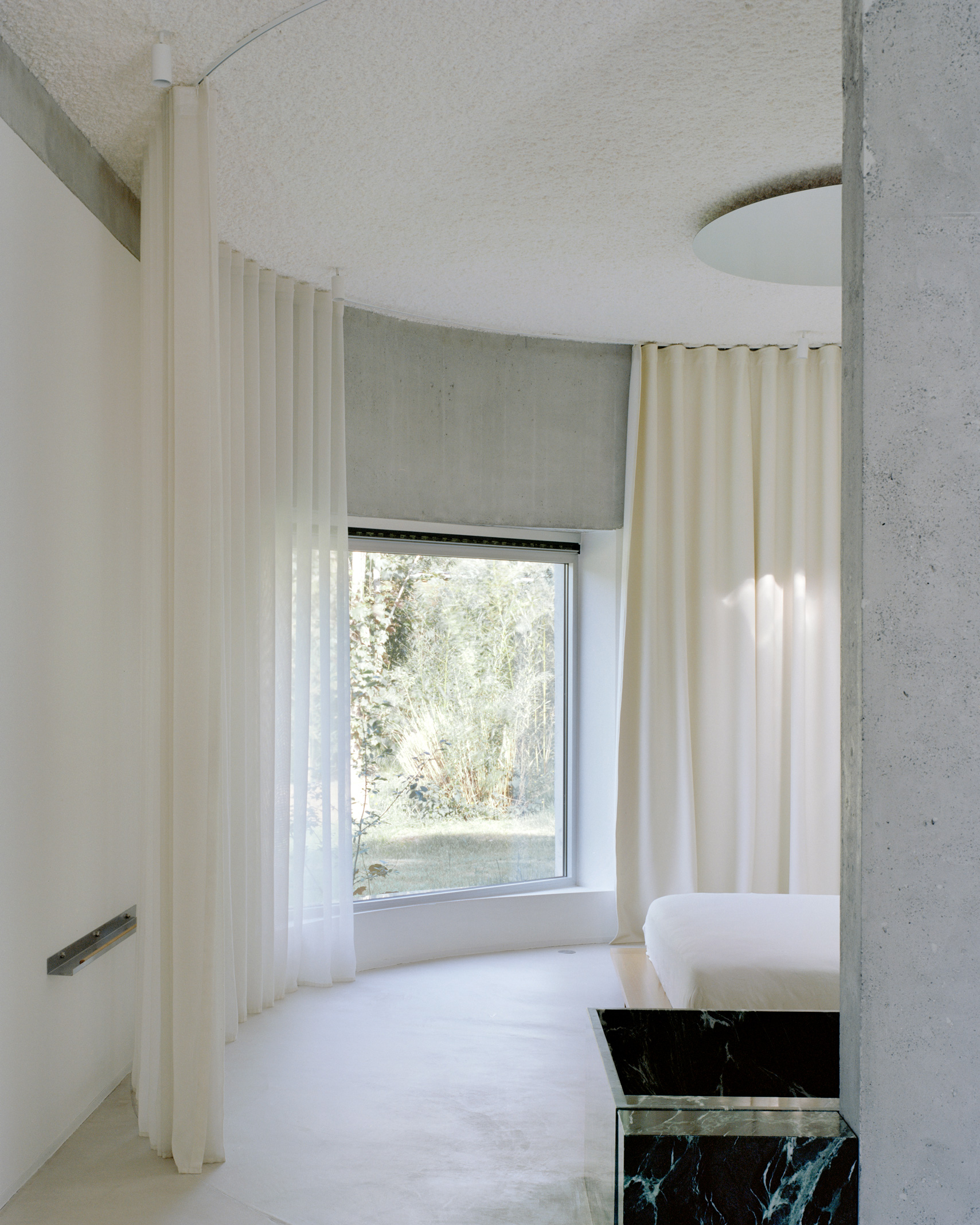 The structure is built using thermal blocks, without additional insulation. The exterior is finished with a lightly troweled cement render—unadorned, yet deliberate. The material expresses itself honestly, becoming the architecture. Inside, the spaces are open and fluid, comfortable without being ostentatious. The house responds to its environment quietly—embracing the slope, the climate, and its context with calm and coherence.