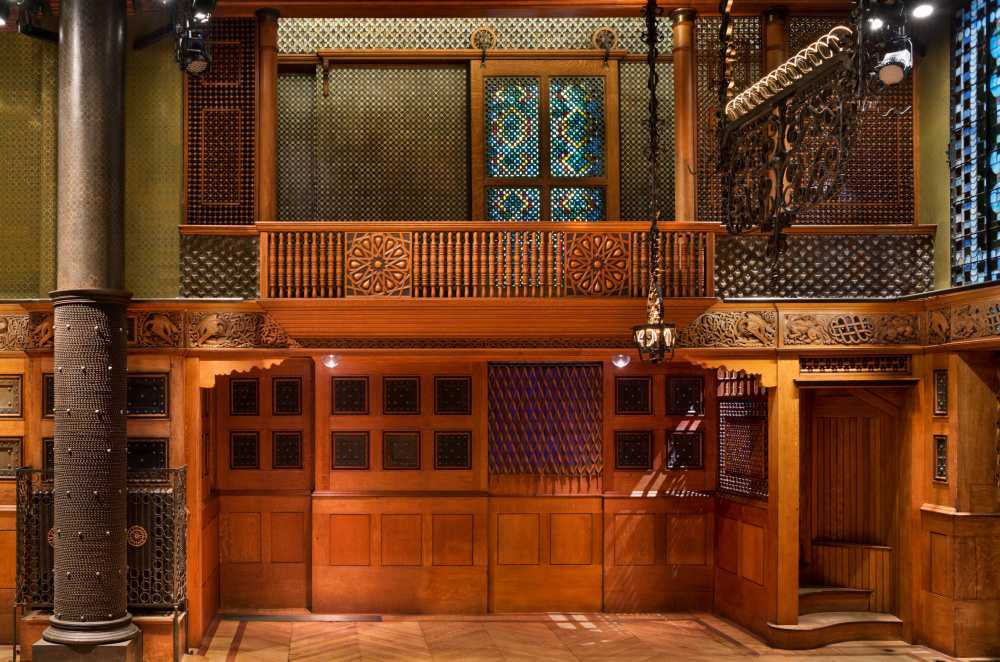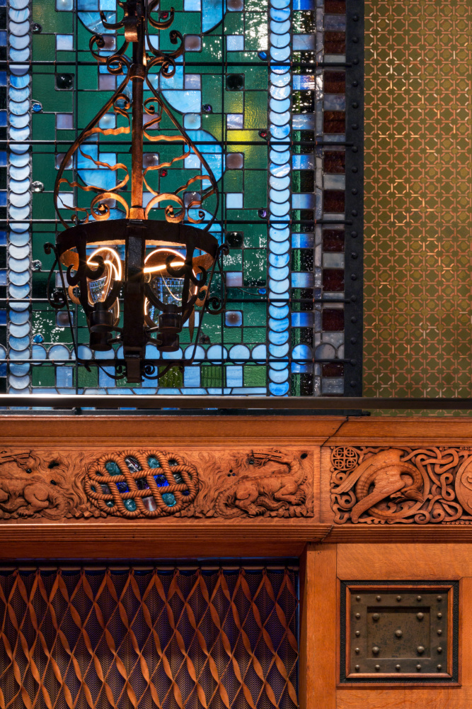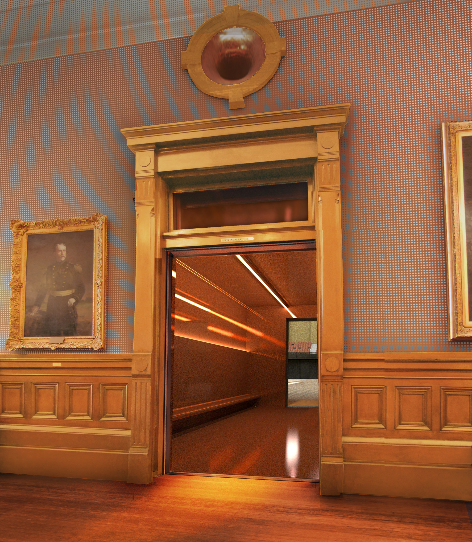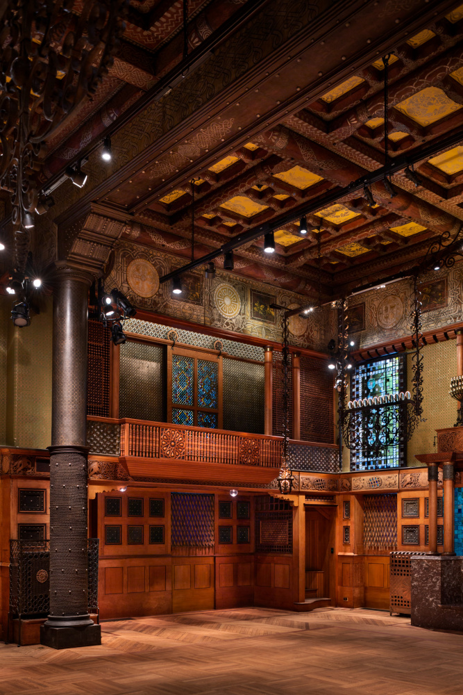 Instead of one blanket approach, we enlist a variety of methods and techniques that overlap and that work differently in each of the rooms. What ties the project together is the application of a same three-step procedure in each room: first, delayer to the original state as much as possible; second, stabilize the room along with the damaged areas: and third, reinforce and refurbish the room so that it best retains its (original) character. This may mean overprinting a wall with an integrated tracery to unify a damaged surface, developing specific light fixtures or furnishings to bring back the volumetric character of a room, or reconstructing an element that has been lost using the syntax of a different material or technique. As a unifying element, we accentuated the metallic aspect of the Armory. Metallic paints were developed around 1880 and reveals show that they were used extensively throughout the building. Since metal oxidizes with time, the patterns and architectural details have dulled and their effects are no longer visible. We reintroduce these effects and find different ways of implementing them. Copper is used because it can be reflective or matte, has a rich color range from a light copper sheen to almost black, ages very gracefully, and can be a textile, a coating, or a metal. This diversity means that it can be very inconspicuous.