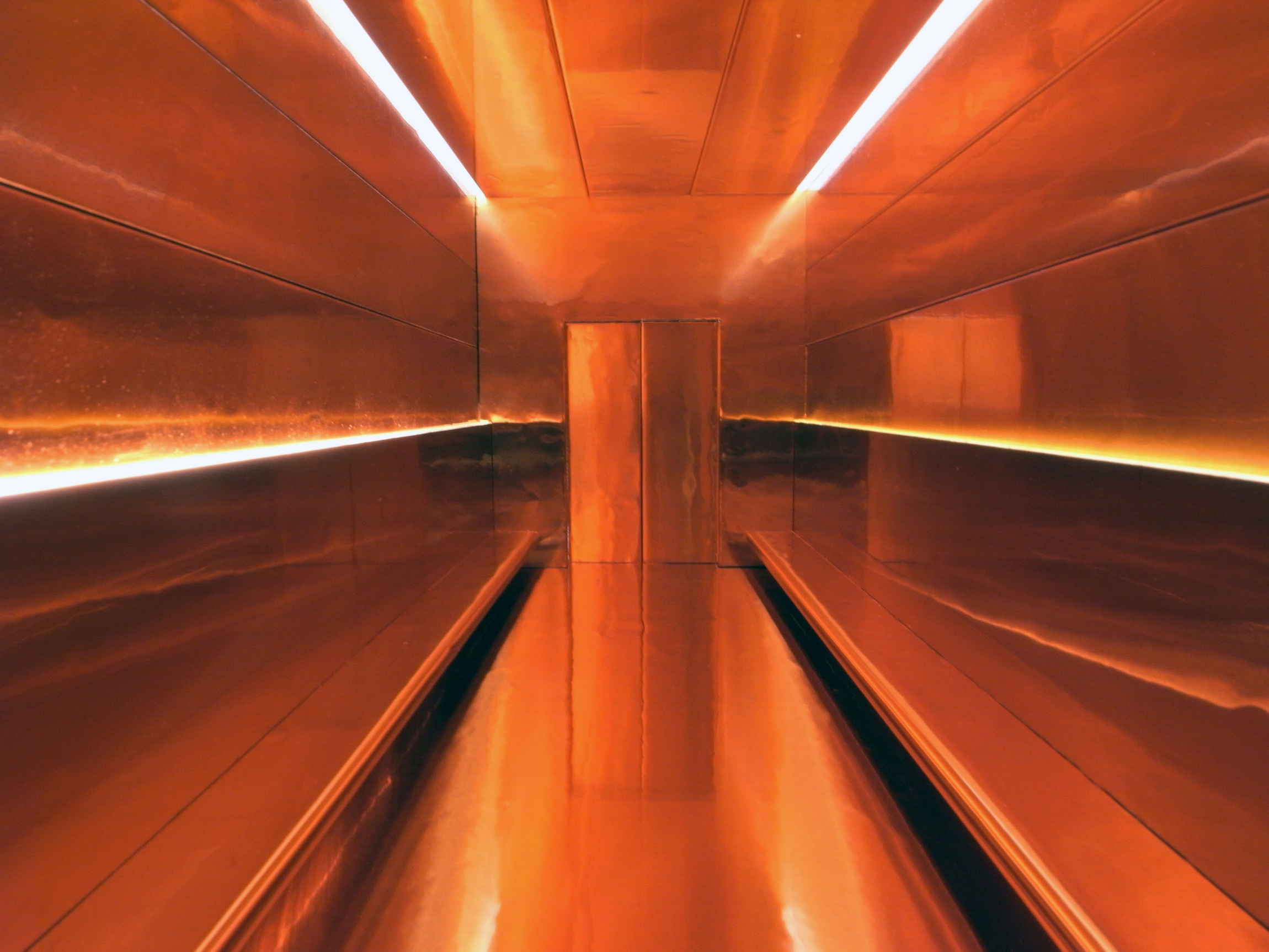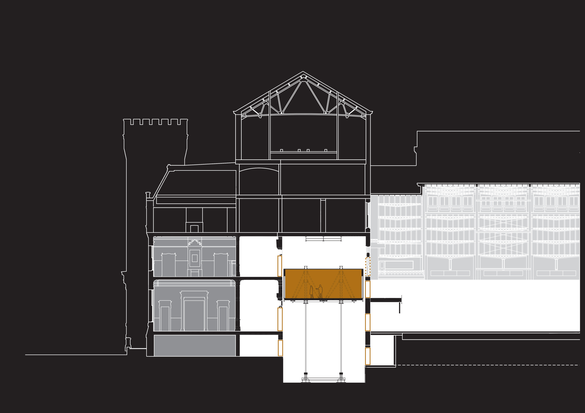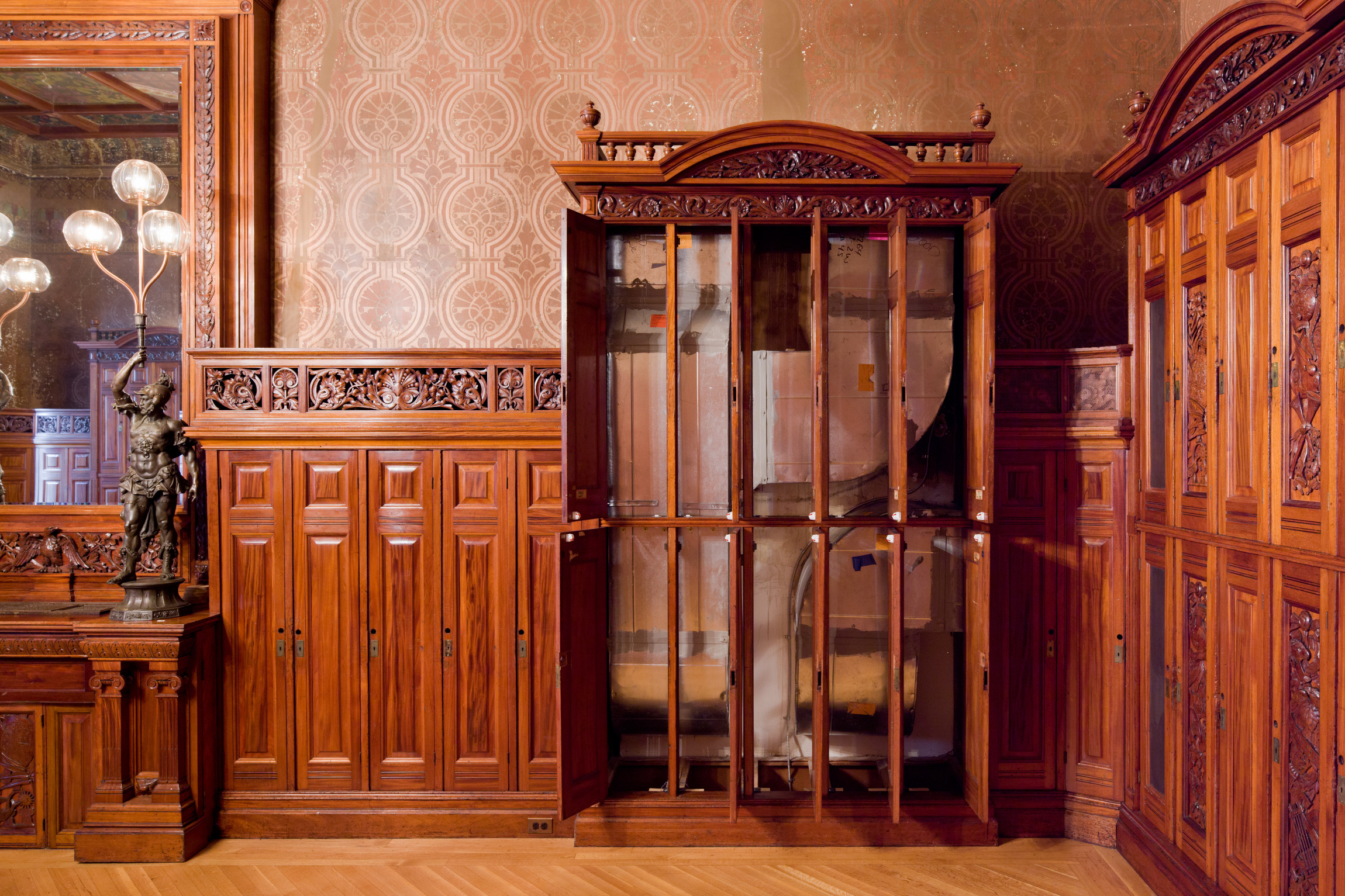 Instead of one blanket approach, we enlist a variety of methods and techniques that overlap and that work differently in each of the rooms. What ties the project together is the application of a same three-step procedure in each room: first, delayer to the original state as much as possible; second, stabilize the room along with the damaged areas: and third, reinforce and refurbish the room so that it best retains its (original) character. This may mean overprinting a wall with an integrated tracery to unify a damaged surface, developing specific light fixtures or furnishings to bring back the volumetric character of a room, or reconstructing an element that has been lost using the syntax of a different material or technique. As a unifying element, we accentuated the metallic aspect of the Armory. Metallic paints were developed around 1880 and reveals show that they were used extensively throughout the building. Since metal oxidizes with time, the patterns and architectural details have dulled and their effects are no longer visible. We reintroduce these effects and find different ways of implementing them. Copper is used because it can be reflective or matte, has a rich color range from a light copper sheen to almost black, ages very gracefully, and can be a textile, a coating, or a metal. This diversity means that it can be very inconspicuous.