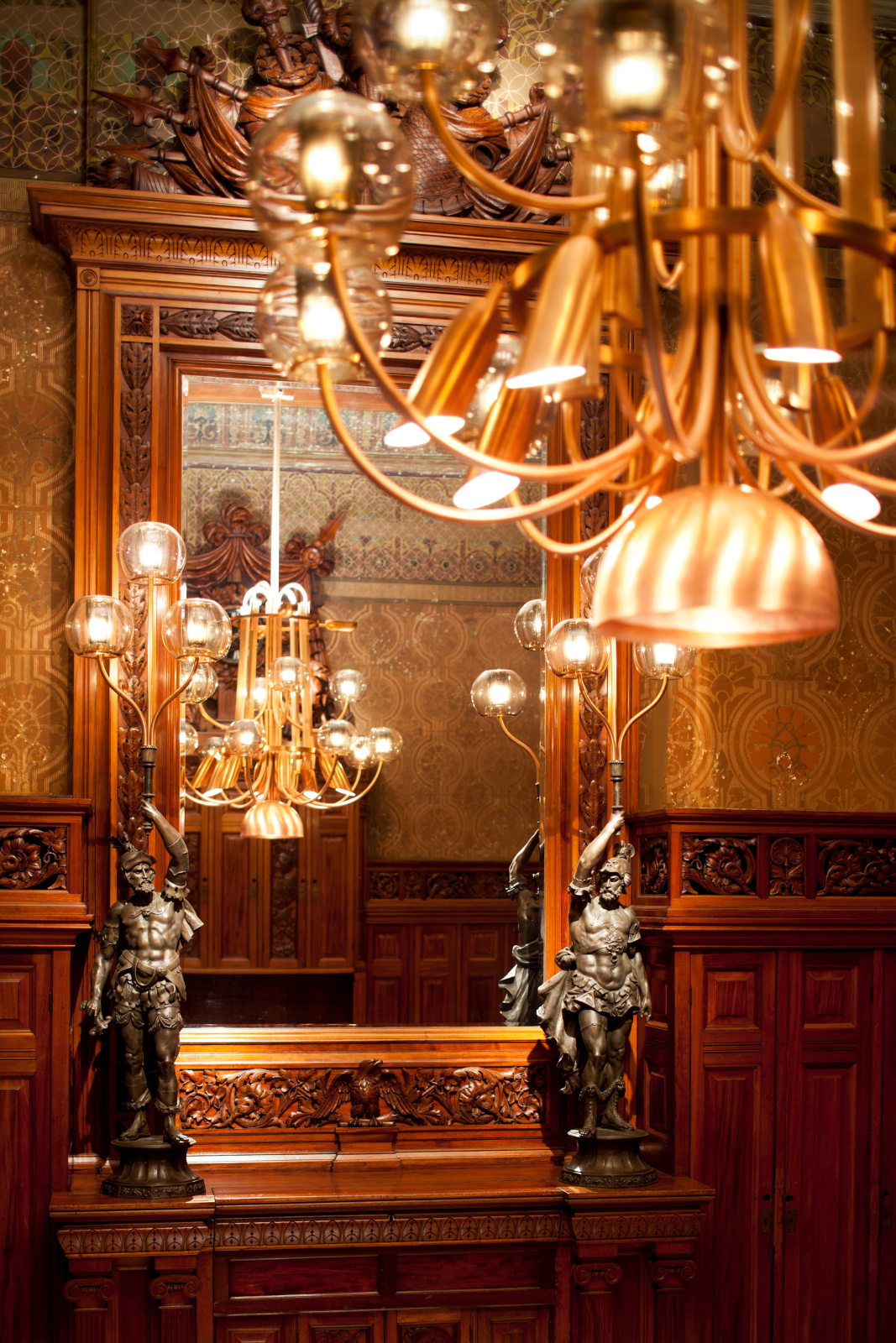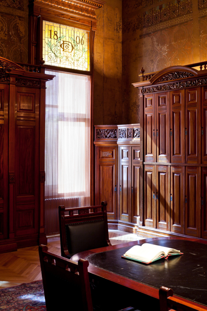 The interiors were originally illuminated by gaslight and extremely dark, so additional lighting is a key factor in reinventing each room. Not only more light but also the placement of light fixtures and how they relate to the rest of the room are important factors in reviving a room’s character. Therefore we aim to reinstate chandeliers and light fixtures in scale and function, but translated into a contemporary idiom. In Company D, we wanted to highlight the central position of the 1880 chandelier as well as its organic character. Simple copper tubes are bundled, following the path of wiring, while new lamps added to the top, bottom, and sides relate to specific lighting functions. The result is a compact form that is comparable to the scrollwork of the original. Custom glass globes diffuse the light, lending it a subtle warmth reminiscent of gaslight. In the Board of Officers Room, as early as 1897, the gas lighting was replaced by electric chandeliers and wall brackets of forged iron, which are hung at a higher level and are weightier in effect than the original ones. The 1897 chandeliers and sconces were cleaned and fitted with contemporary light sources integrated in custom glass globes hung at the original levels.