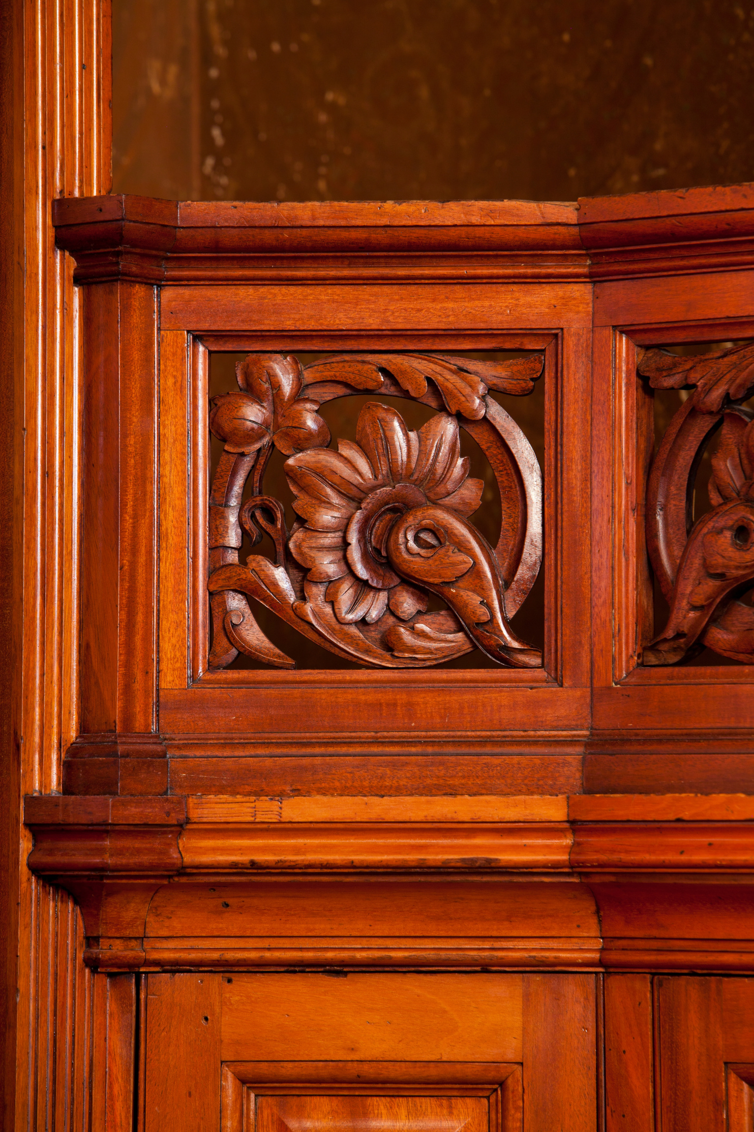 We started our surface investigations by carefully distinguishing between floor, woodwork, wall, frieze, cove, and ceiling. Our aim is to reveal the original layer of 1880 and, at the same time, preserve the raw atmosphere that struck us the first few times we visited. In the process of delayering surfaces, we ask ourselves what defines the character of the respective room with the aim of developing a specific treatment strategy for each surface. The Board of Officers Room was in deplorable condition. On the outer walls and in the corners of the ceiling, large areas of the paint had peeled away due to water damage, and extensive areas of the ceiling had been anchored to prevent further loss. By revealing original layers where possible and reinterpreting the original design in the damaged areas, we were able to reconstitute the 1880 decorative scheme. The 1932 wall decor was removed to reveal the original campaign. The damaged areas were filled with field color and the lost patterns were reinstated by means of integrated tracery.
