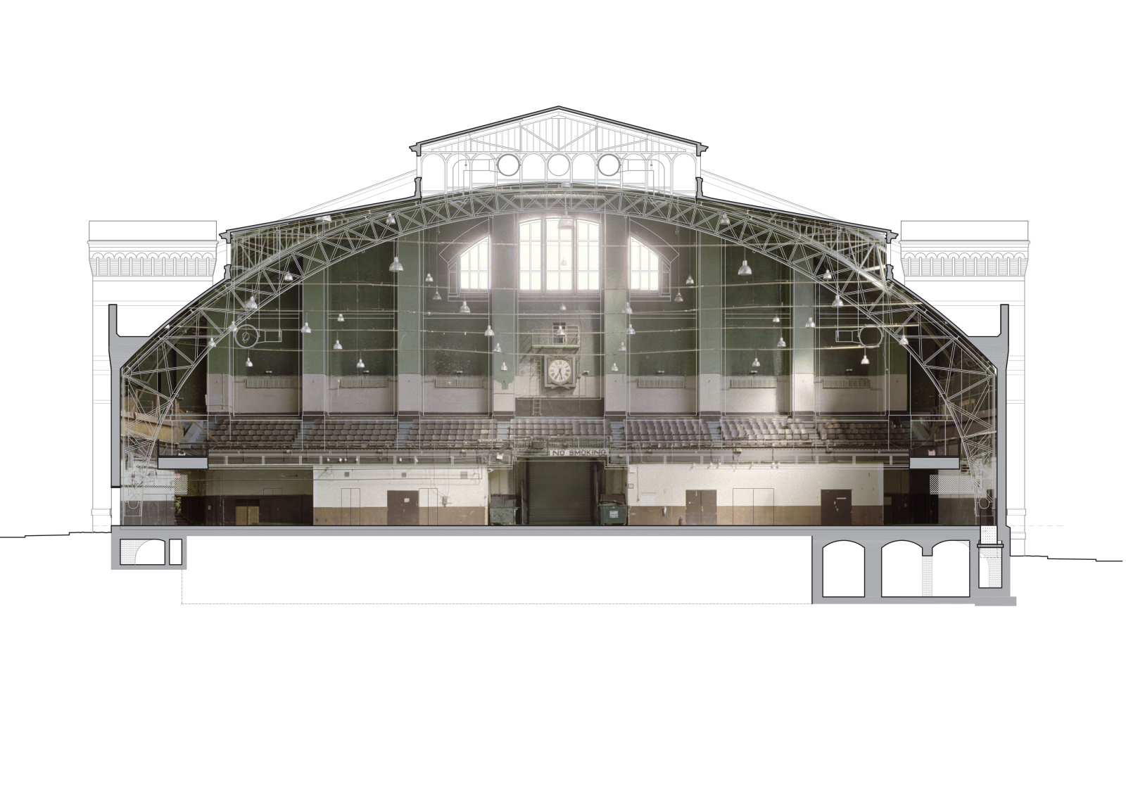 In contrast to the explicit emphasis on surface in the rooms of the head house, the massive interior of the drill hall is pure structure and requires a different syntax. Since the program calls for a flexible space, we designed it as a gigantic stage and equipped it with a new infrastructure. The drill hall’s grand proportions will be reinforced by reducing it to the bare essentials.
